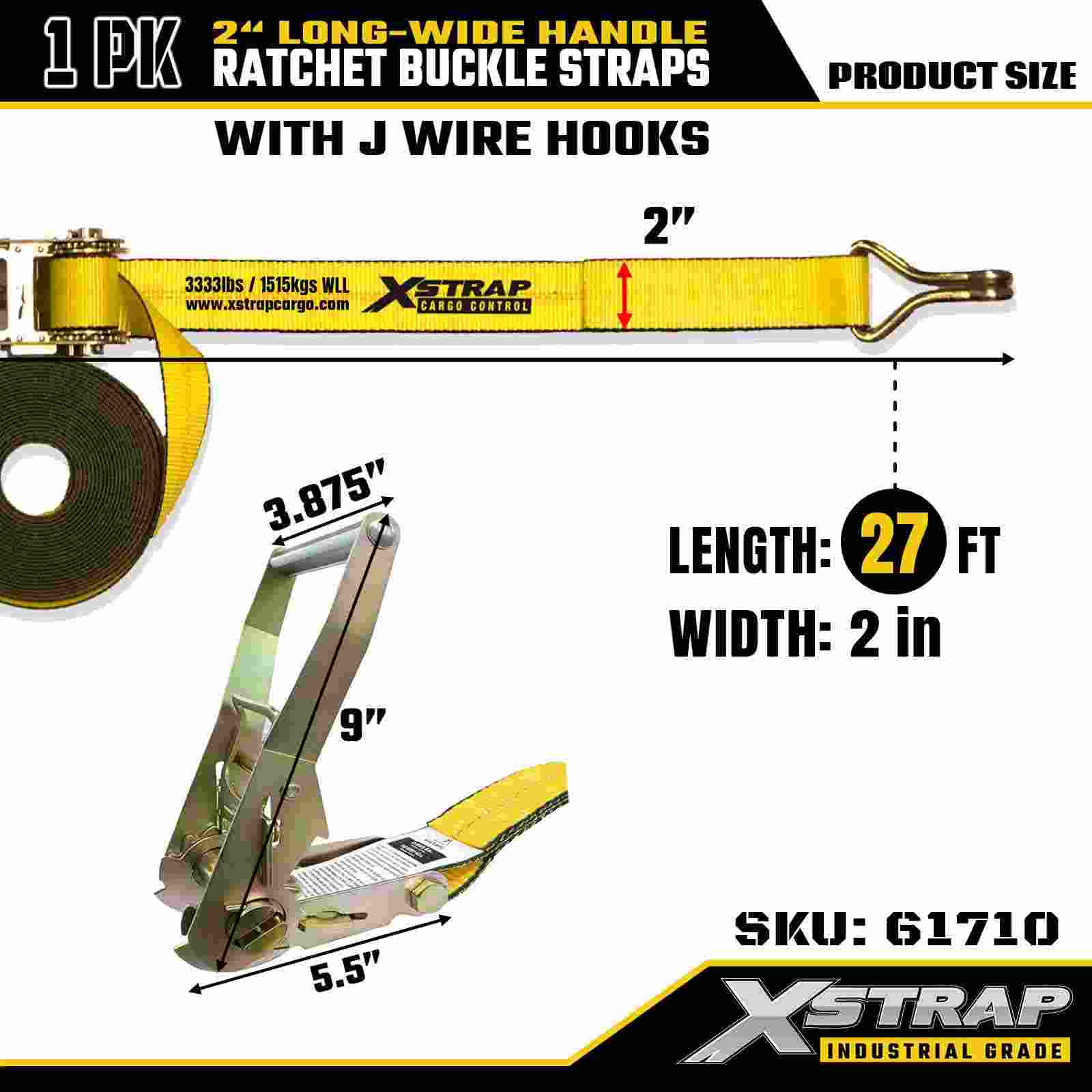 Xstrap 61710 Wysokiej jakości zapadka do mocowania 2" x 27 stóp (1 opakowanie), wytrzymałość na zerwanie 10000 LBS Paski cargo z podwójnym haczykiem w kształcie litery J, idealne do przenoszenia urządzeń, sprzętu do pielęgnacji trawników i motocykli