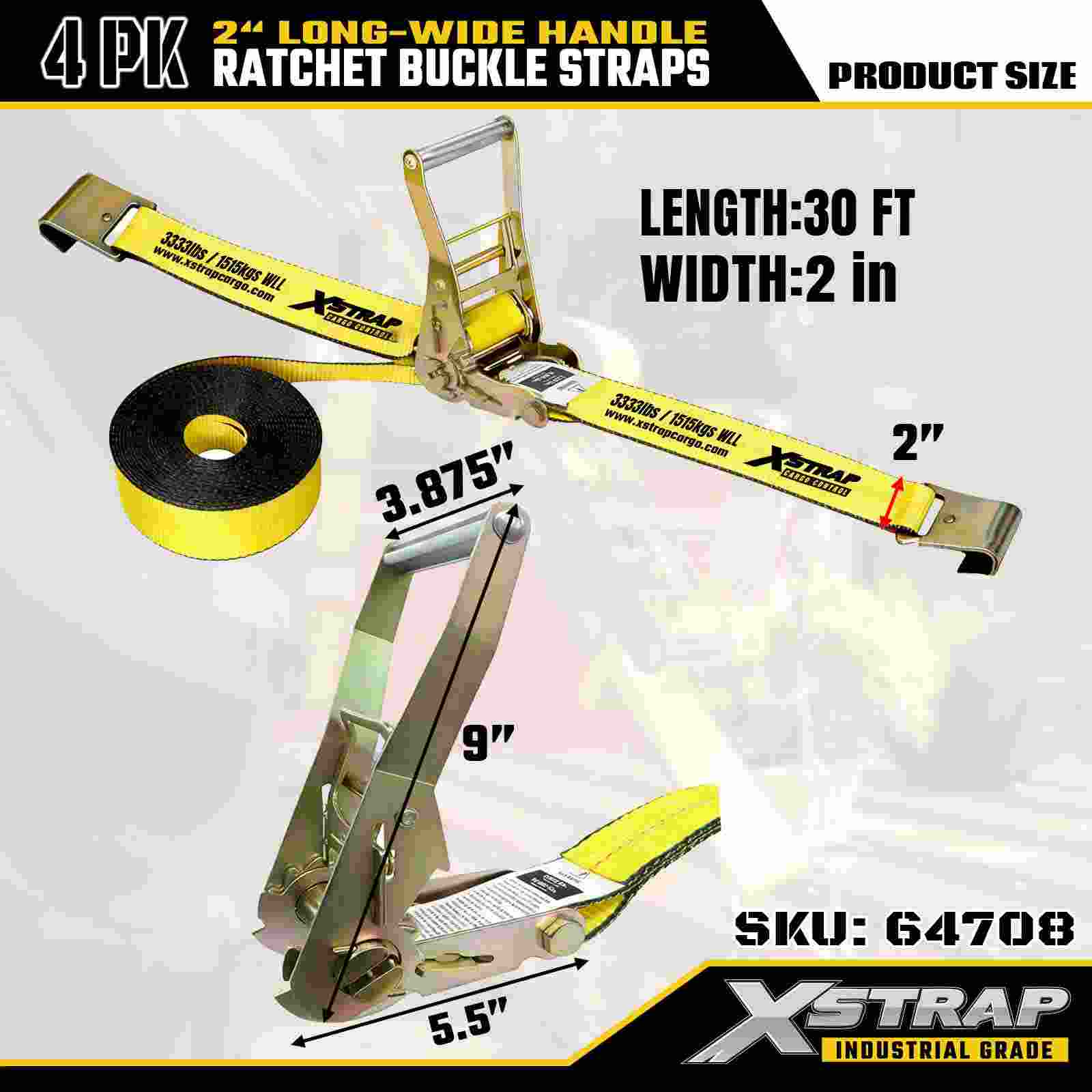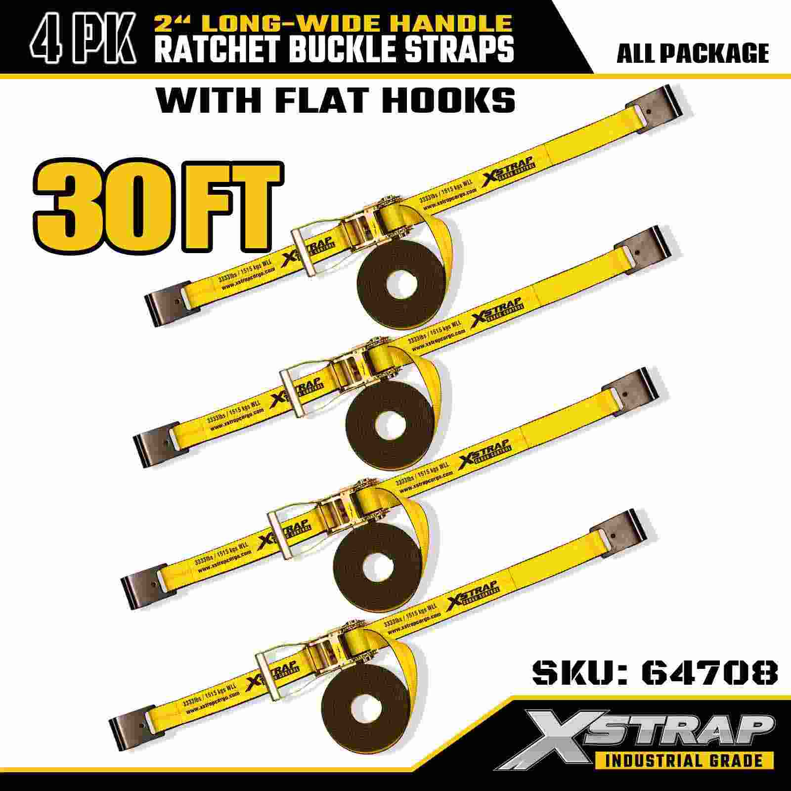 Xstrap 64708 Paski z klamrą zapadkową o długości 2" x 30 stóp (4 szt.) – płaskie haczyki, wytrzymałość znamionowa 10 000 funtów, rozwiązanie do kontroli ładunku przemysłowego