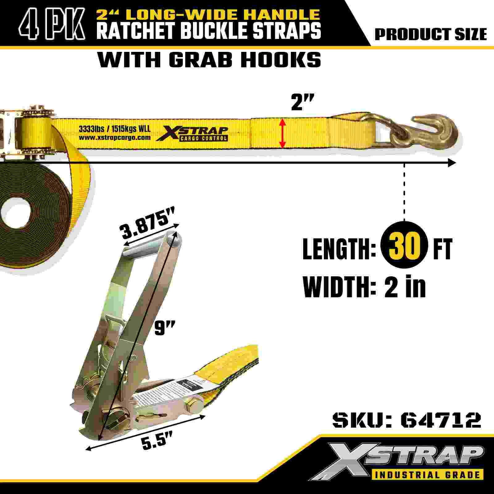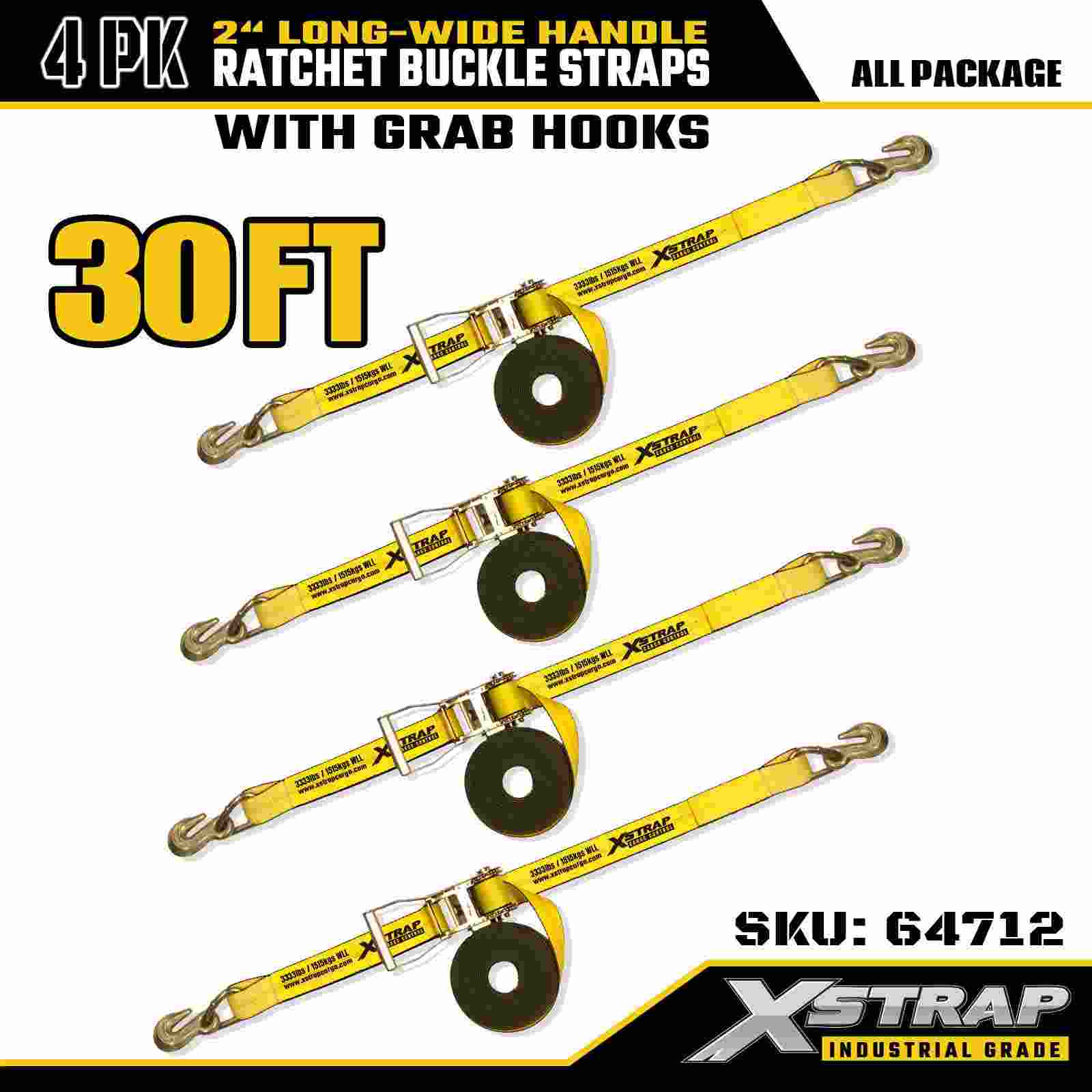 Xstrap 64712 Paski z klamrą zapadkową o długości 2" x 30 stóp (4 szt.) – haki do chwytania, udźwig 10 000 funtów, wytrzymałe mocowanie do transportu dużego sprzętu