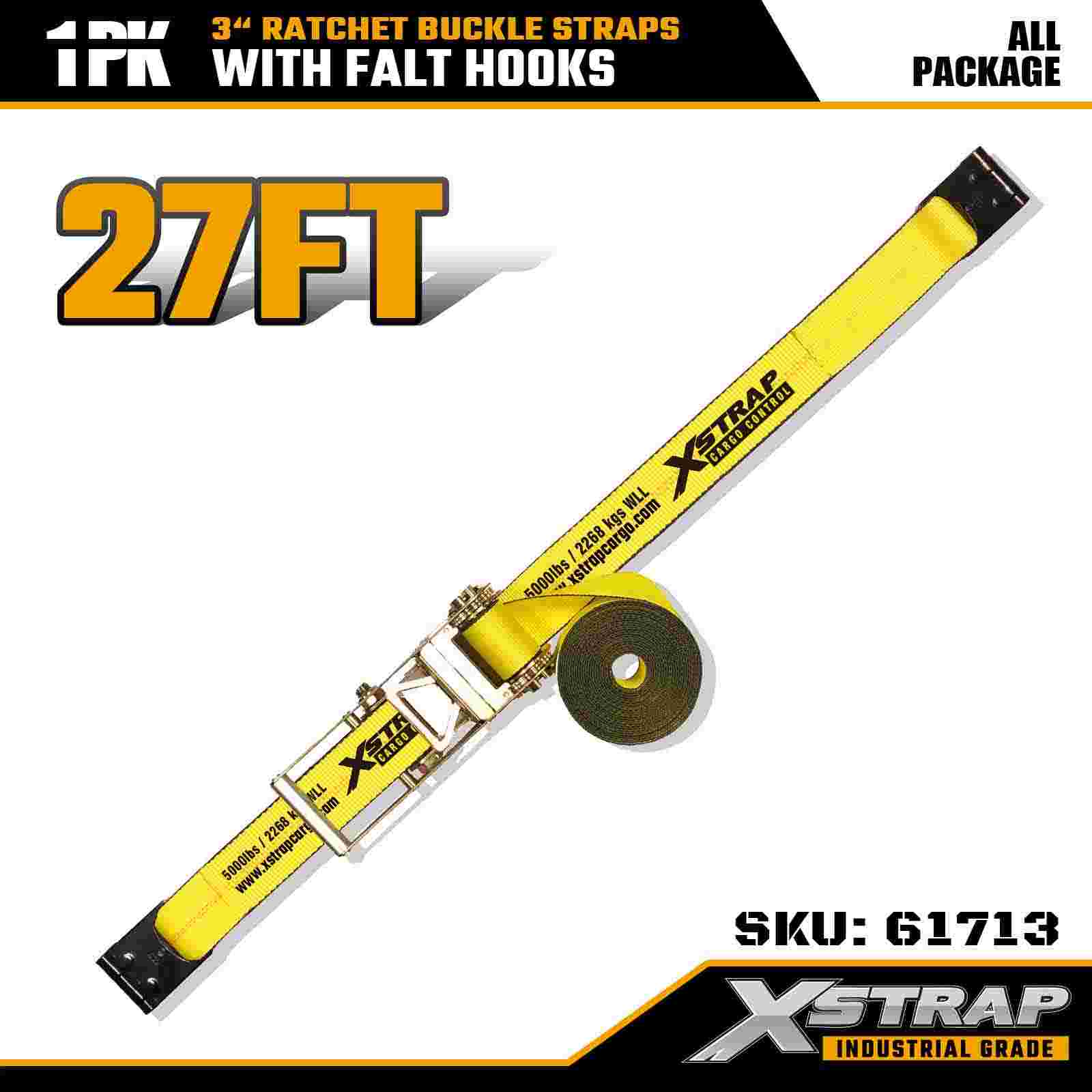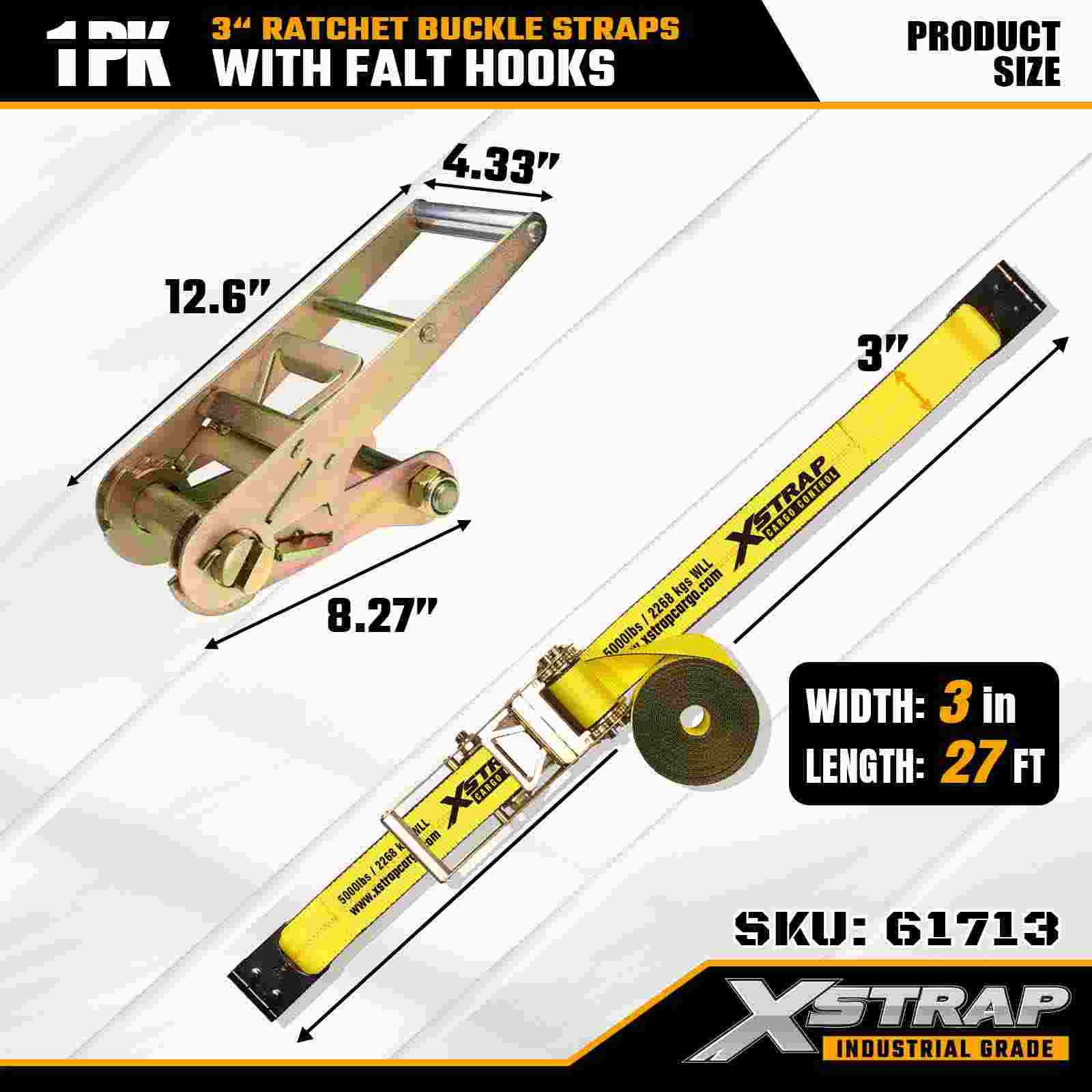 Xstrap 61713 Paski z klamrą zapadkową o wymiarach 3" x 27 stóp (1 szt.) Płaskie haczyki, nośność 5000 funtów Wytrzymałość na zrywanie 15 000 funtów, wytrzymałe mocowania do samochodów ciężarowych, przyczep i ładunków przemysłowych.