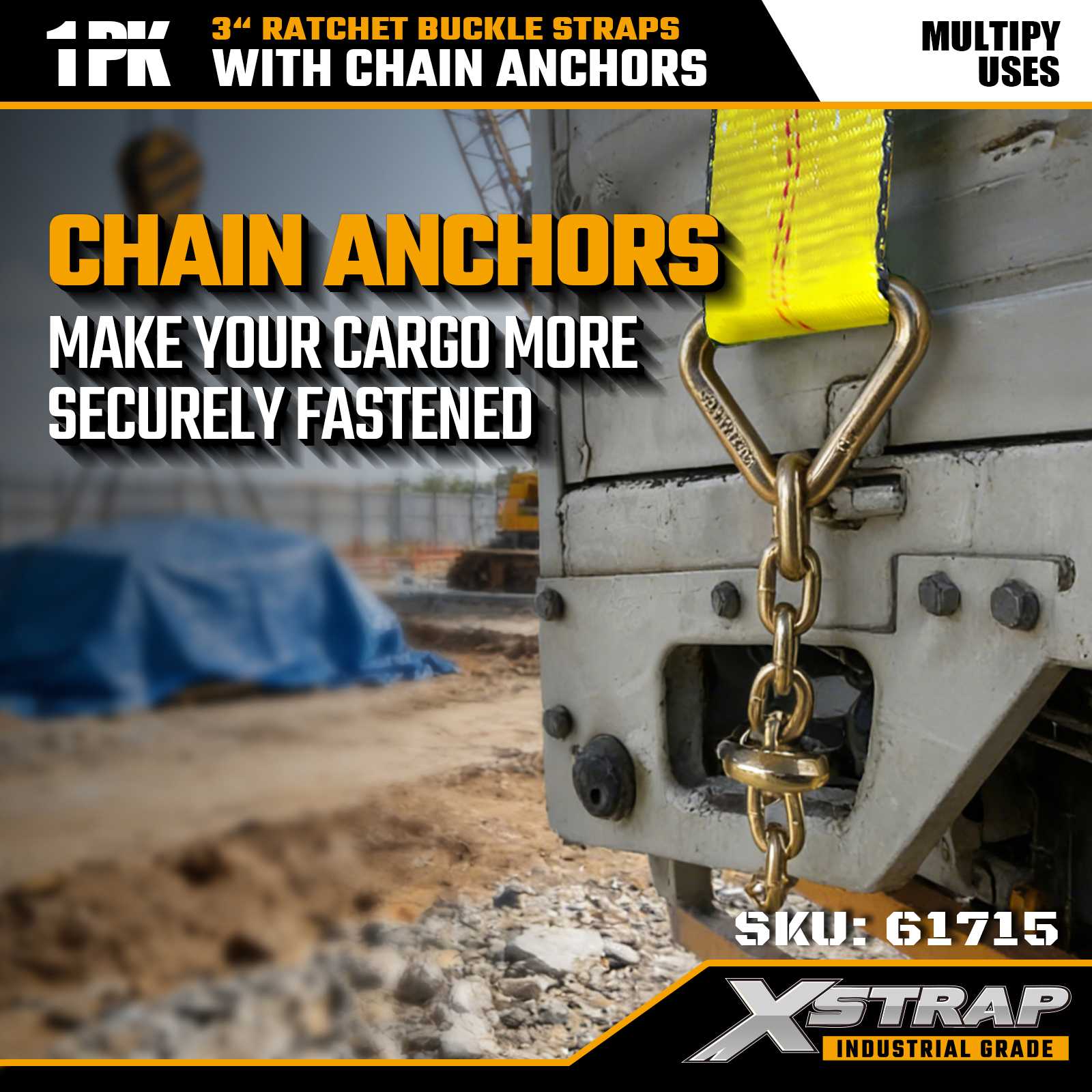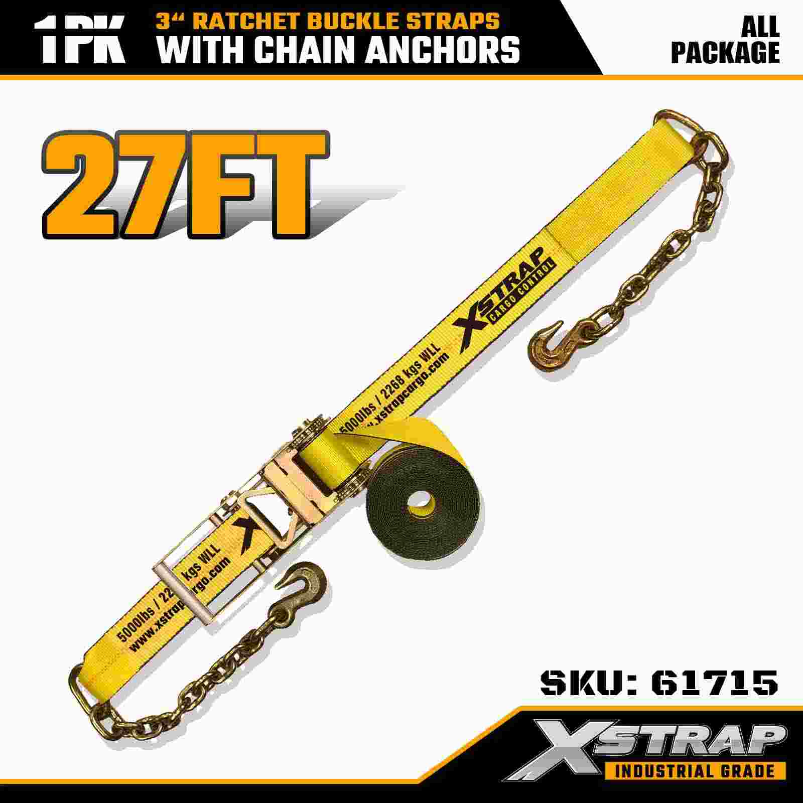 Xstrap 61715 Paski z klamrą zapadkową o wymiarach 3" x 27 stóp (1 szt.) - kotwice łańcuchowe, nośność 5000 funtów, wytrzymałość na zerwanie 15 000 funtów. Zaprojektowane do kontroli ładunków ciężkich, pasy te łączą taśmę klasy przemysłowej z końcami kotwiącymi łańcucha, co zapewnia maksymalne bezpieczeństwo w ciężarówkach, przyczepach i transporcie budowlanym.