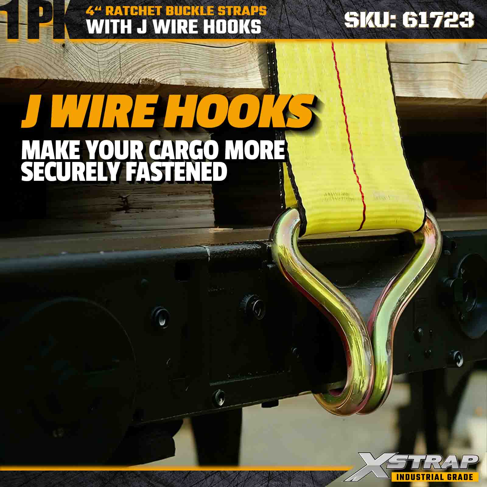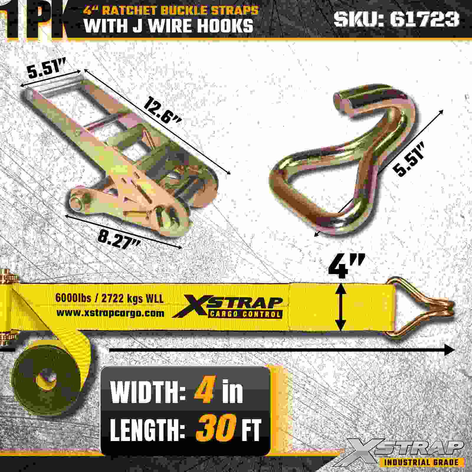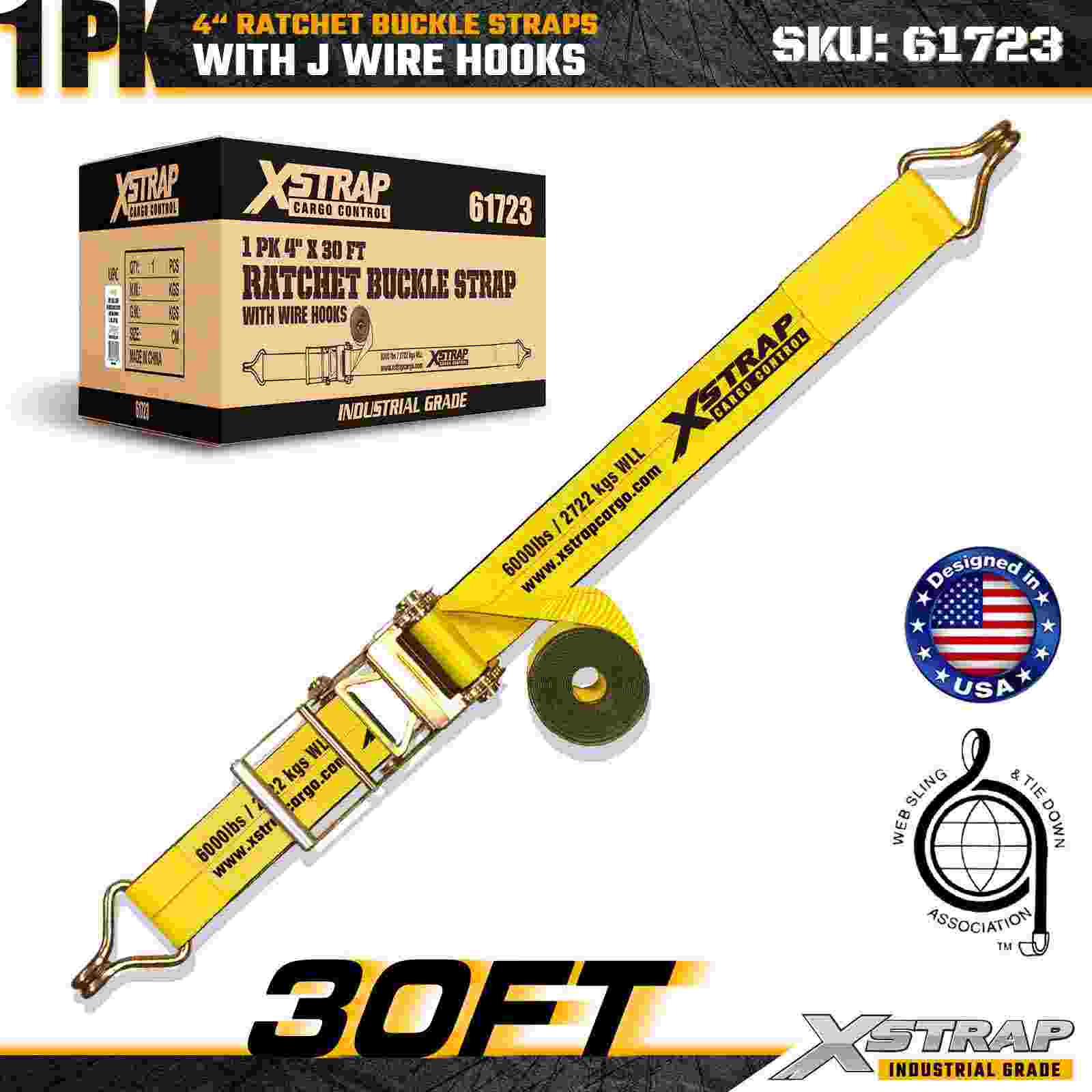Pasek z klamrą zapadkową Xstrap 61723 o wymiarach 4" × 30 stóp (1 szt.) przeznaczony jest do mocowania ciężkich ładunków, wyposażony w wzmocnione haki druciane i trwały mechanizm zapadkowy. Dzięki dopuszczalnemu obciążeniu roboczemu 6000 funtów i wytrzymałości na zerwanie 18 000 funtów ten pas idealnie nadaje się do transportu platform, transportu maszyn, drewna, ładunków stalowych i ładunków przemysłowych.
