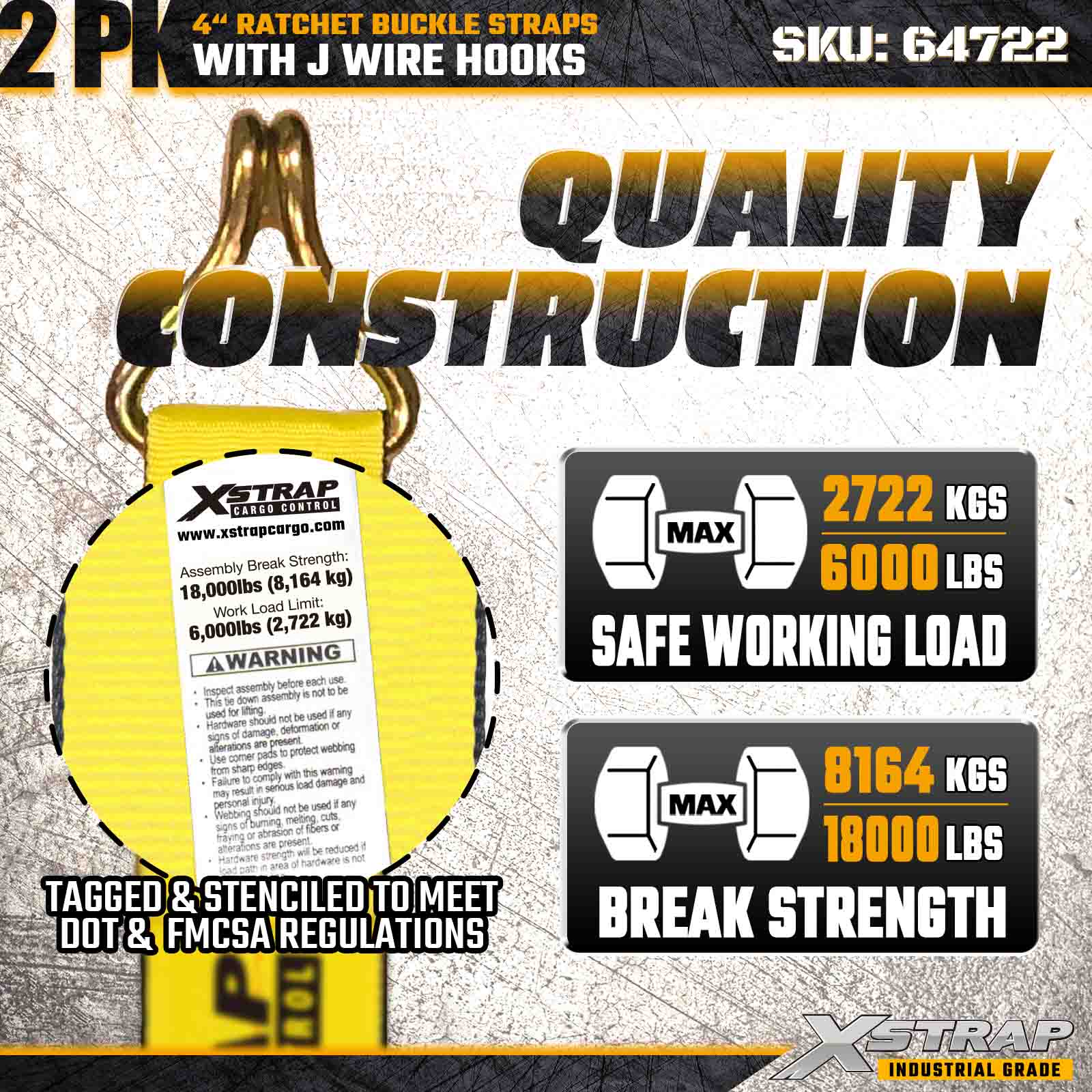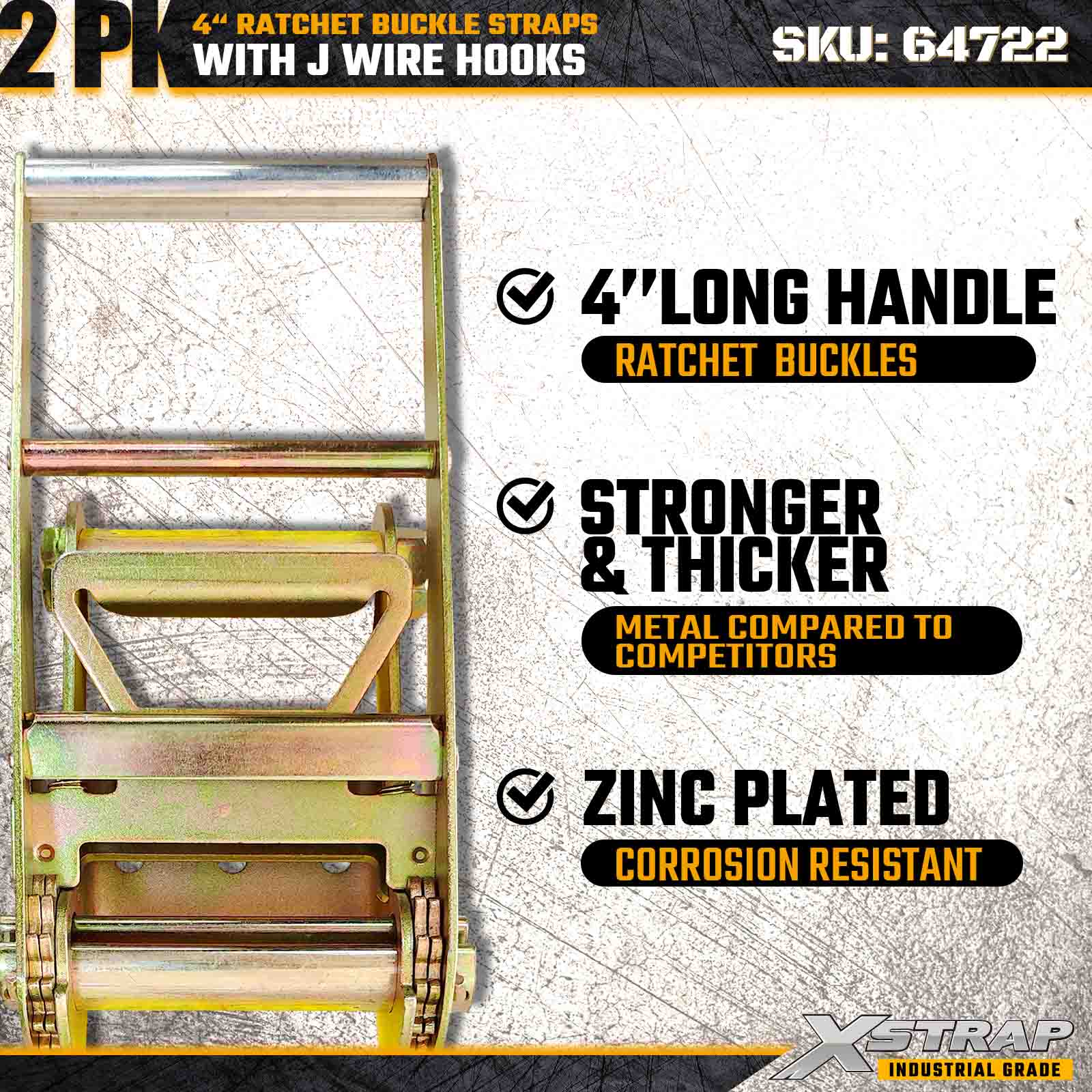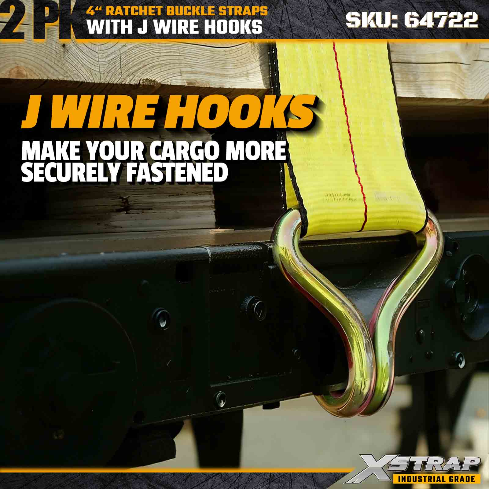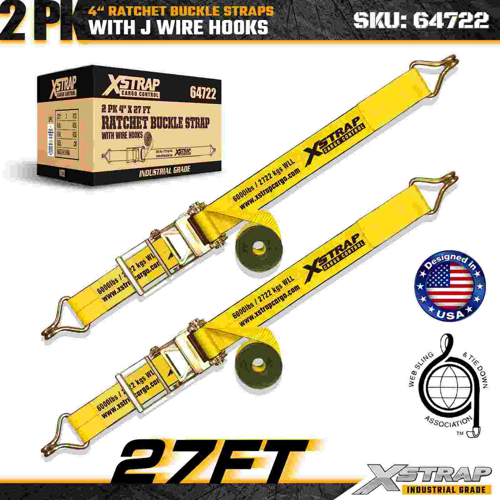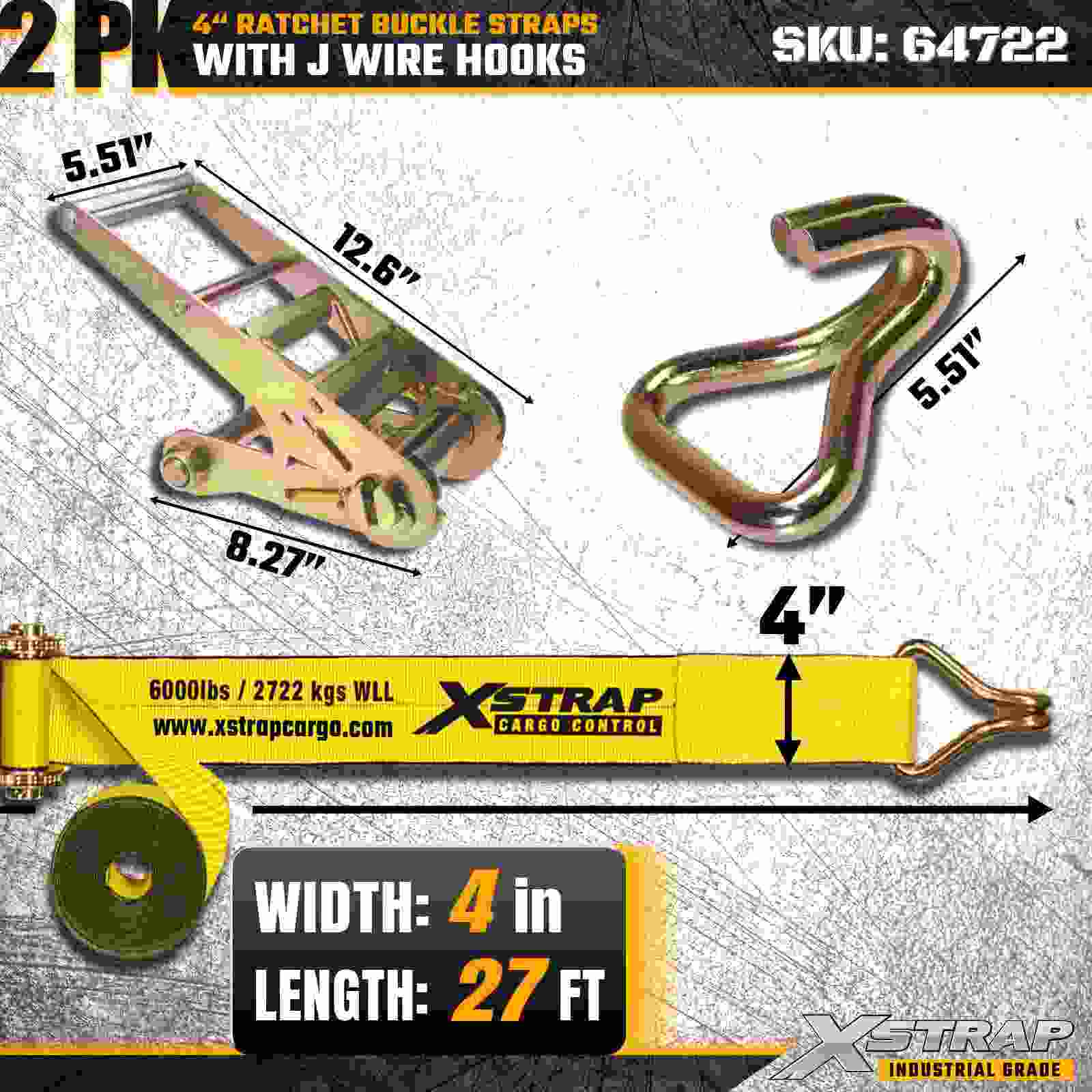 Pasy z klamrą zapadkową Xstrap 64722 o wymiarach 4" × 27 stóp (2 szt.) są przeznaczone do mocowania ciężkich ładunków i wyposażone w wzmocnione haki druciane i trwały mechanizm zapadkowy. Dzięki dopuszczalnemu obciążeniu roboczemu 6000 funtów i wytrzymałości na zerwanie 18 000 funtów pasy te idealnie nadają się do transportu platform, transportu maszyn, drewna, ładunków stalowych i ładunków przemysłowych.