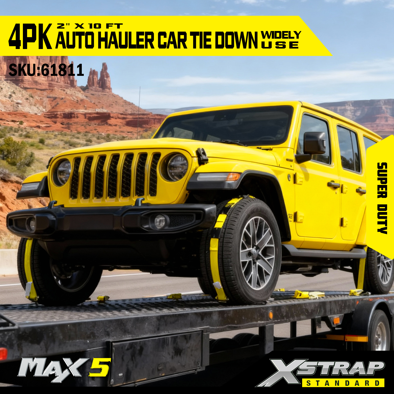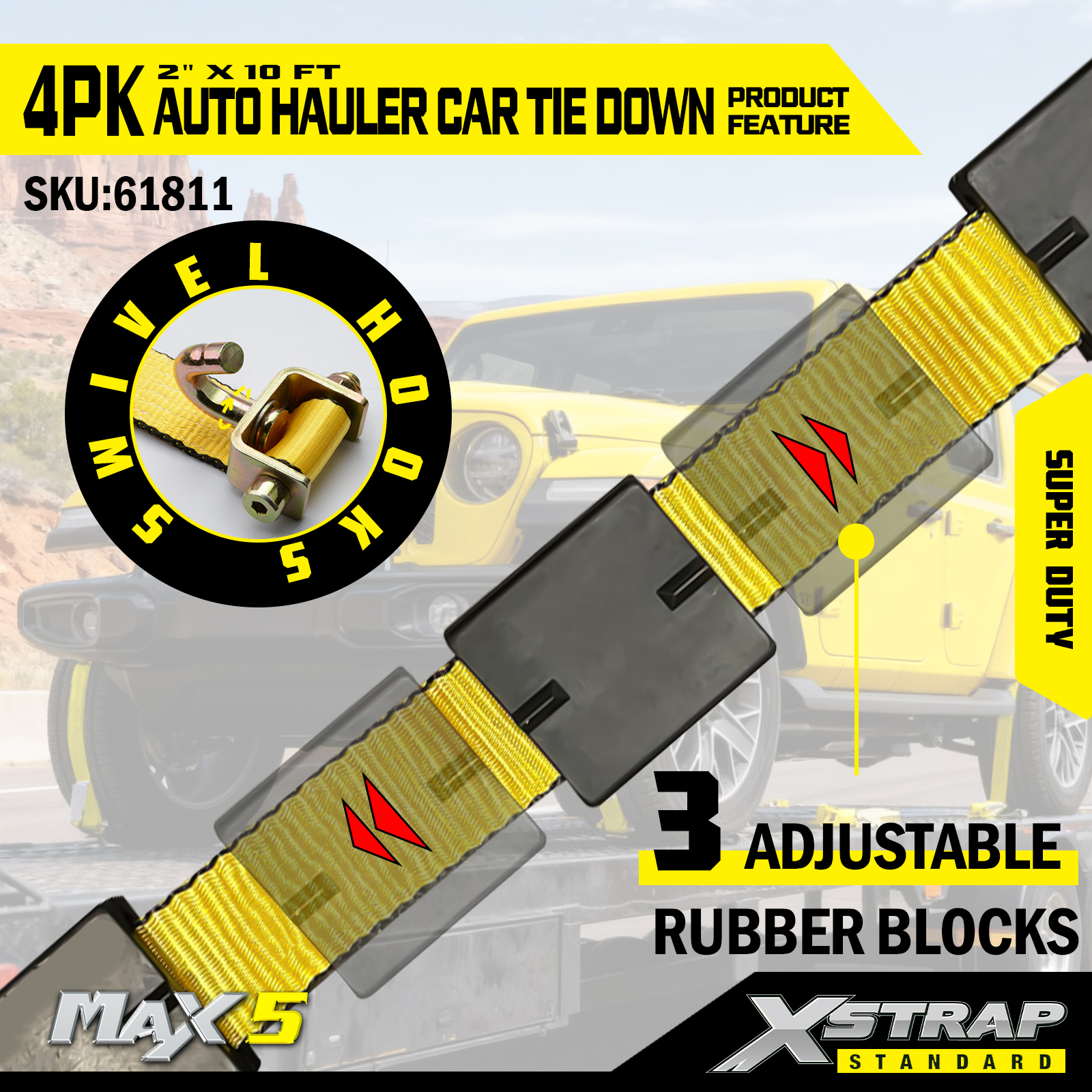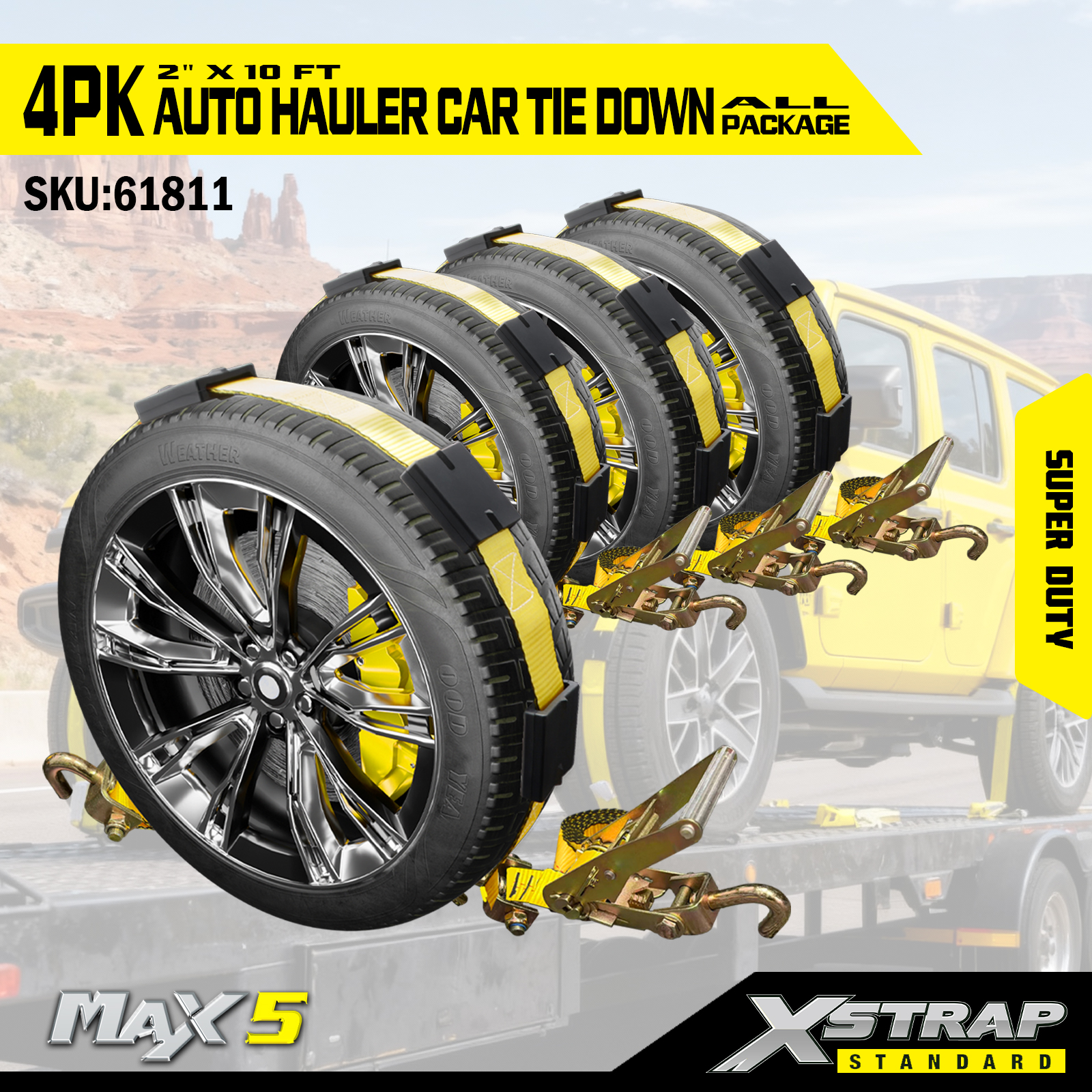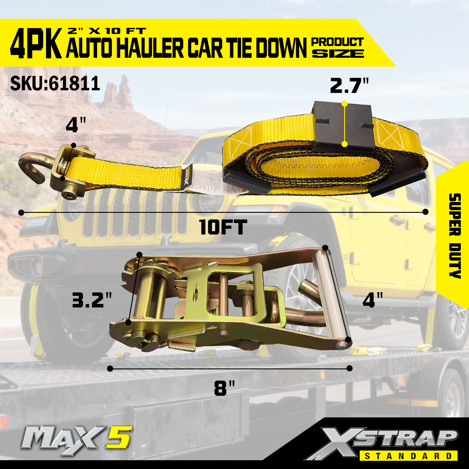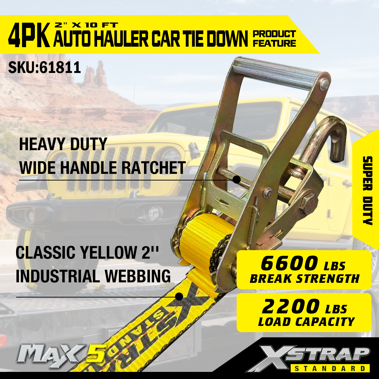 - Wydajność Super Duty: Każdy pas ma bezpieczne obciążenie robocze wynoszące 2200. Bezpieczne obciążenie robocze jest wybite na etykiecie ostrzegawczej każdego pasa mocującego w celu łatwej kontroli. Jest on przystosowany do obsługi ciężkich pojazdów i wymagających scenariuszy transportu.