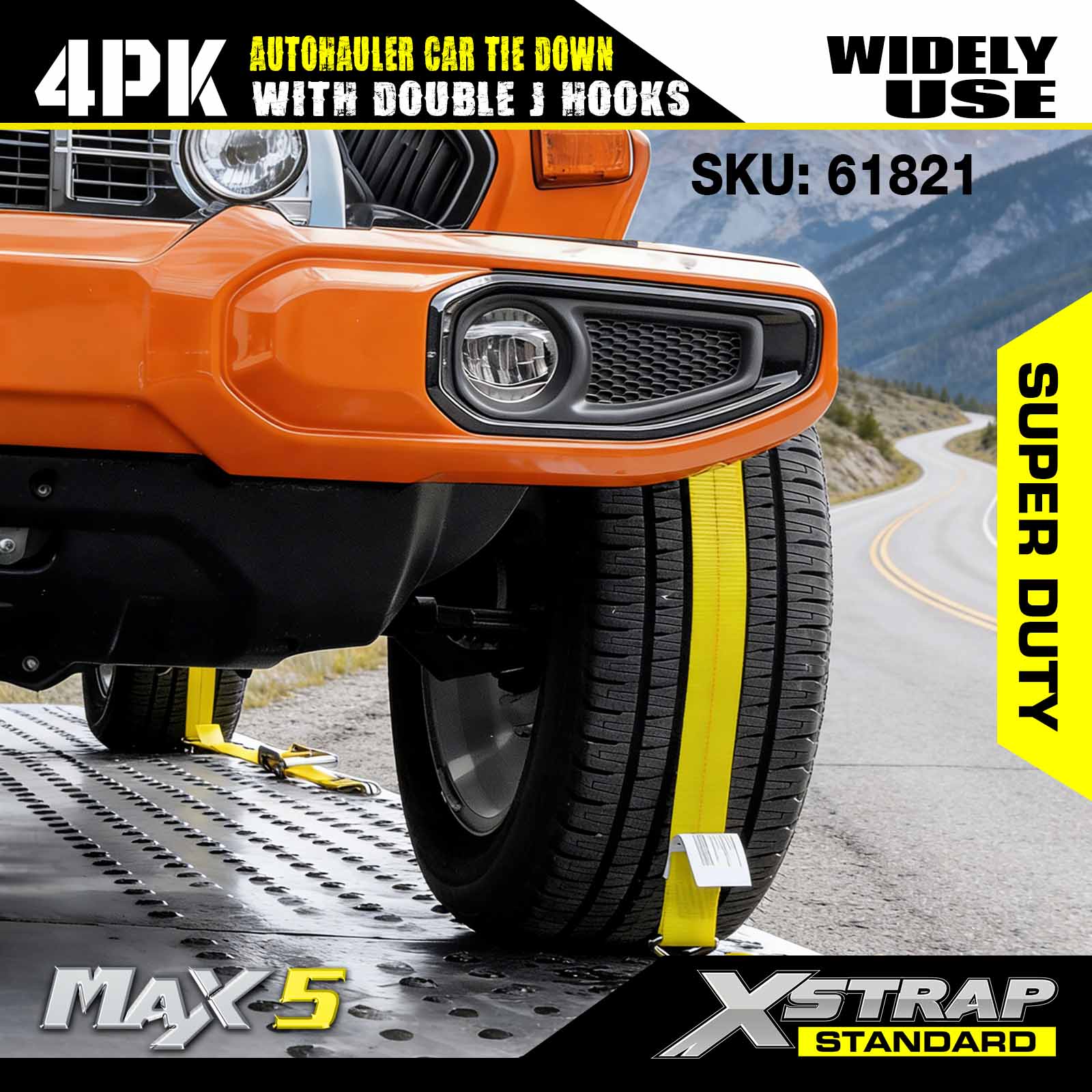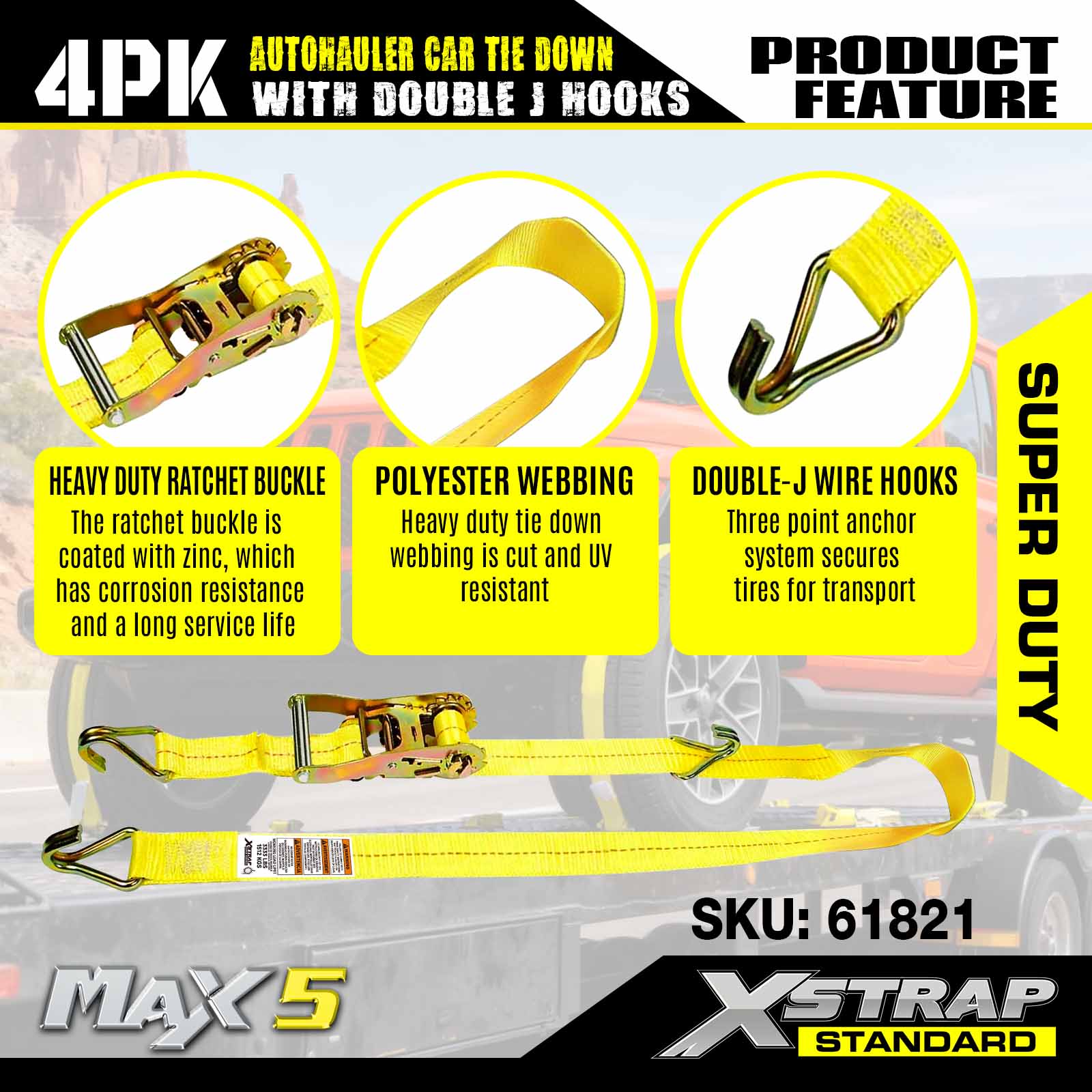- 3-punktowy system kotwiczenia z podwójnym J-Wire Hook: Trzy podwójne haki w kształcie litery J tworzą stabilną 3-punktową kotwicę wokół opon pojazdu, równomiernie rozkładając napięcie, aby zapobiec przesuwaniu się lub poślizgowi podczas transportu. Haki zaprojektowano tak, aby bezpiecznie pasowały do standardowych punktów mocowania przyczepy.
