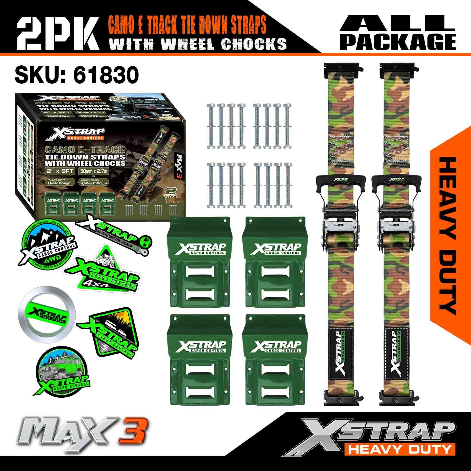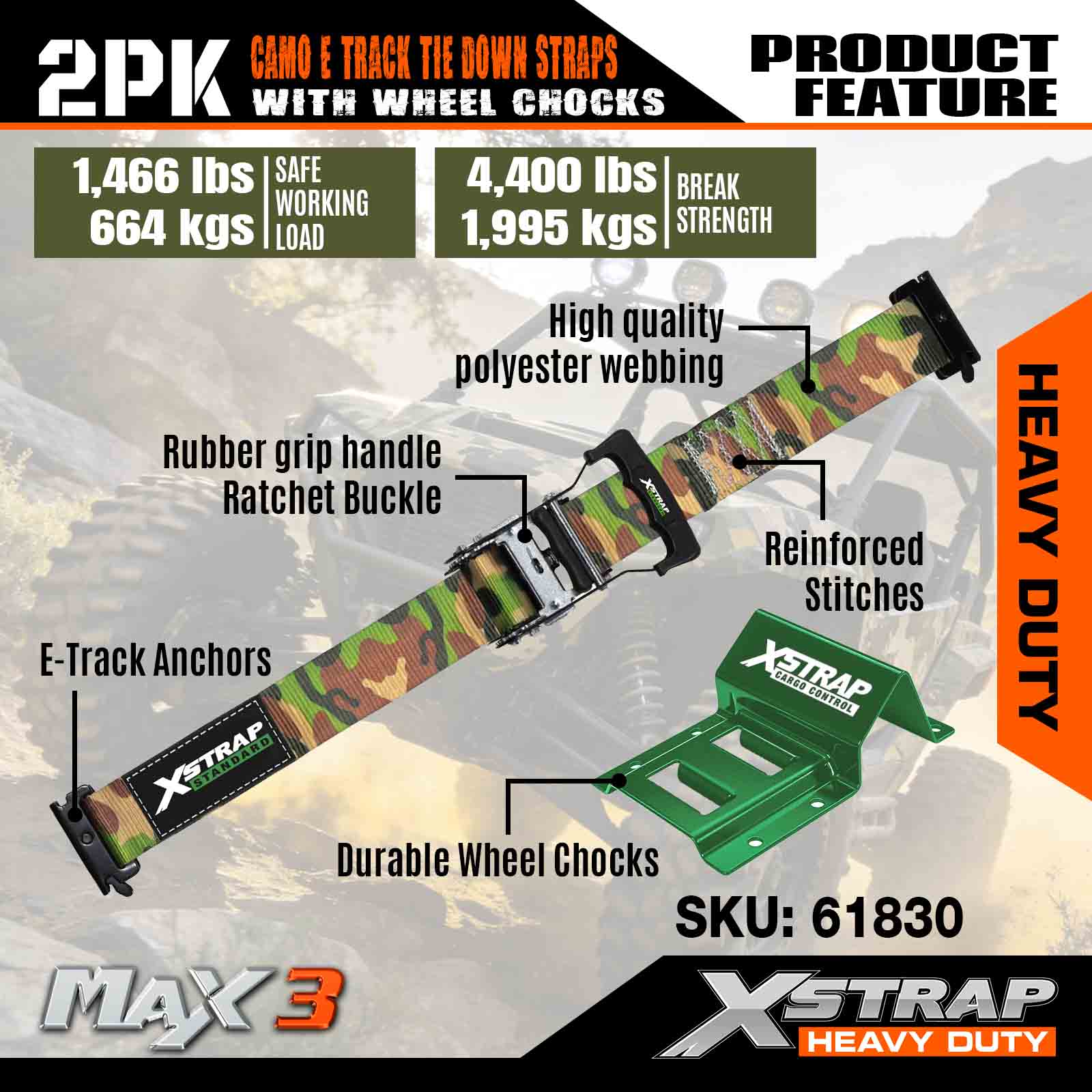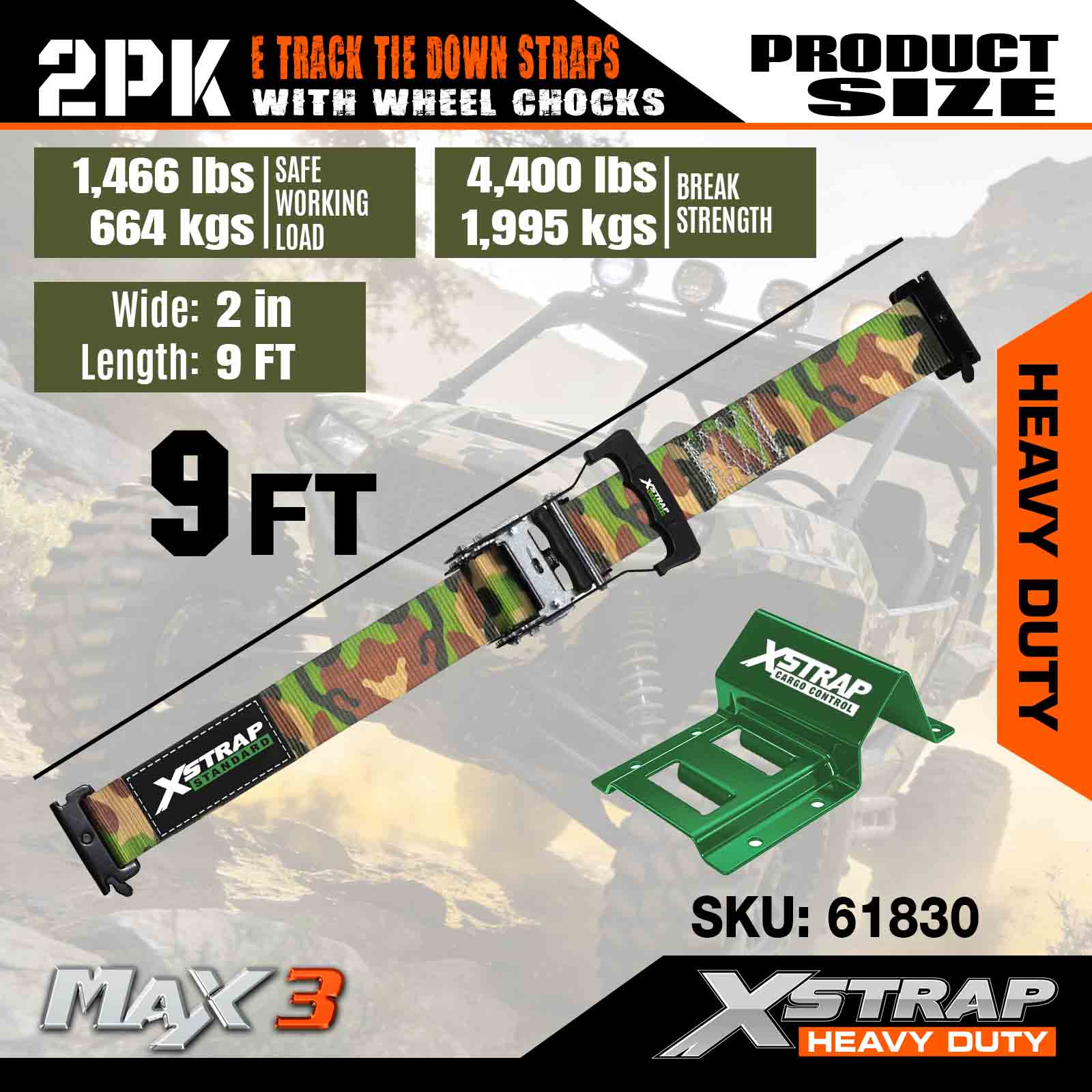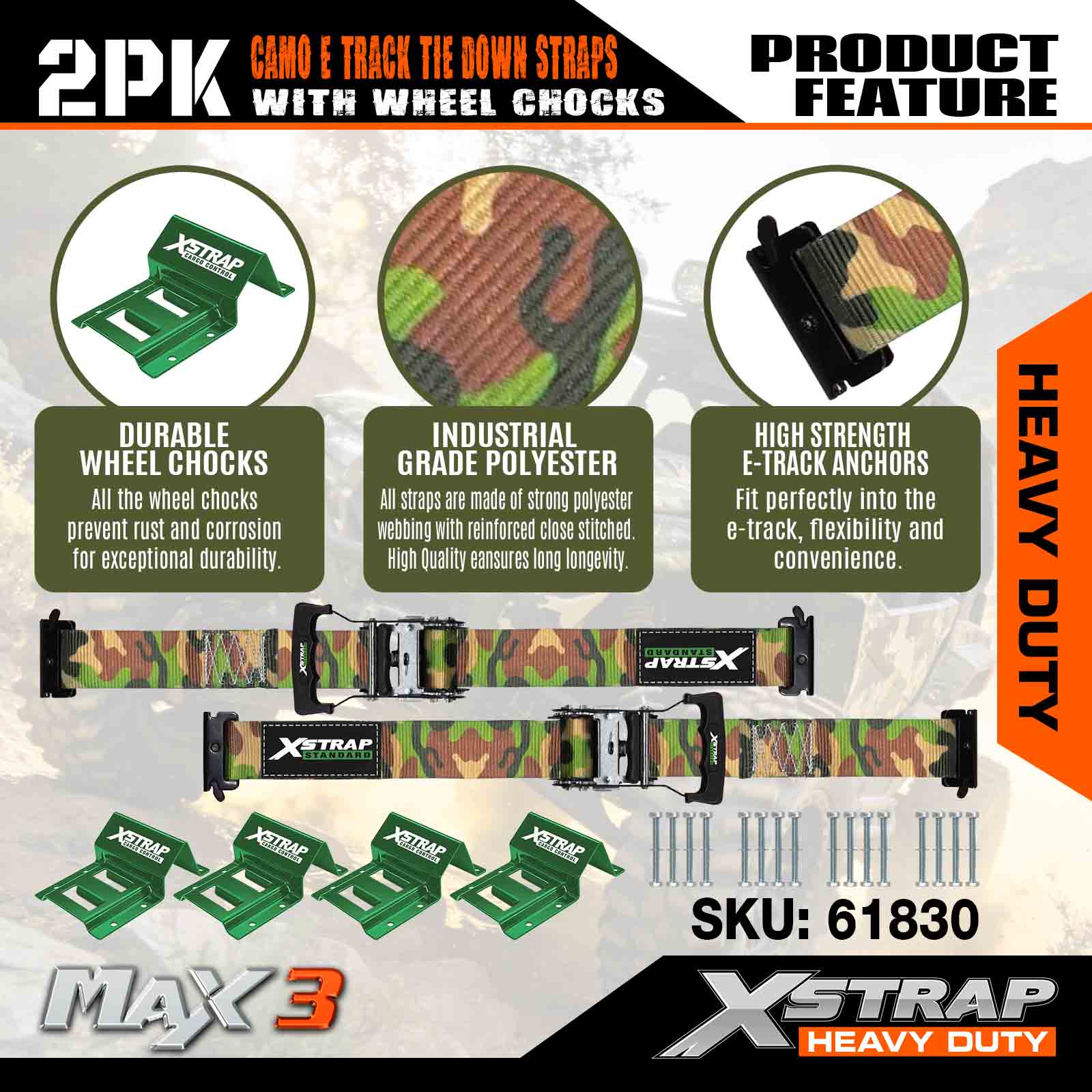 Xstrap Zestaw do mocowania klinów pod koła Wytrzymałość na zerwanie 4400 funtów (2) Wytrzymałe paski zapadkowe do opon przyczepy (4) Kliny pod koła — system gąsienic E do pojazdów czterokołowych ATV, UTV i kosiarek do trawy — CAMO