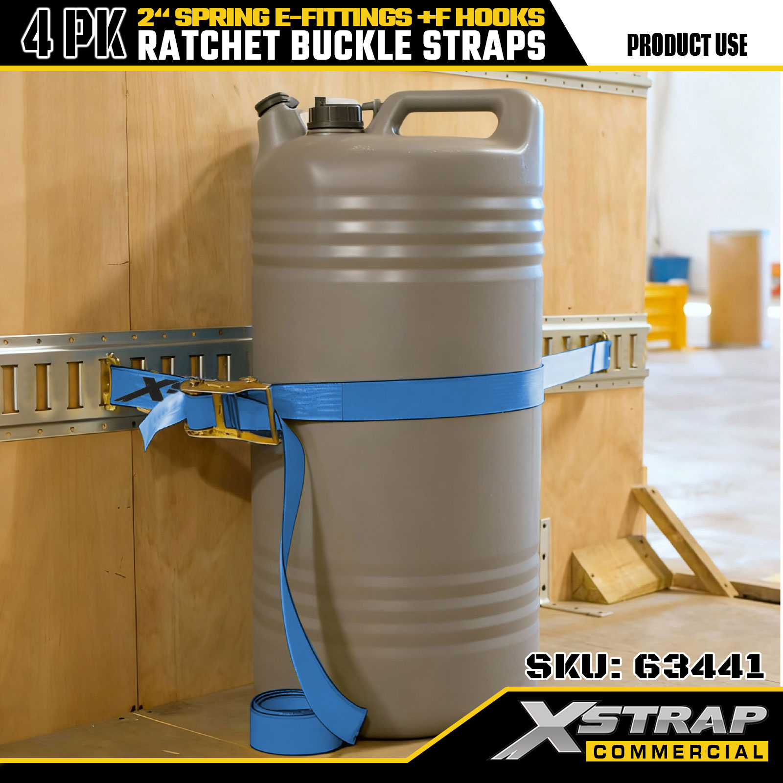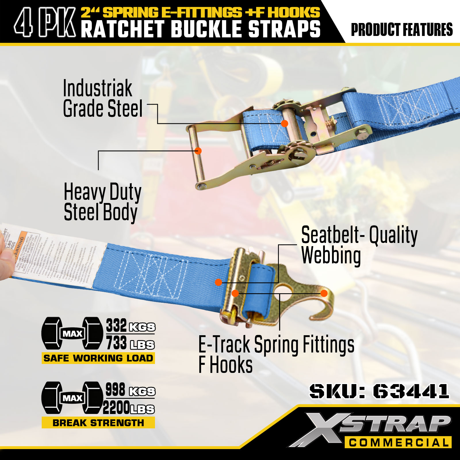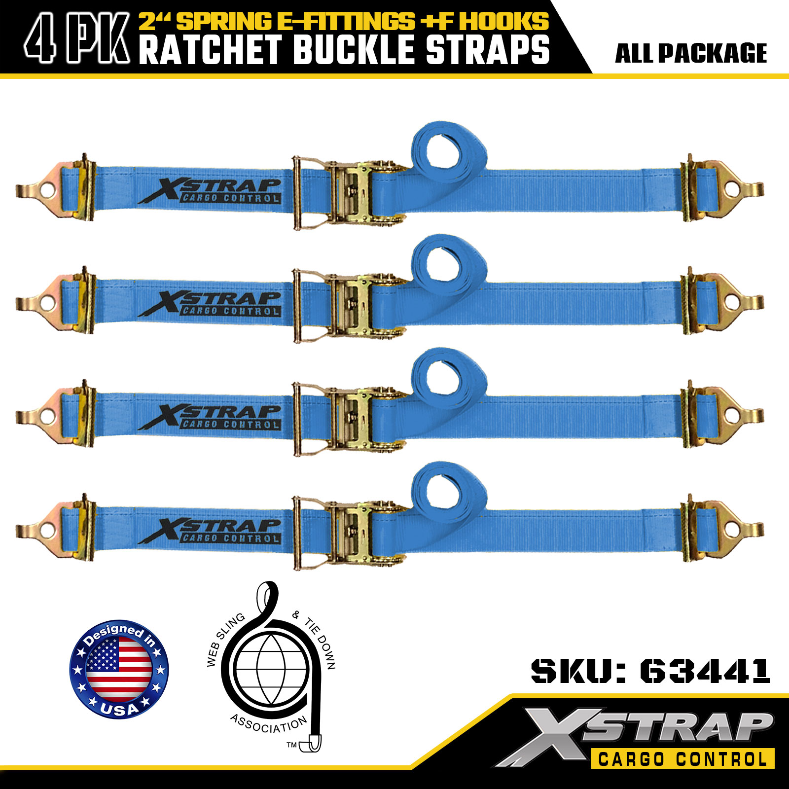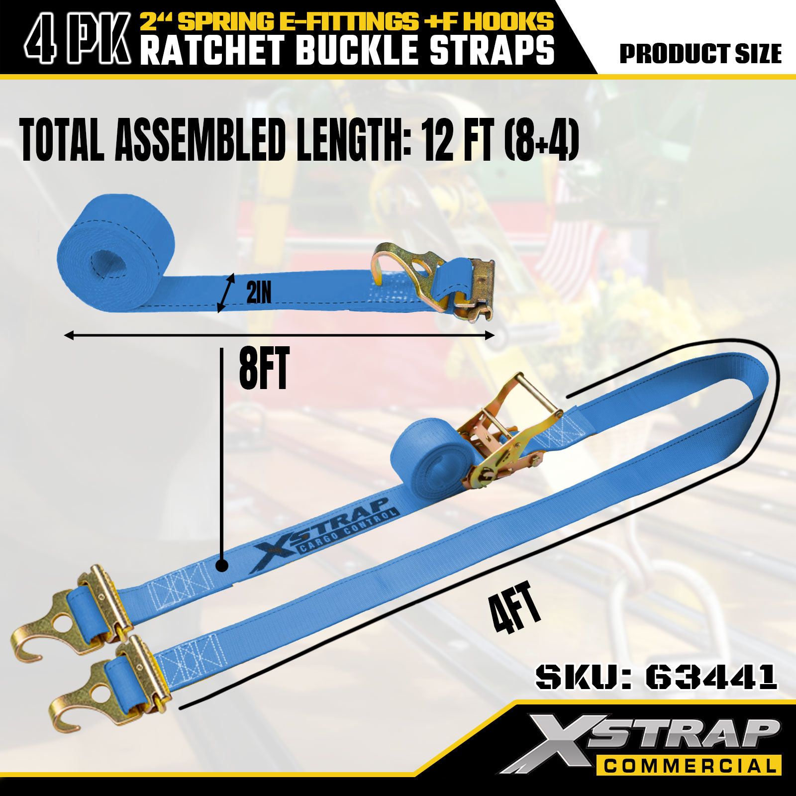 Zestaw 4 pasków mocujących zapadkowych Xstrap 2" x 12" poliester ze sprężynowymi złączami elektrycznymi i hakami F, 733 lbs SWL i 332 lbs Siła zrywająca do pojazdów ciężarowych, przeprowadzek i transportu drobnicowego