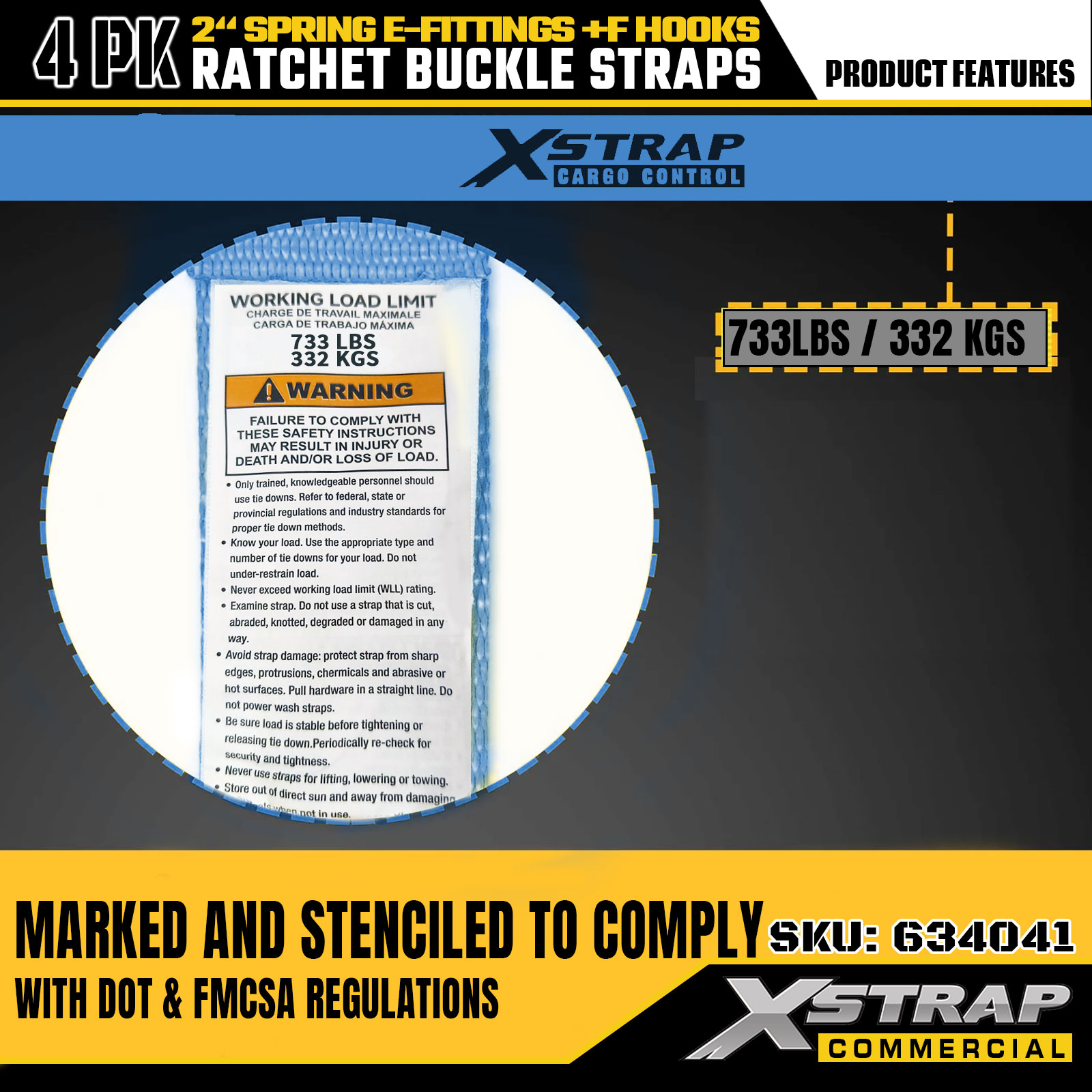 - Czytelne wskaźniki bezpieczeństwa: każdy pasek jest wyraźnie oznaczony bezpiecznym obciążeniem roboczym (SWL) wynoszącym 733 funtów i maksymalnym udźwigiem 332 funtów, co zawiera niezbędne instrukcje bezpieczeństwa dotyczące prawidłowego i bezpiecznego stosowania.