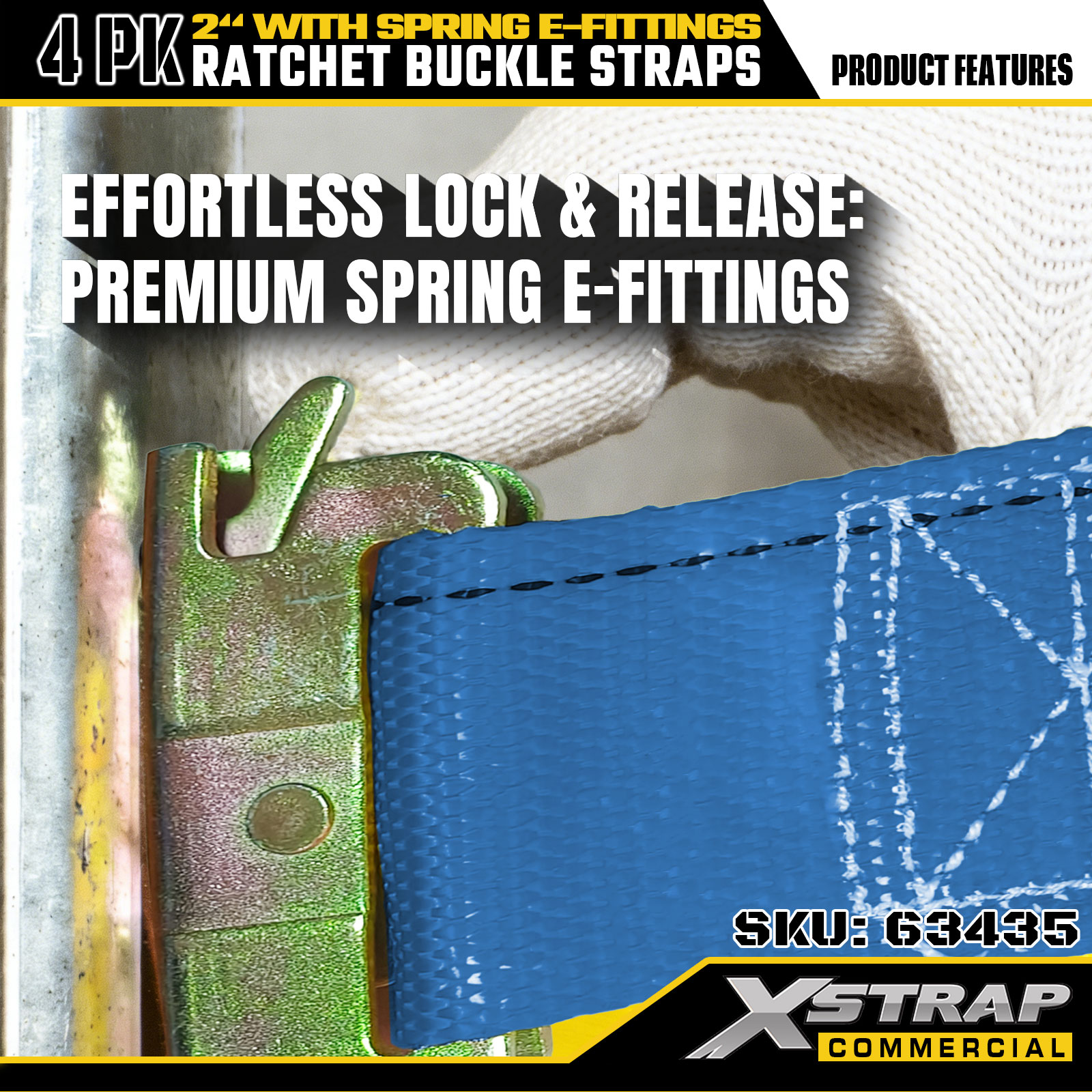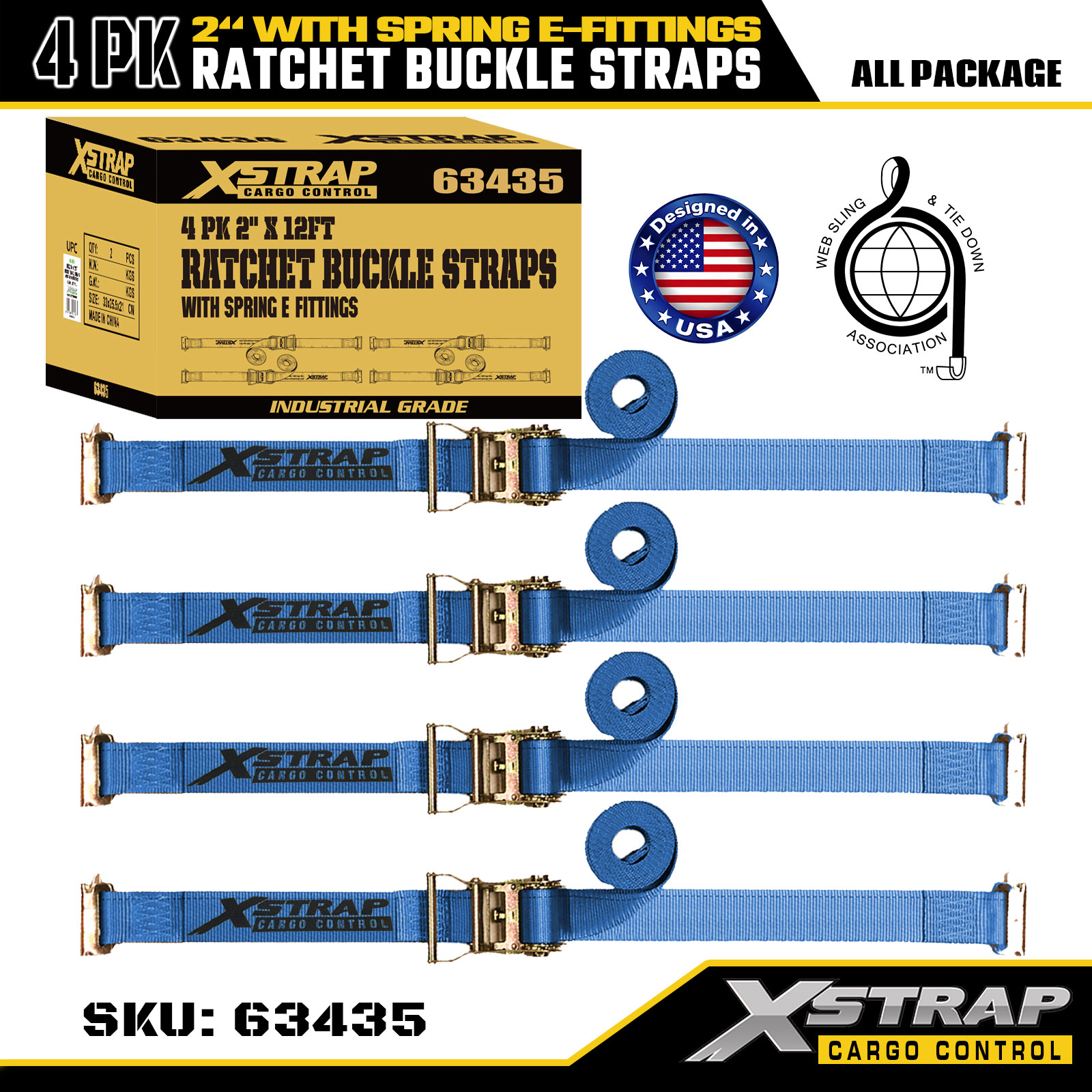Zestaw 4 pasów do mocowania zapadkowego Xstrap, 2" x 12" poliestrowych pasów zabezpieczających ładunek ze sprężynowymi złączami elektrycznymi, bezpieczne obciążenie robocze (SWL) 1467 funtów i siła zrywająca 4401 funtów, do samochodów ciężarowych, kosiarek i pojazdów terenowych