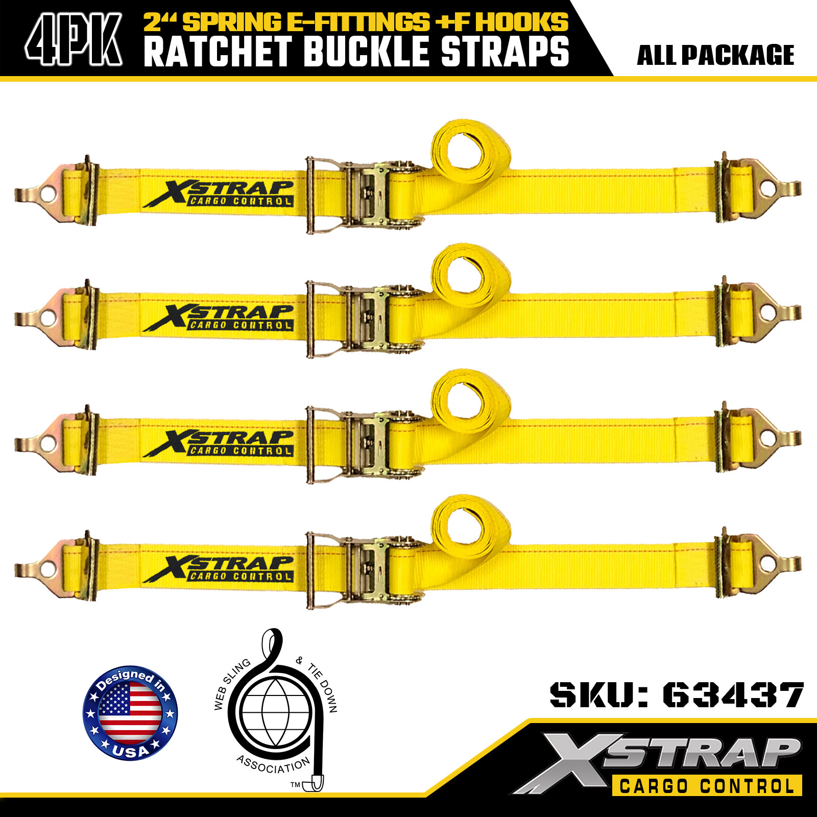 Zestaw 4 pasów do mocowania ładunku o dużej wytrzymałości zapadkowej Xstrap, poliester o wysokiej wytrzymałości 2" x 12" ze złączami sprężynowymi typu E i hakami typu F, opaski do mocowania ładunku o dużej wytrzymałości do 733 funtów do przyczep, ciężarówek, samochodów dostawczych i motocykli