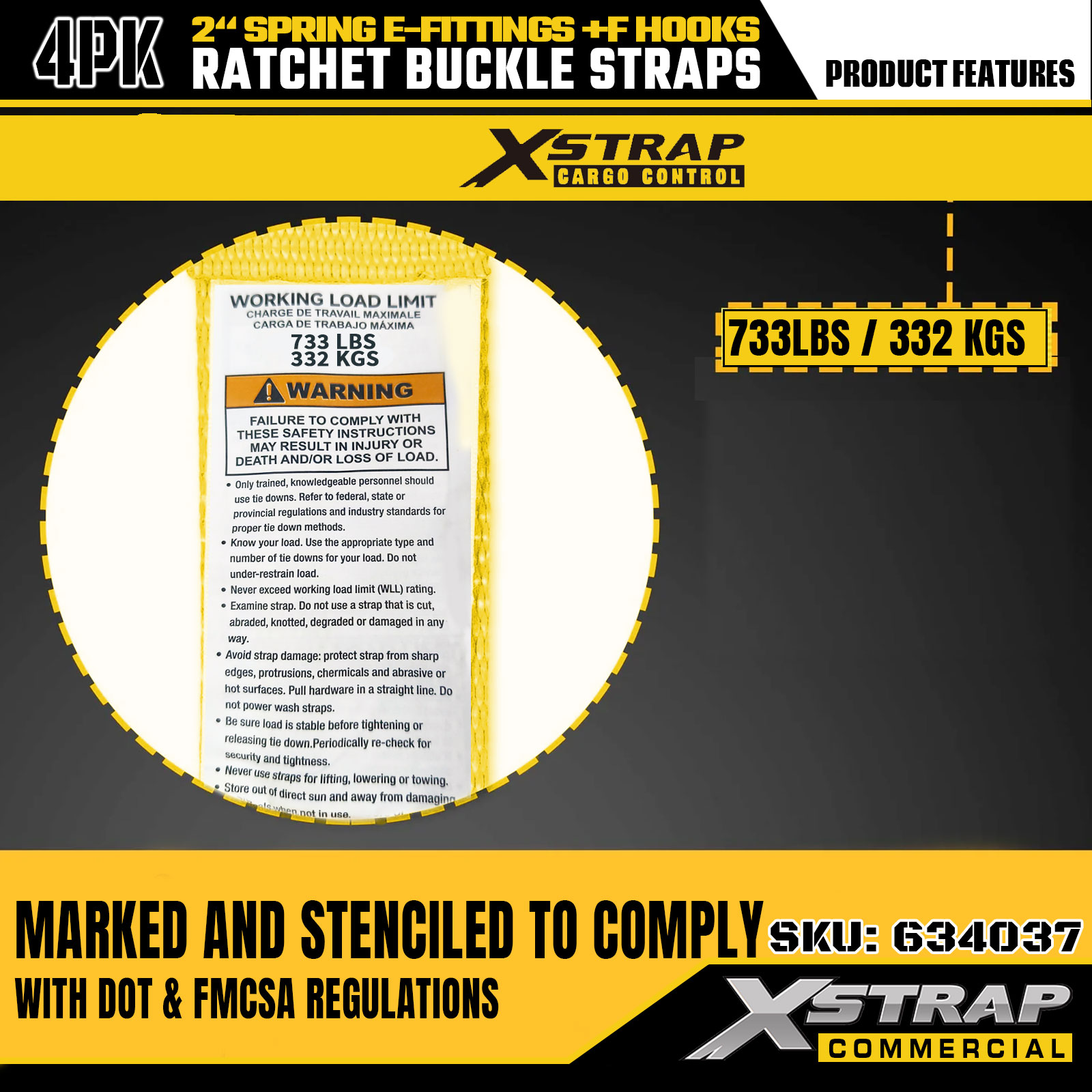 - Wyraźne oznaczenia nośności: każdy pasek jest wyraźnie oznaczony jako bezpieczne obciążenie robocze (SWL) wynoszące 733 funtów i wytrzymałość na zerwanie wynoszące 2199 funtów, co zapewnia najważniejsze wskazówki dotyczące bezpieczeństwa w celu zapewnienia właściwej i bezpiecznej kontroli ładunku.