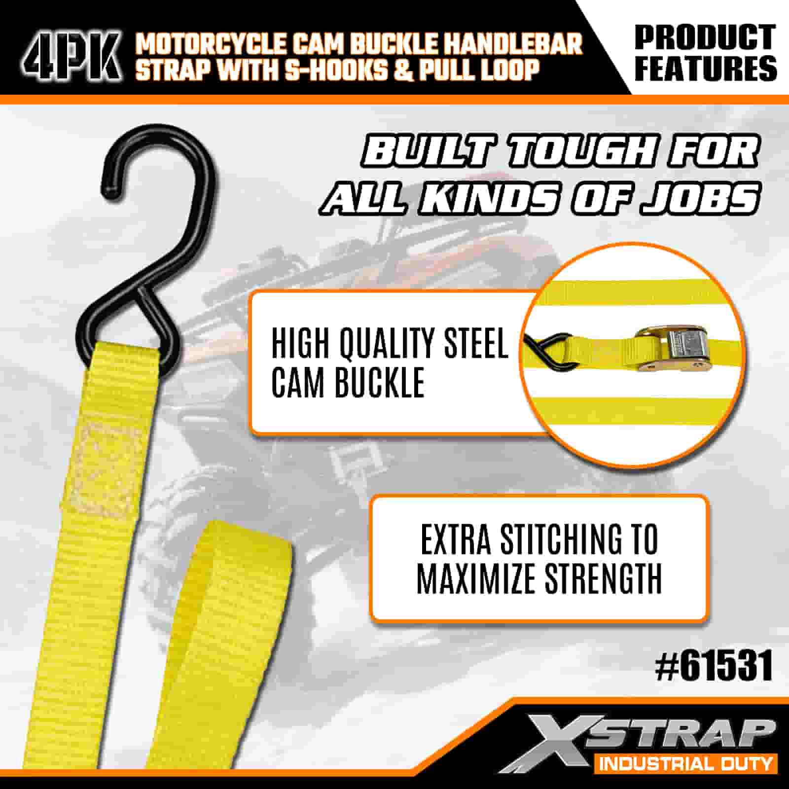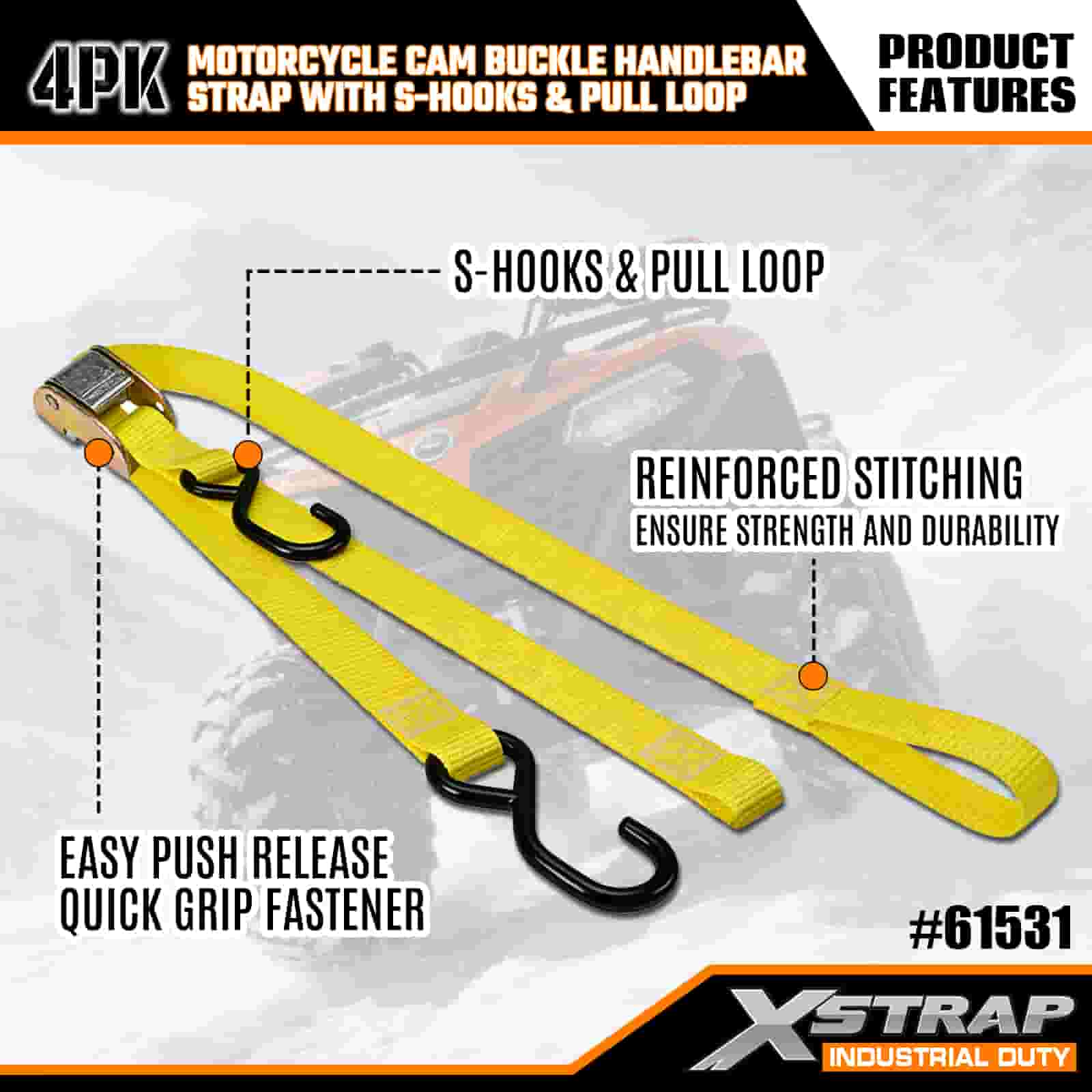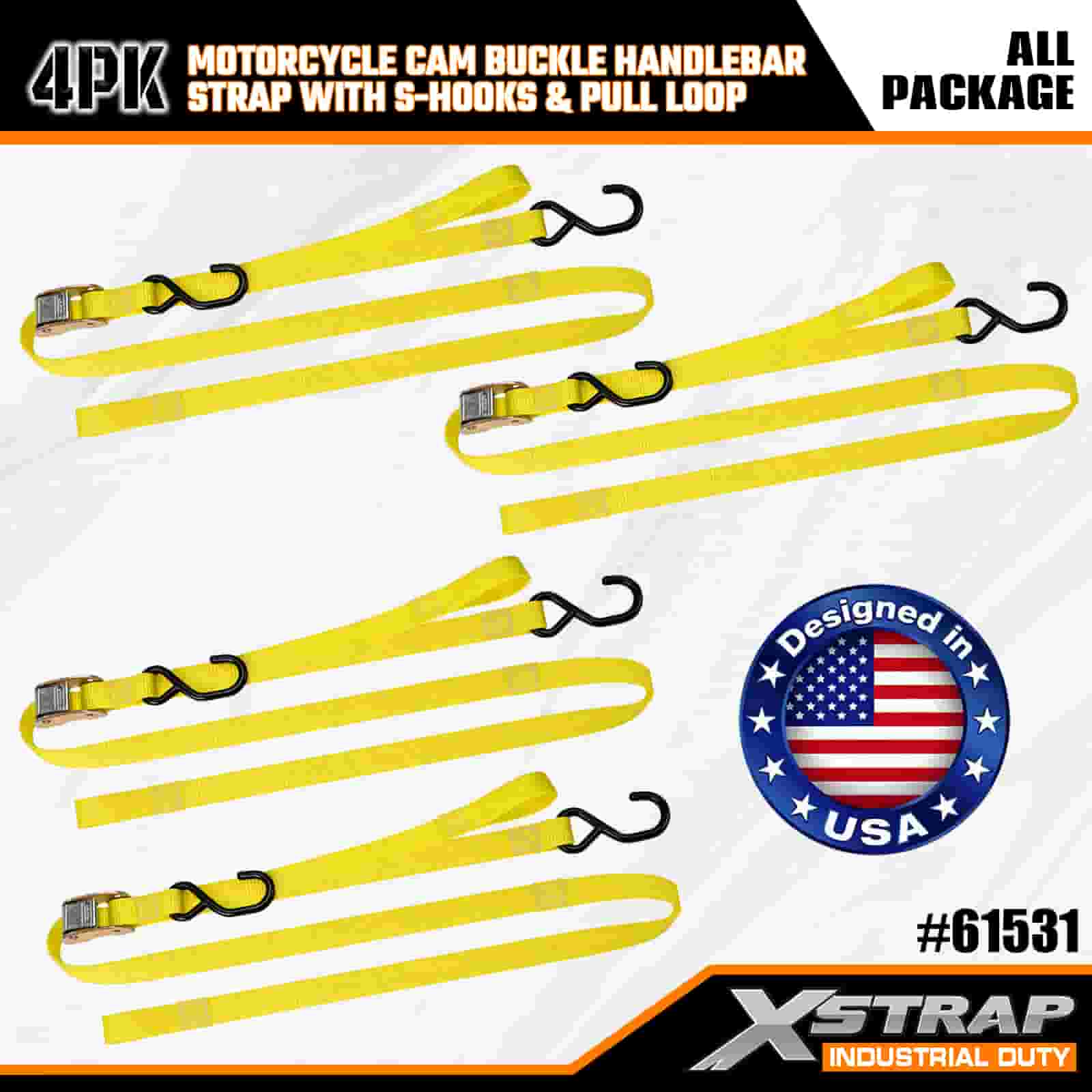 Xstrap 4PK Pasek na kierownicę z klamrą motocyklową z haczykami S i pętlą do ciągnięcia, Poliestrowy pasek do mocowania 1” x 6” Pasek z klamrą do ciągnięcia, udźwig 400 funtów Pasy zabezpieczające do mocowania ładunku z haczykami S dla poważnych profesjonalistów do zabezpieczania przyczepy towarowej, przyczepy z platformą, łodzi narciarskiej, małego samochodu.