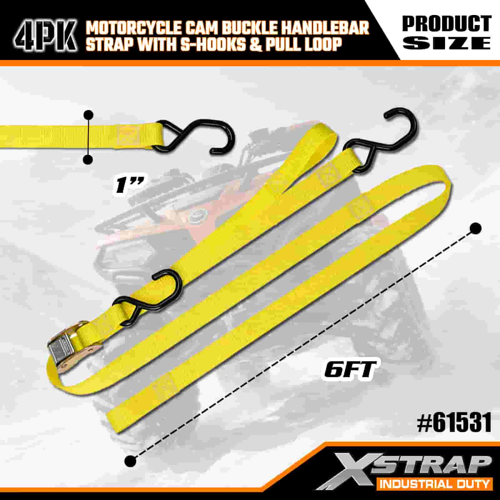 - 4-pak pasków 6FT do użytku motocyklowego: sprzedawane jako zestaw 4 pasków (1 cal szerokości × 6 stóp długości), idealny do zabezpieczania motocykli, kierownic i małego sprzętu w skrzyniach ciężarówek lub podczas transportu.