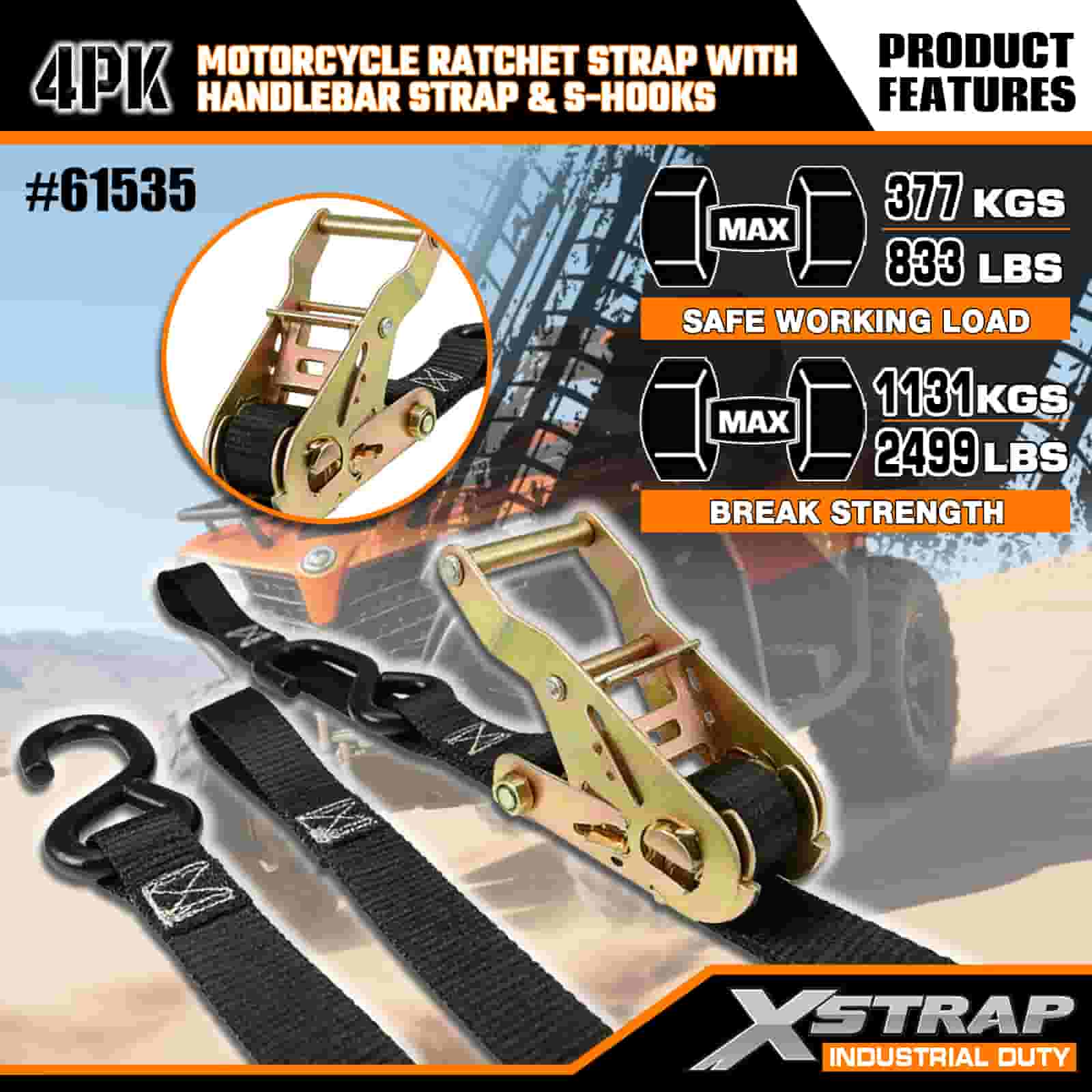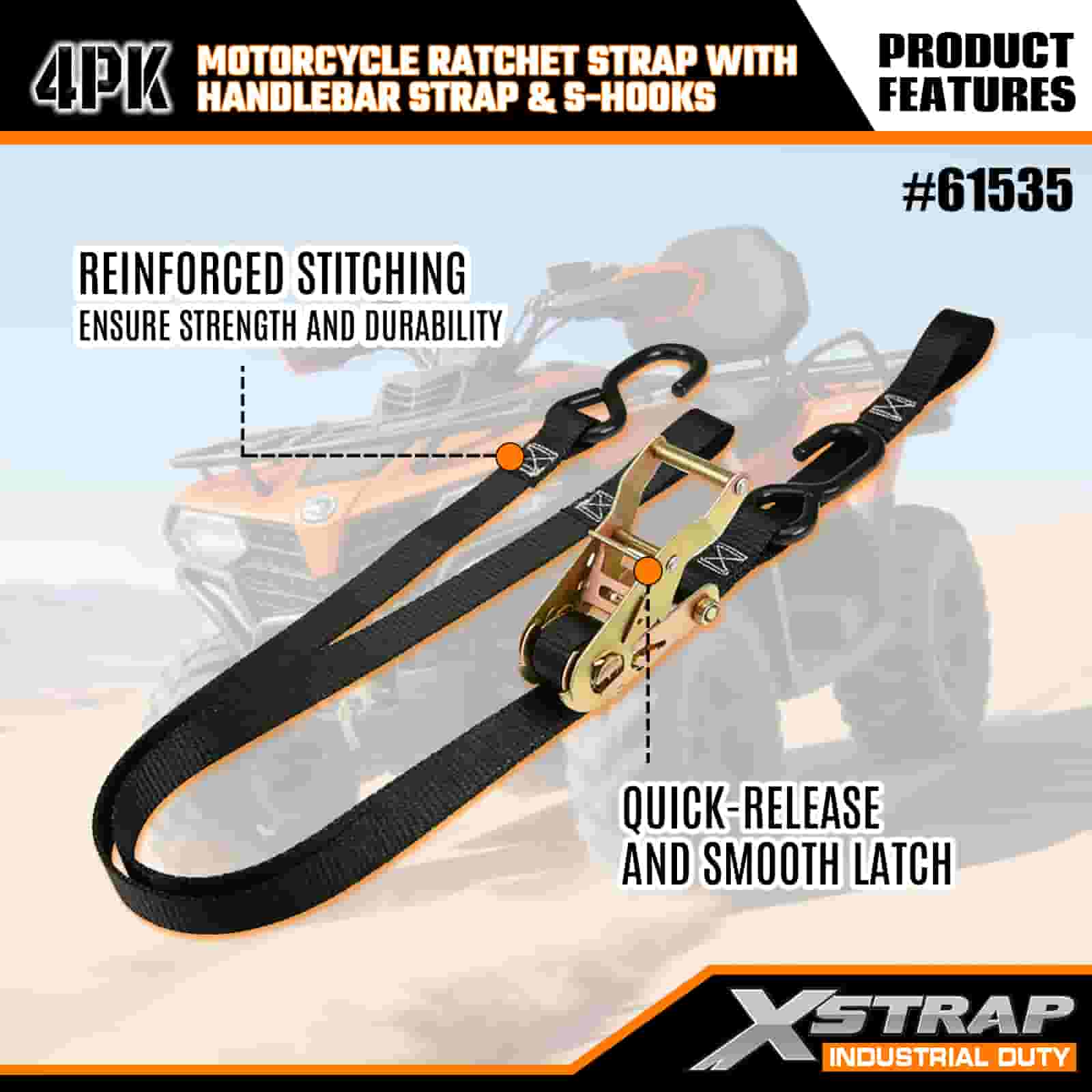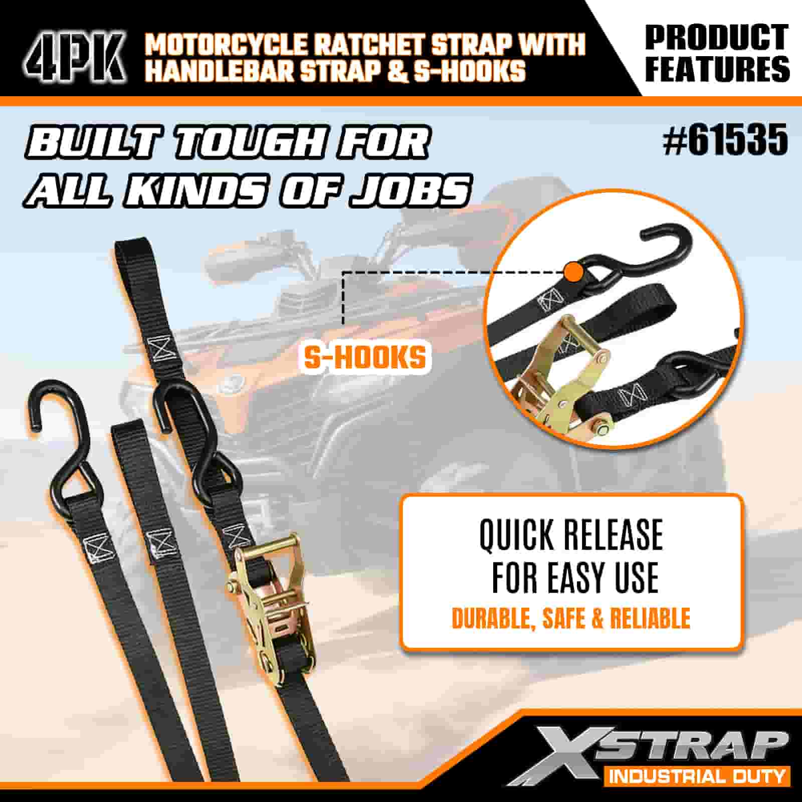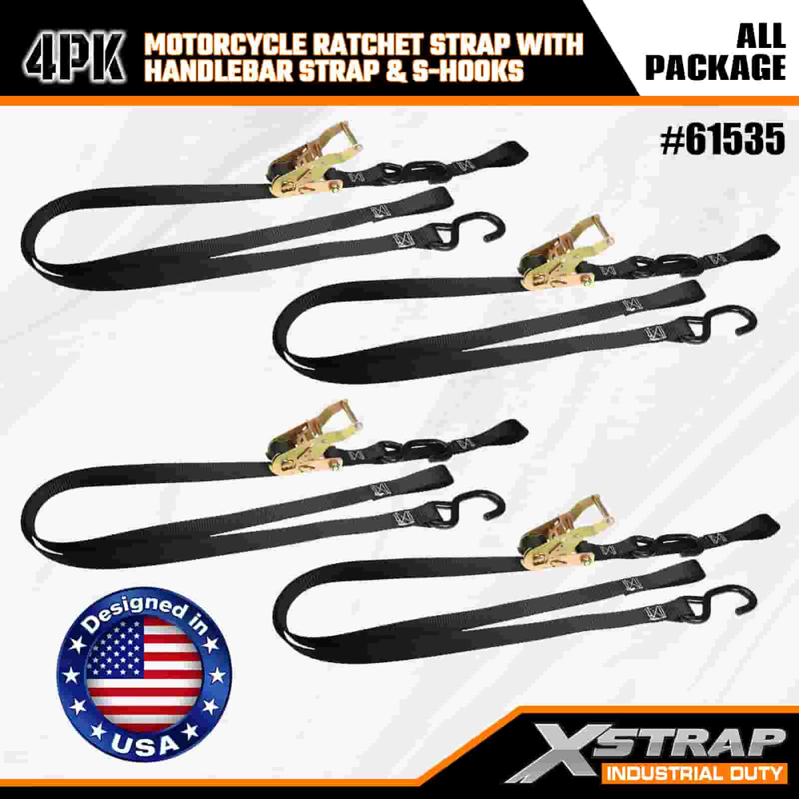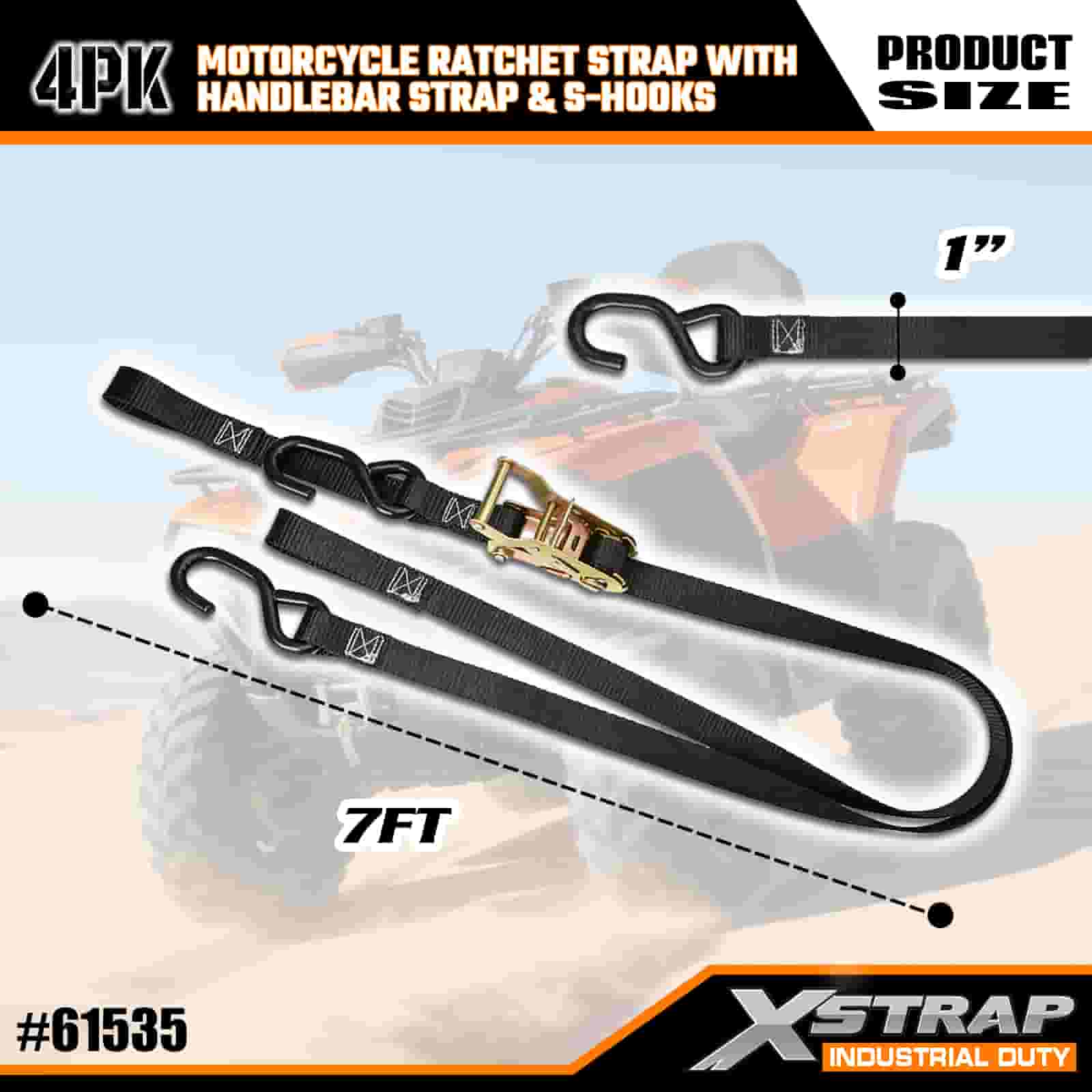 Pasek zapadkowy motocyklowy Xstrap 4PK z paskiem na kierownicę i haczykami S, poliestrowy pasek mocujący o wymiarach 1” x 7 stóp, pasek zapadkowy o udźwigu 833 funtów, pasy zabezpieczające do mocowania ładunku z haczykiem S dla poważnych profesjonalistów do zabezpieczania przyczepy towarowej, przyczepy z platformą, łodzi narciarskiej, małego samochodu.