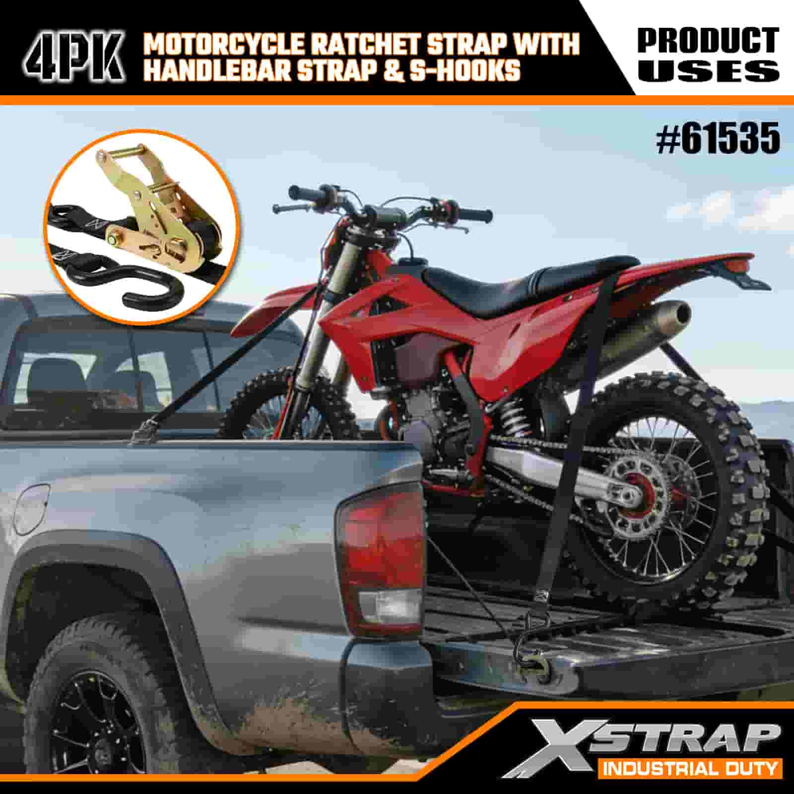 - 4-pak pasków 7FT do użytku motocyklowego: sprzedawane jako zestaw 4 pasków (1 cal szerokości x 7 stóp długości), idealny do zabezpieczania motocykli, kierownic i małego sprzętu w skrzyniach ciężarówek lub podczas transportu.