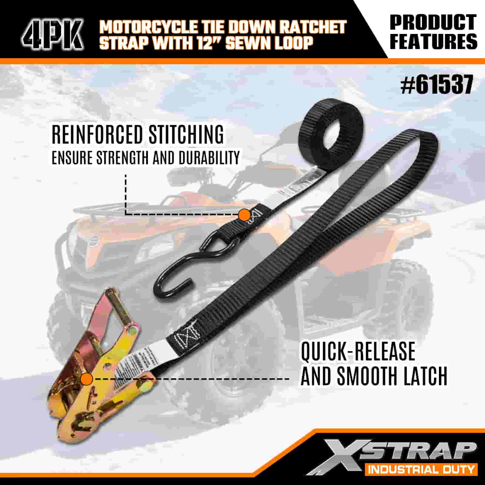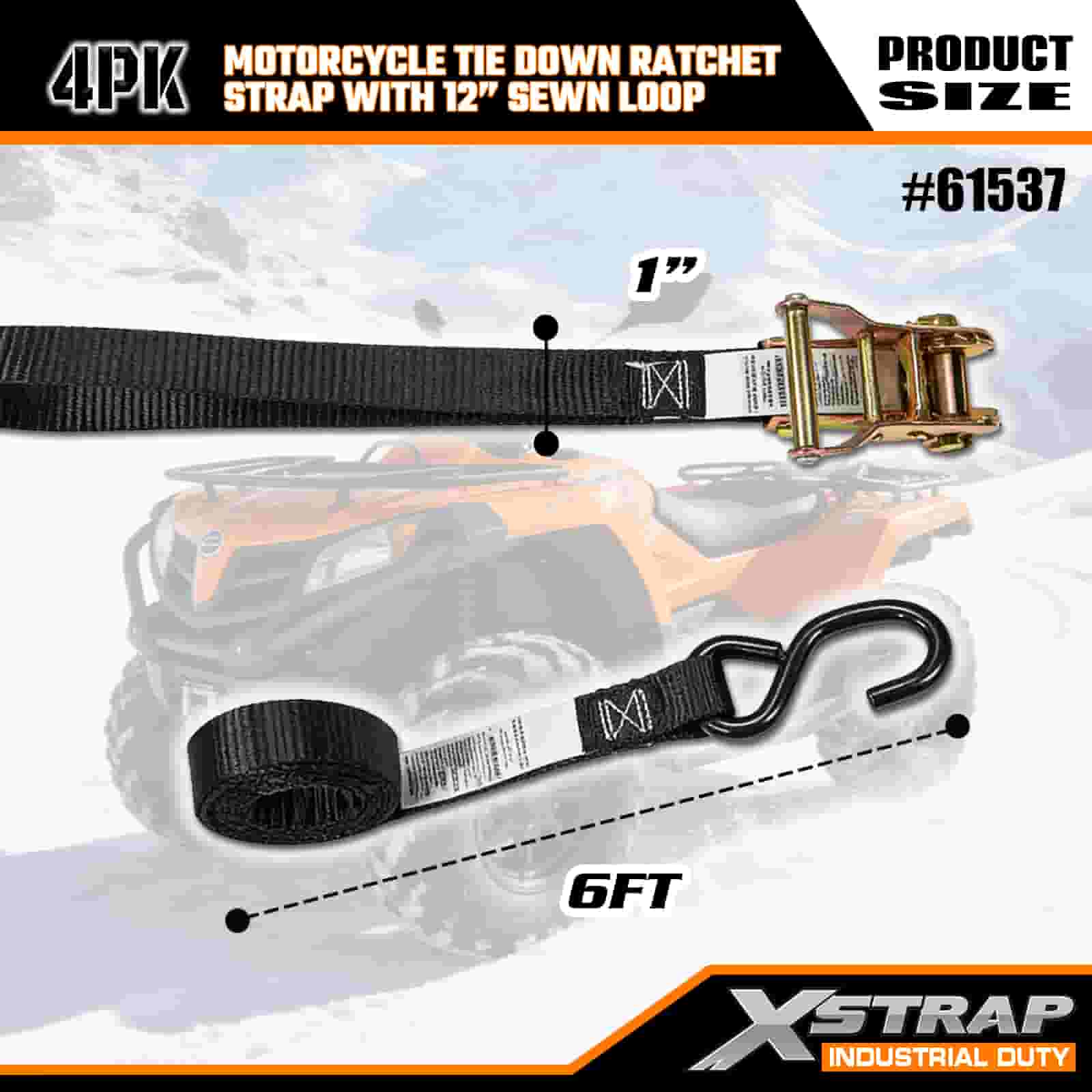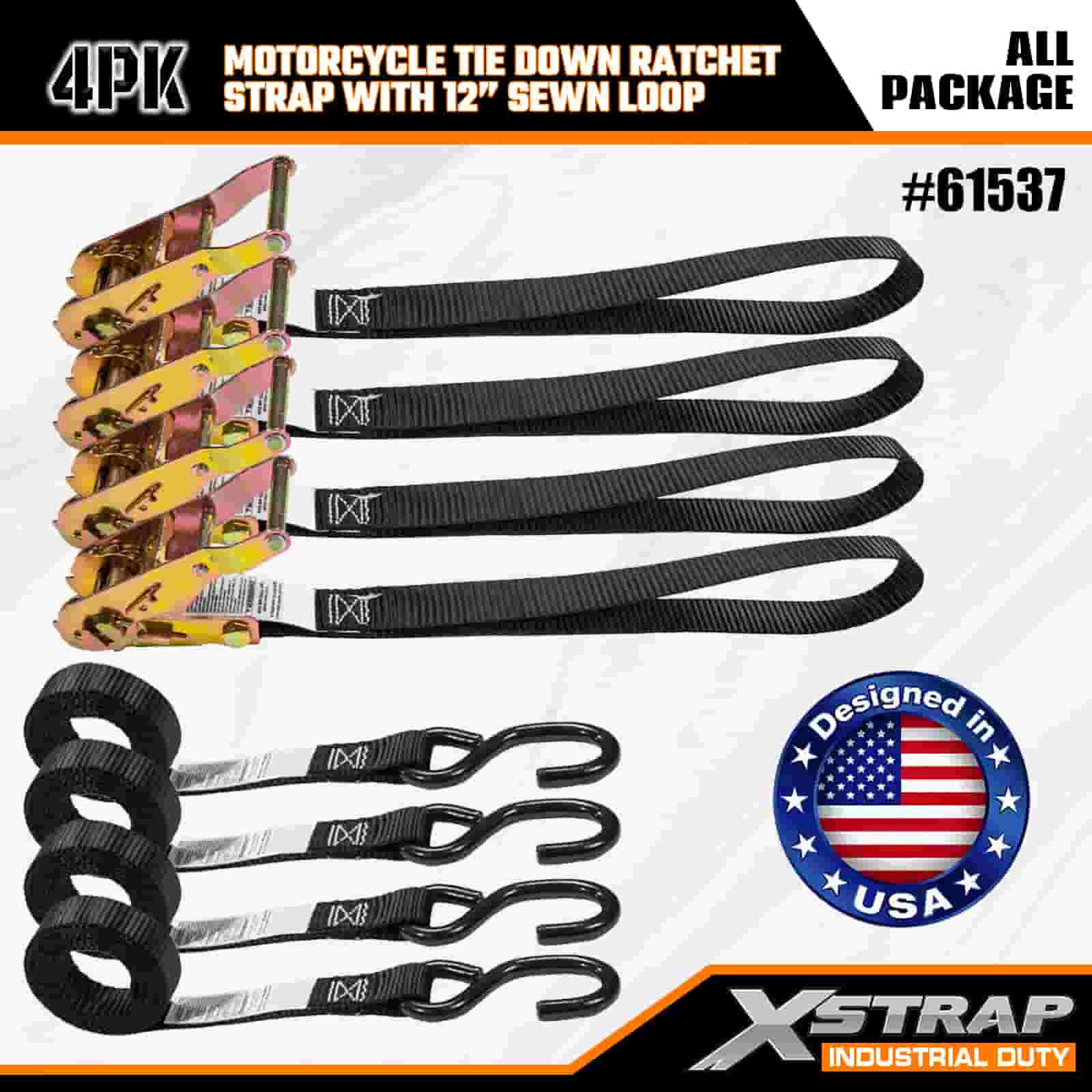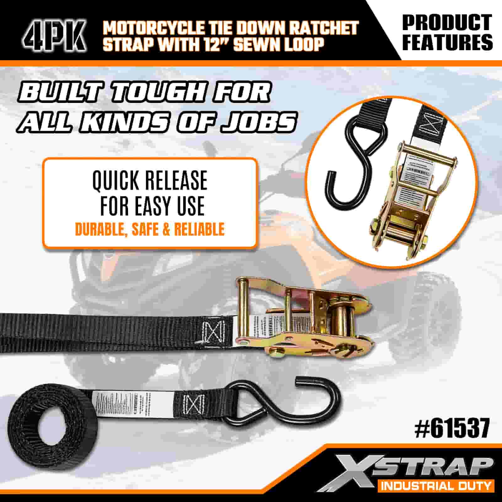 Xstrap 4PK Pasek zapadkowy do mocowania motocykla z 12-calową pętlą wszytą, poliestrowy pasek do mocowania o wymiarach 1" x 6 cali, ciągniony pasek zapadkowy, paski zabezpieczające ładunek o udźwigu 833 funtów z haczykiem S dla poważnych profesjonalistów do zabezpieczania przyczepy towarowej, przyczepy z platformą, łodzi narciarskiej, małego samochodu.
