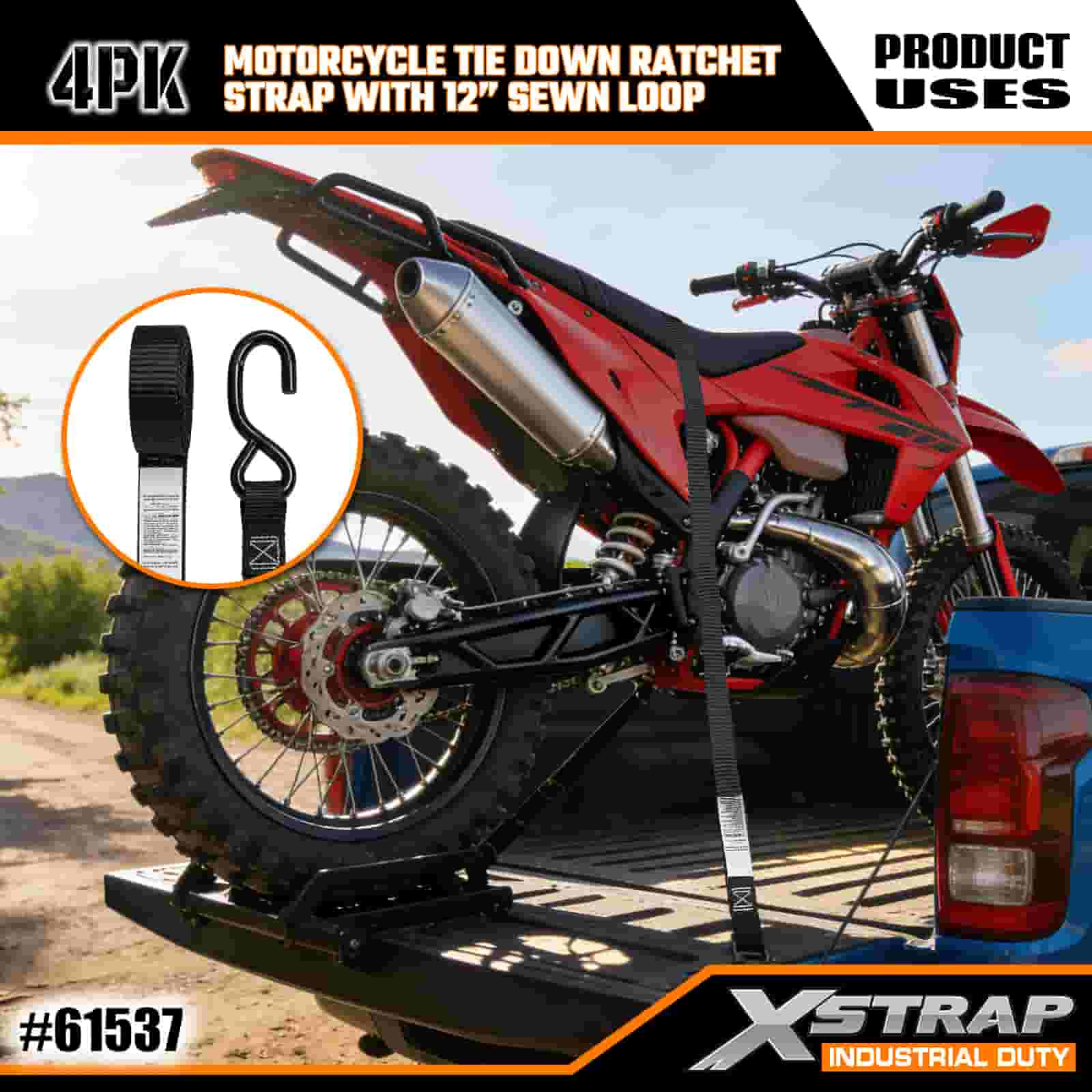 - 4-pak pasków 6FT do mocowania motocykla: sprzedawane jako zestaw 4 pasków (szerokość 1 cala x długość 6 stóp), idealne do zabezpieczania motocykli, quadów i małego sprzętu w skrzyniach ciężarówek lub podczas transportu.