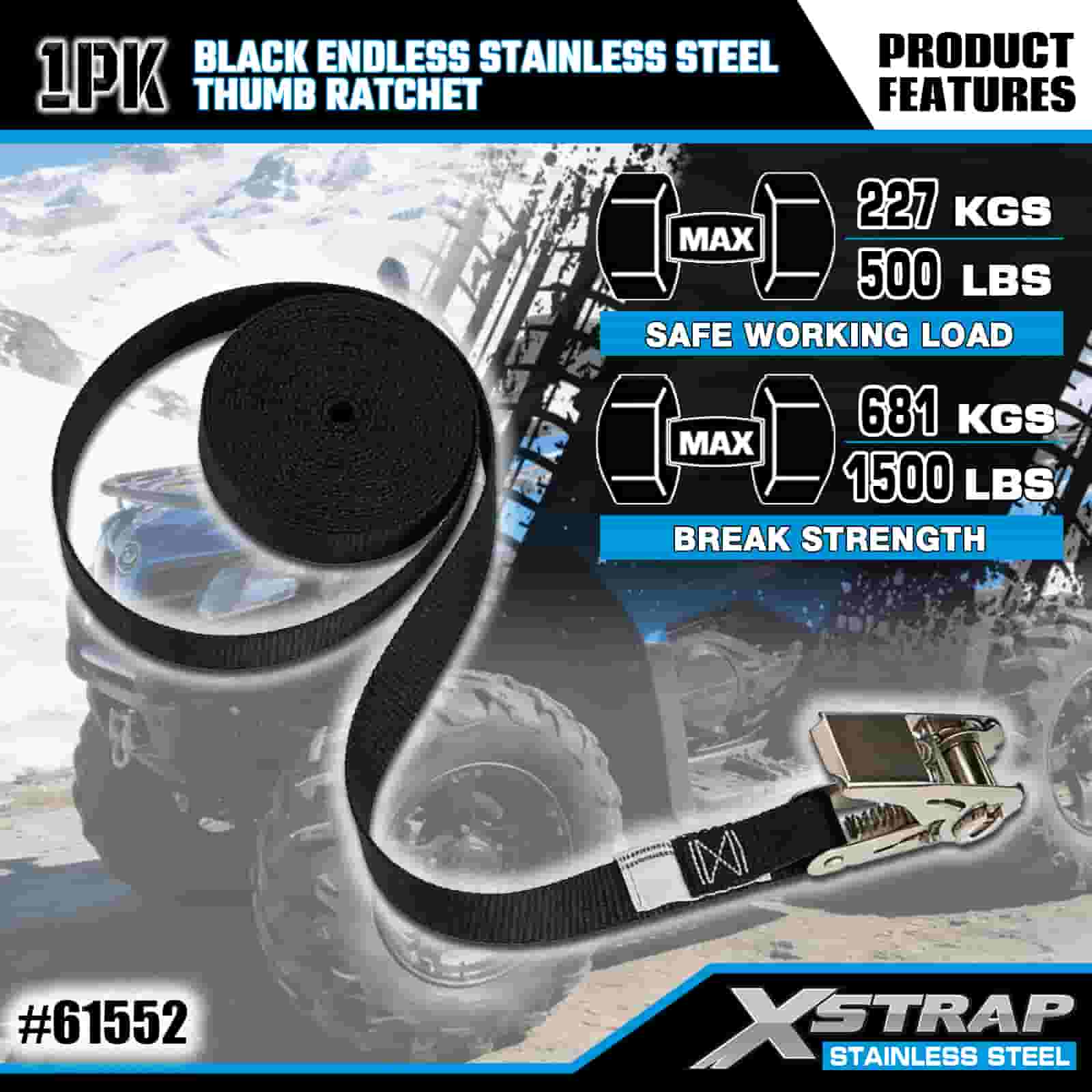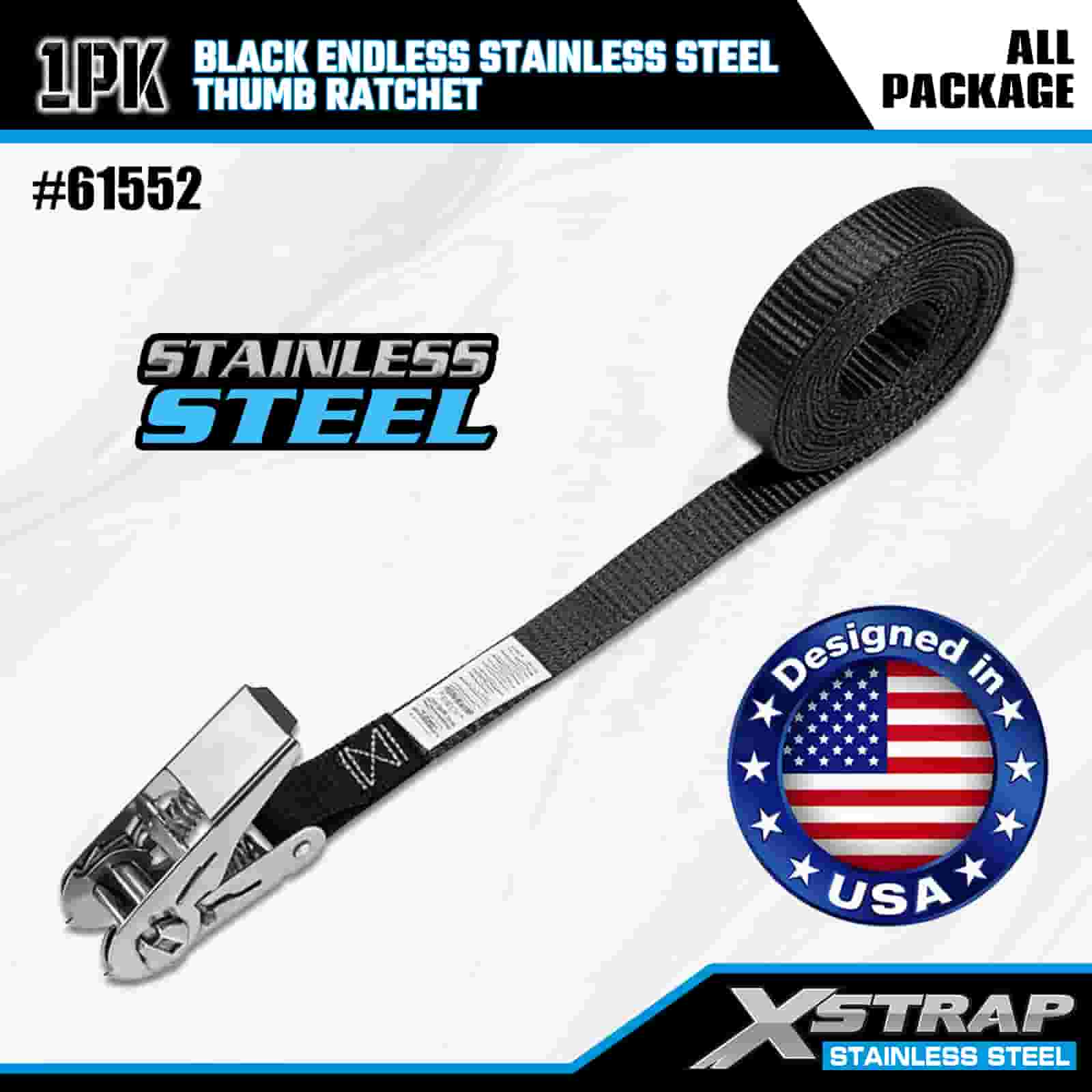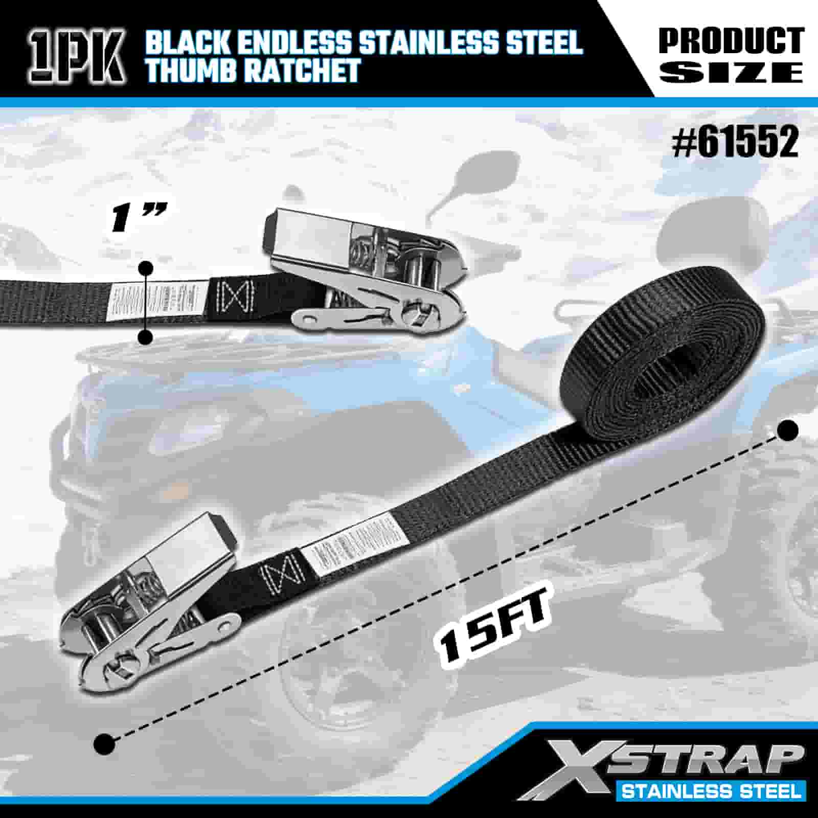 Xstrap Czarna, niekończąca się grzechotka kciukowa ze stali nierdzewnej, poliestrowy pasek zapadkowy 1” x 15 cali, paski zabezpieczające ładunek o udźwigu 500 funtów do przyczepy, przyczepy z płaską platformą, łodzi narciarskiej, małego samochodu, ciężkiego sprzętu.