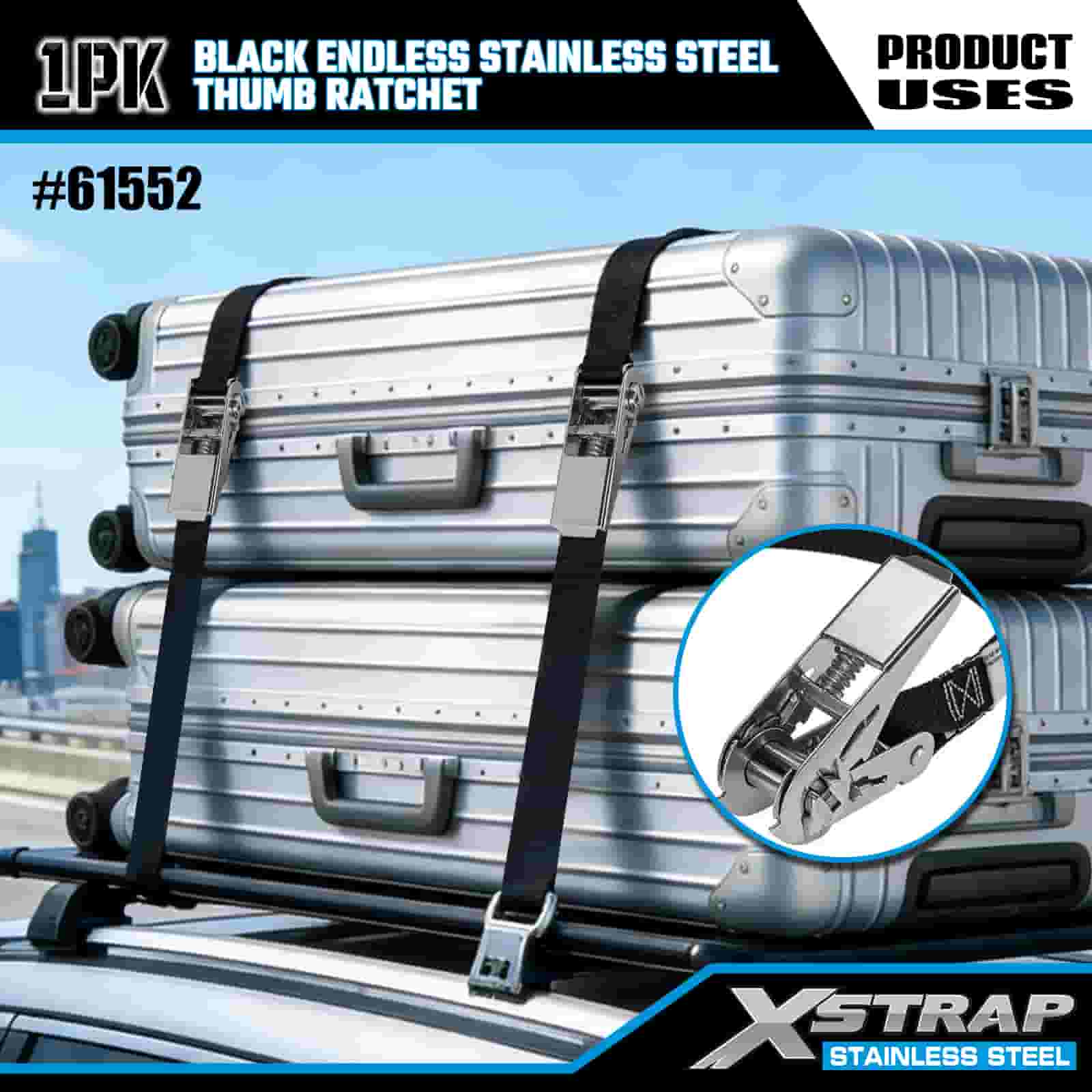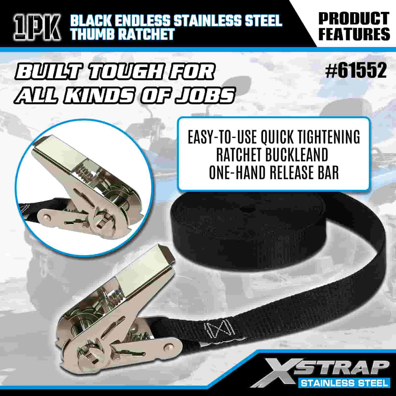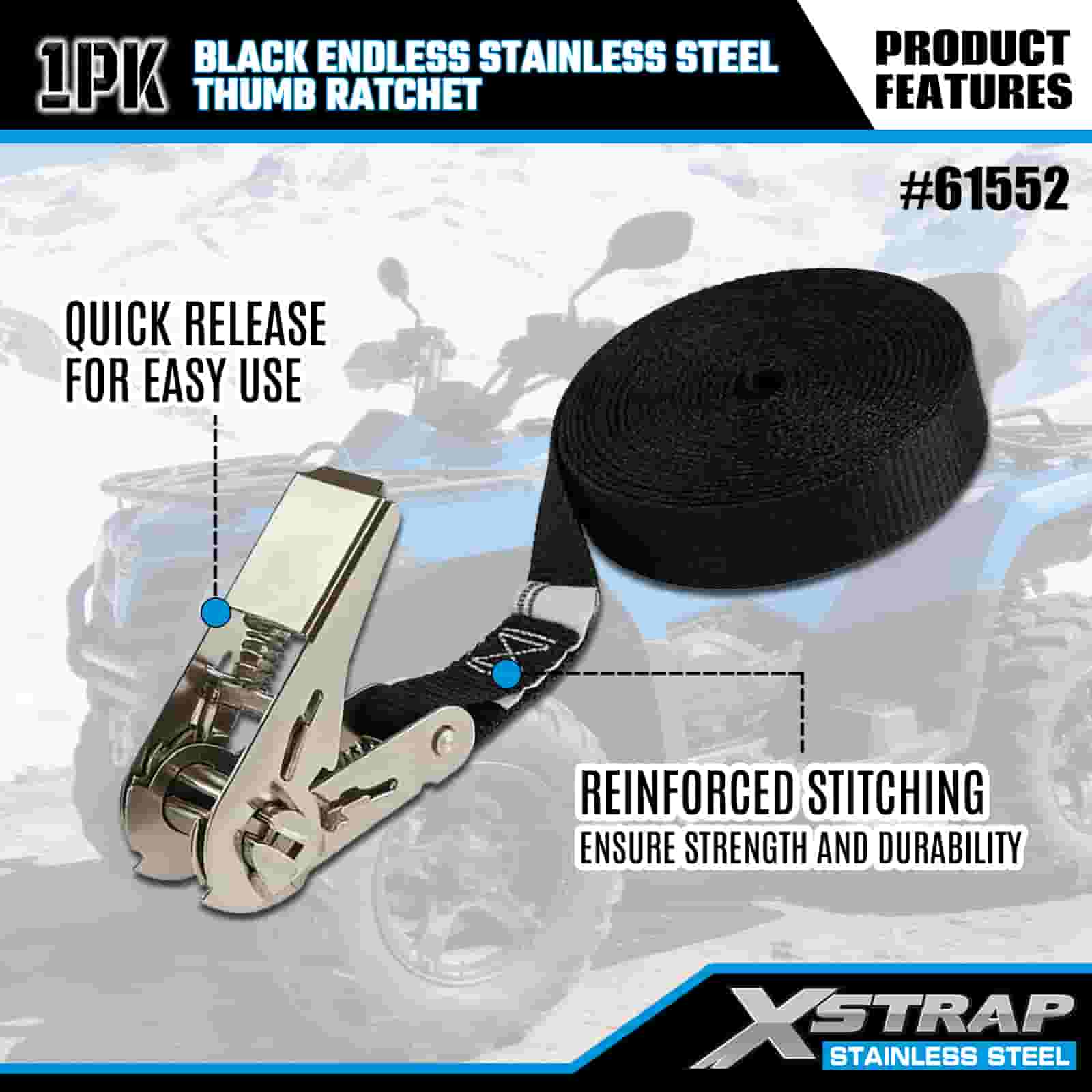 Xstrap Czarna, niekończąca się grzechotka kciukowa ze stali nierdzewnej, poliestrowy pasek zapadkowy 1” x 15 cali, paski zabezpieczające ładunek o udźwigu 500 funtów do przyczepy, przyczepy z płaską platformą, łodzi narciarskiej, małego samochodu, ciężkiego sprzętu.