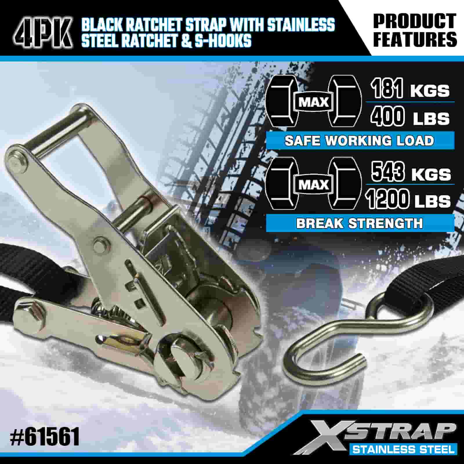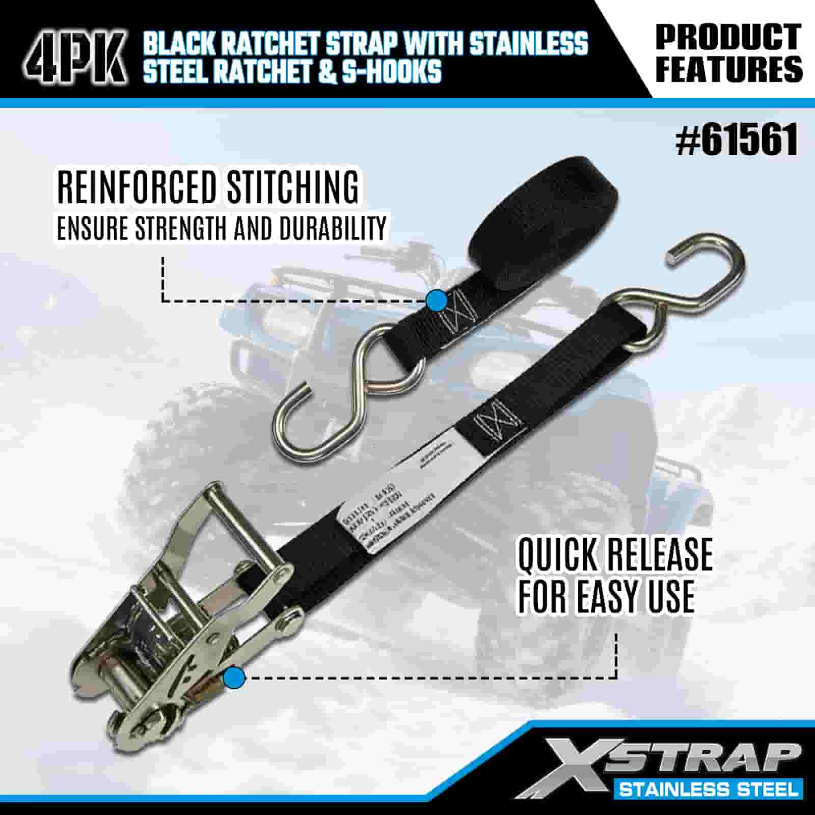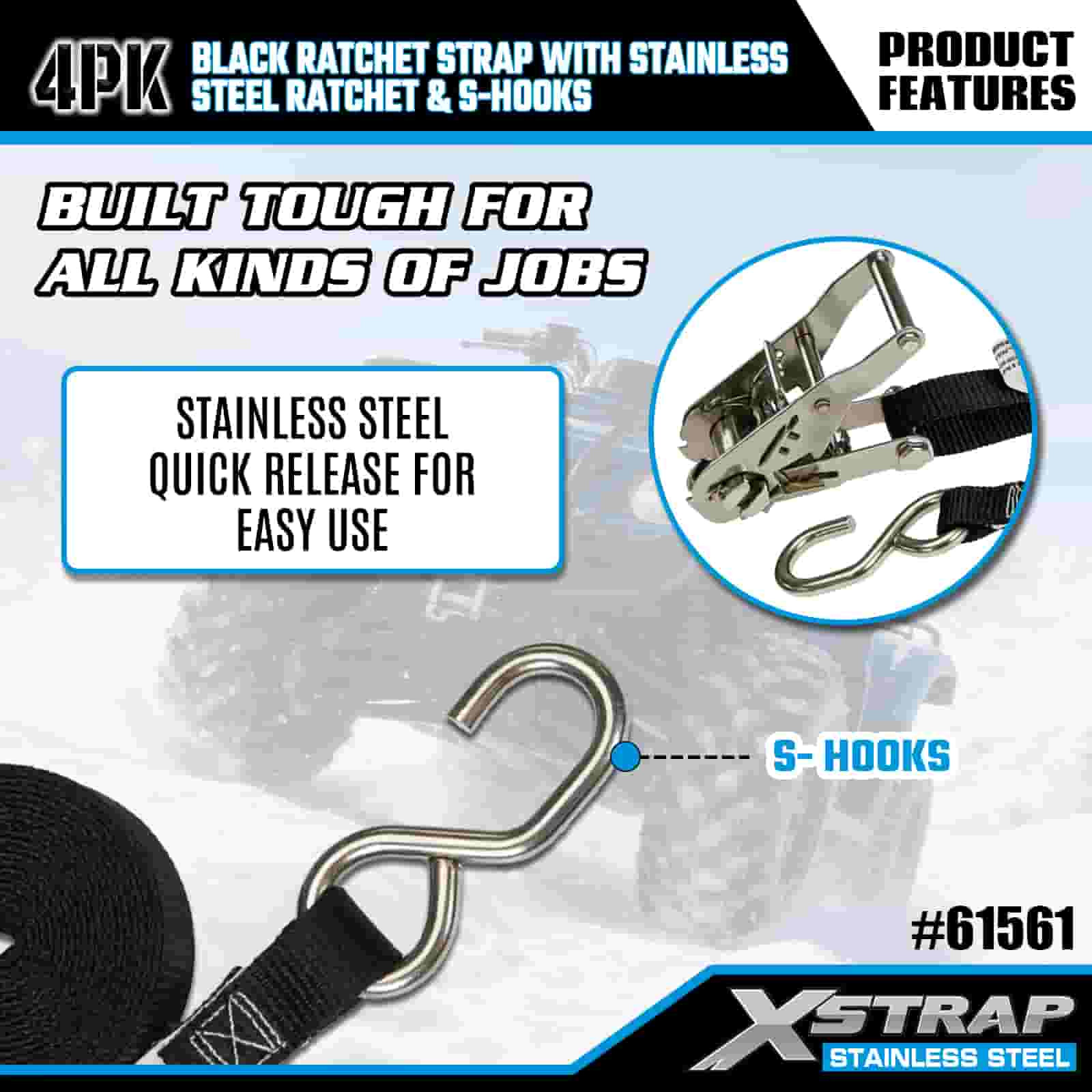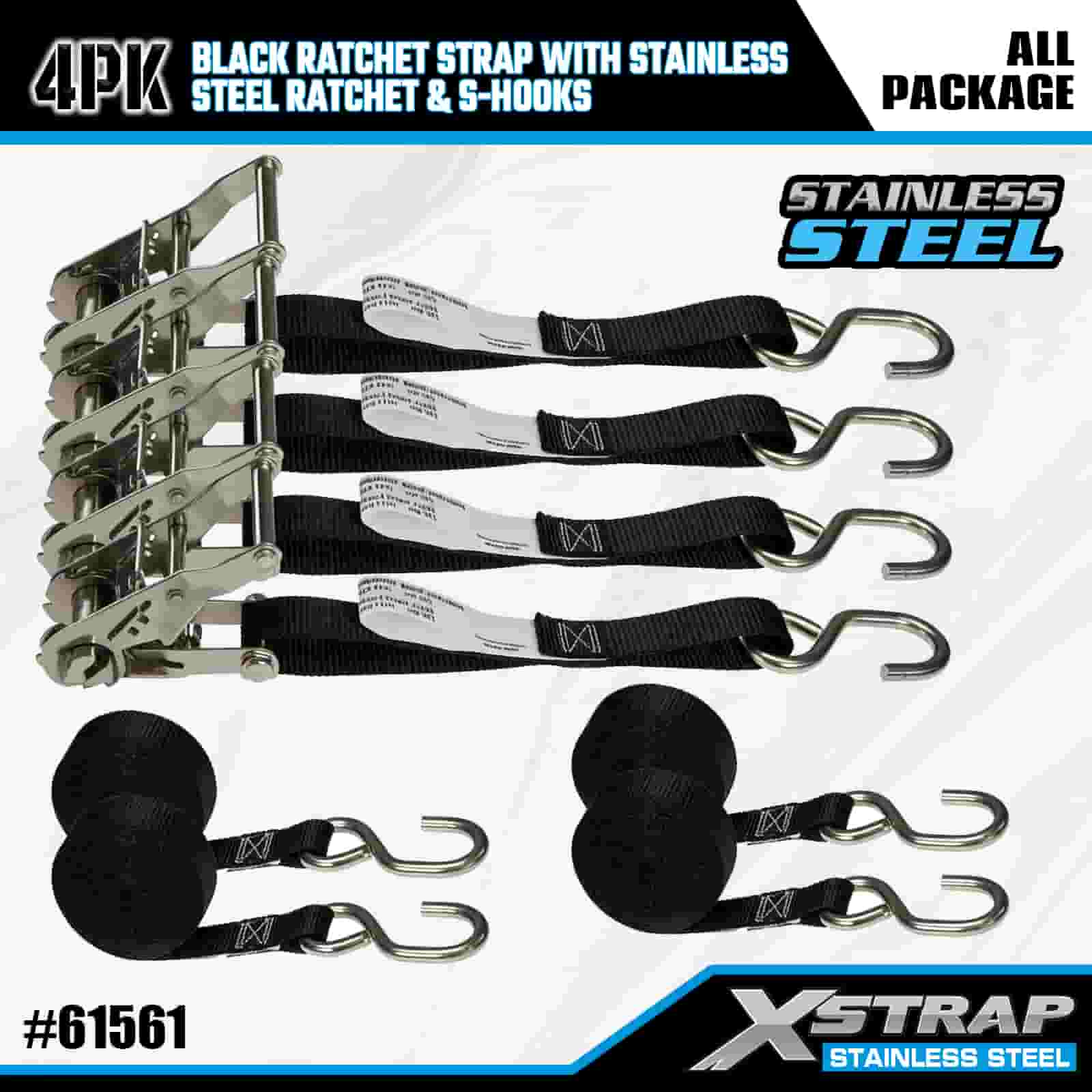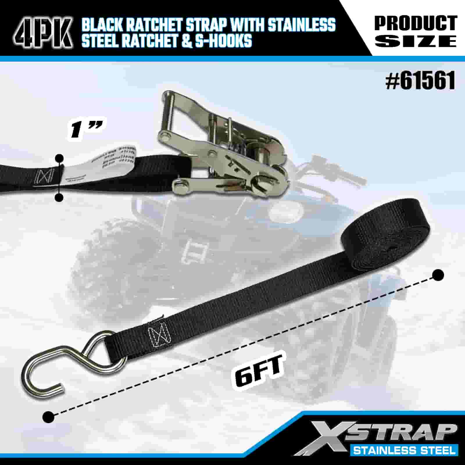 Czarny pasek zapadkowy Xstrap 4PK z grzechotką ze stali nierdzewnej i haczykami S, poliestrowy pasek mocujący o wymiarach 1” x 6 stóp, paski mocujące ładunek o udźwigu 400 funtów z haczykami S do przyczepy, przyczepy z płaską platformą, łodzi narciarskiej, małego samochodu, ciężkiego sprzętu.