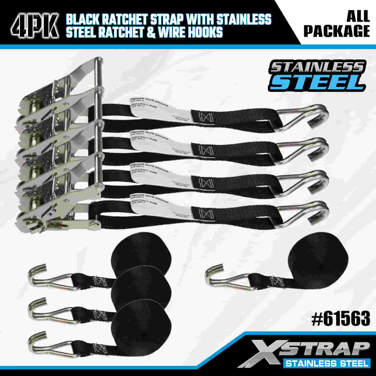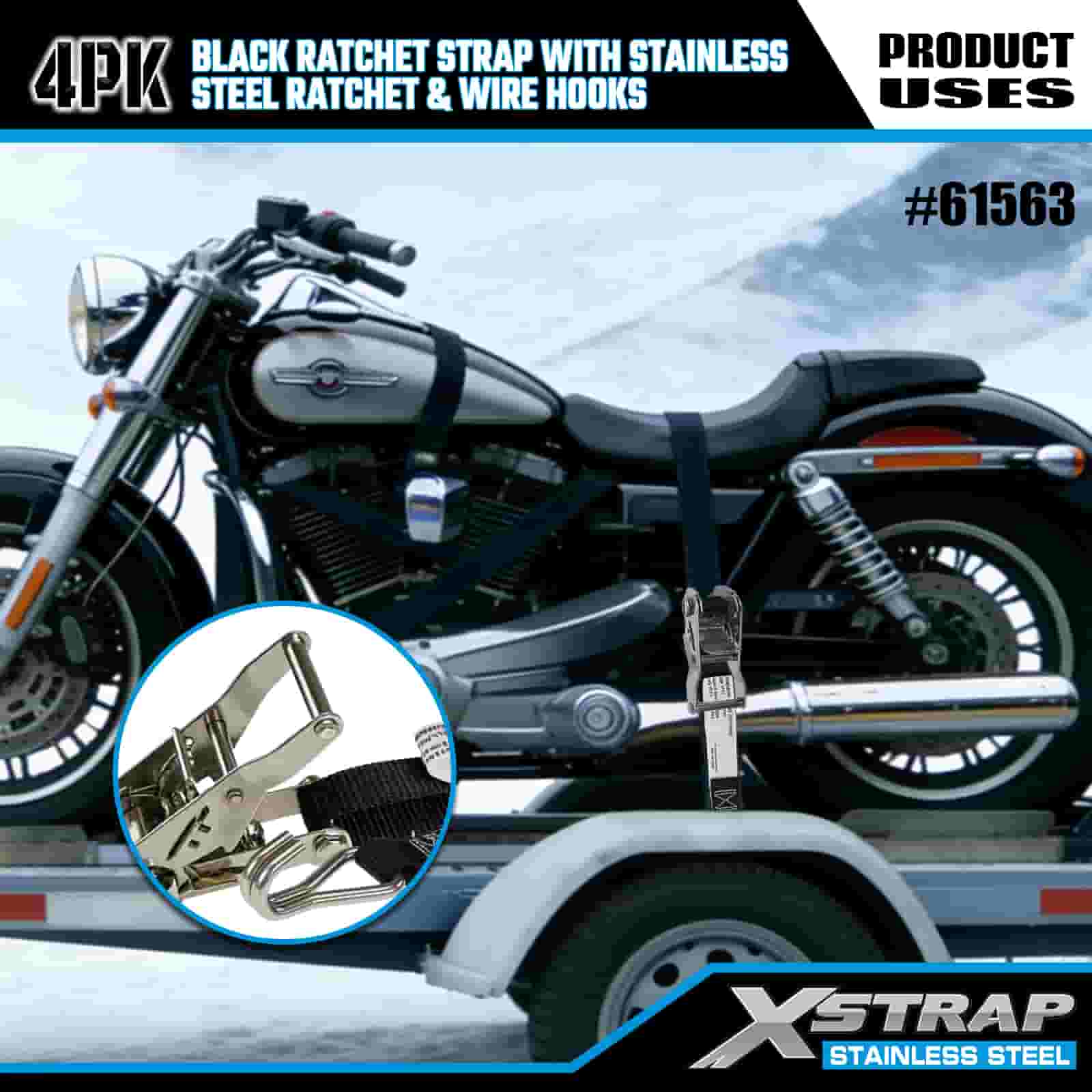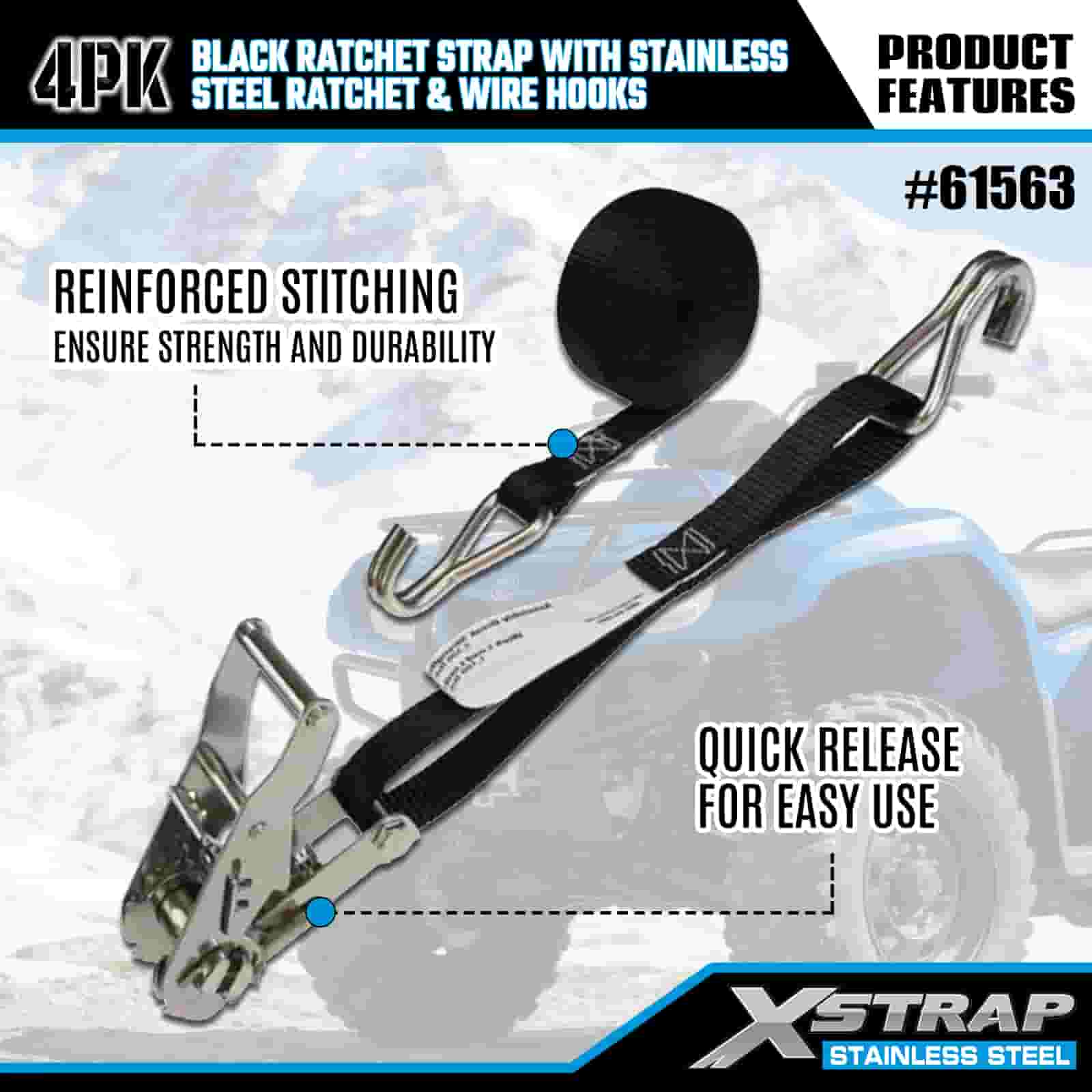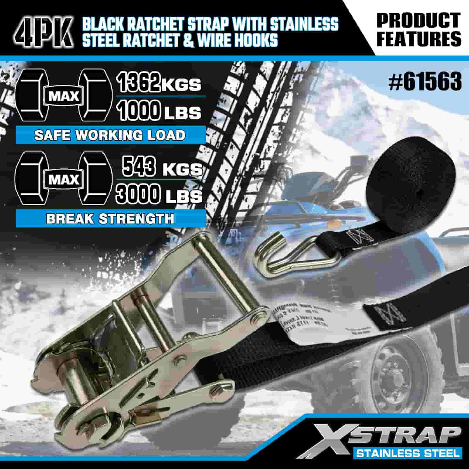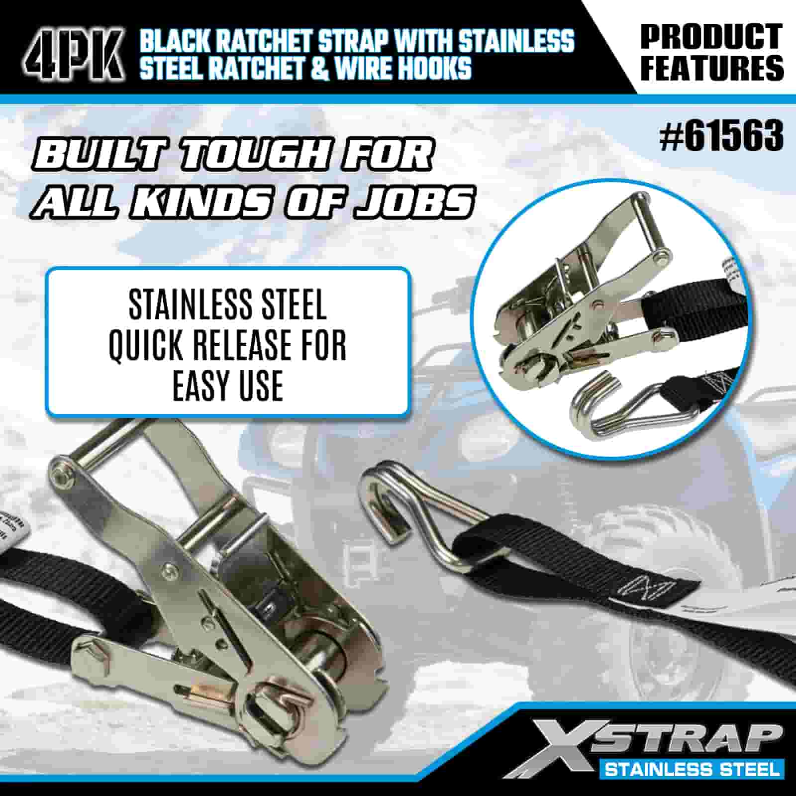 Czarny pasek zapadkowy Xstrap 4PK z grzechotką ze stali nierdzewnej i haczykami z drutu, poliestrowy pasek mocujący o wymiarach 1” x 10 stóp, pasek zapadkowy o udźwigu 1000 funtów, pasy zabezpieczające do mocowania ładunku z haczykami drucianymi do przyczepy, przyczepy z płaską platformą, łodzi narciarskiej, małego samochodu, ciężkiego sprzętu.