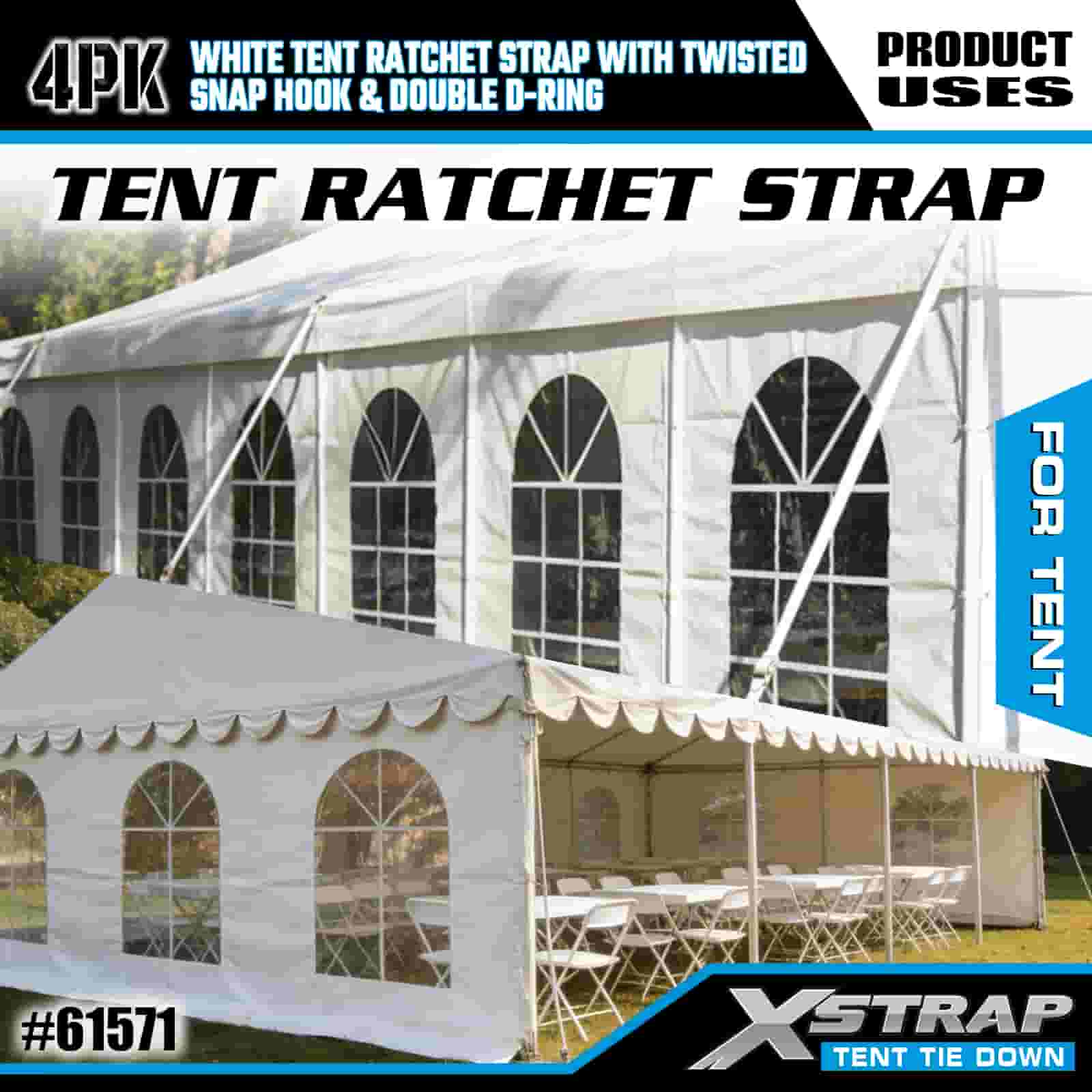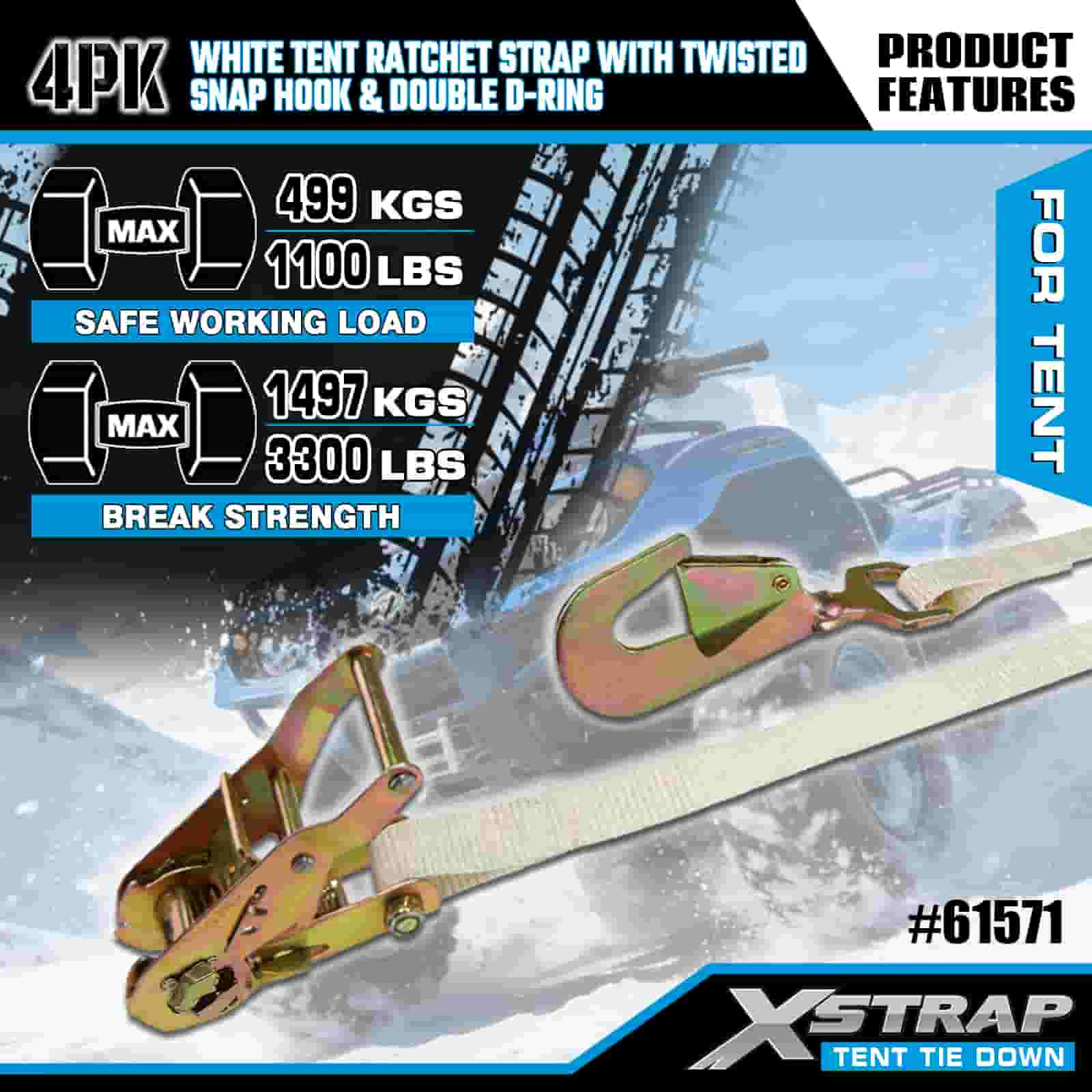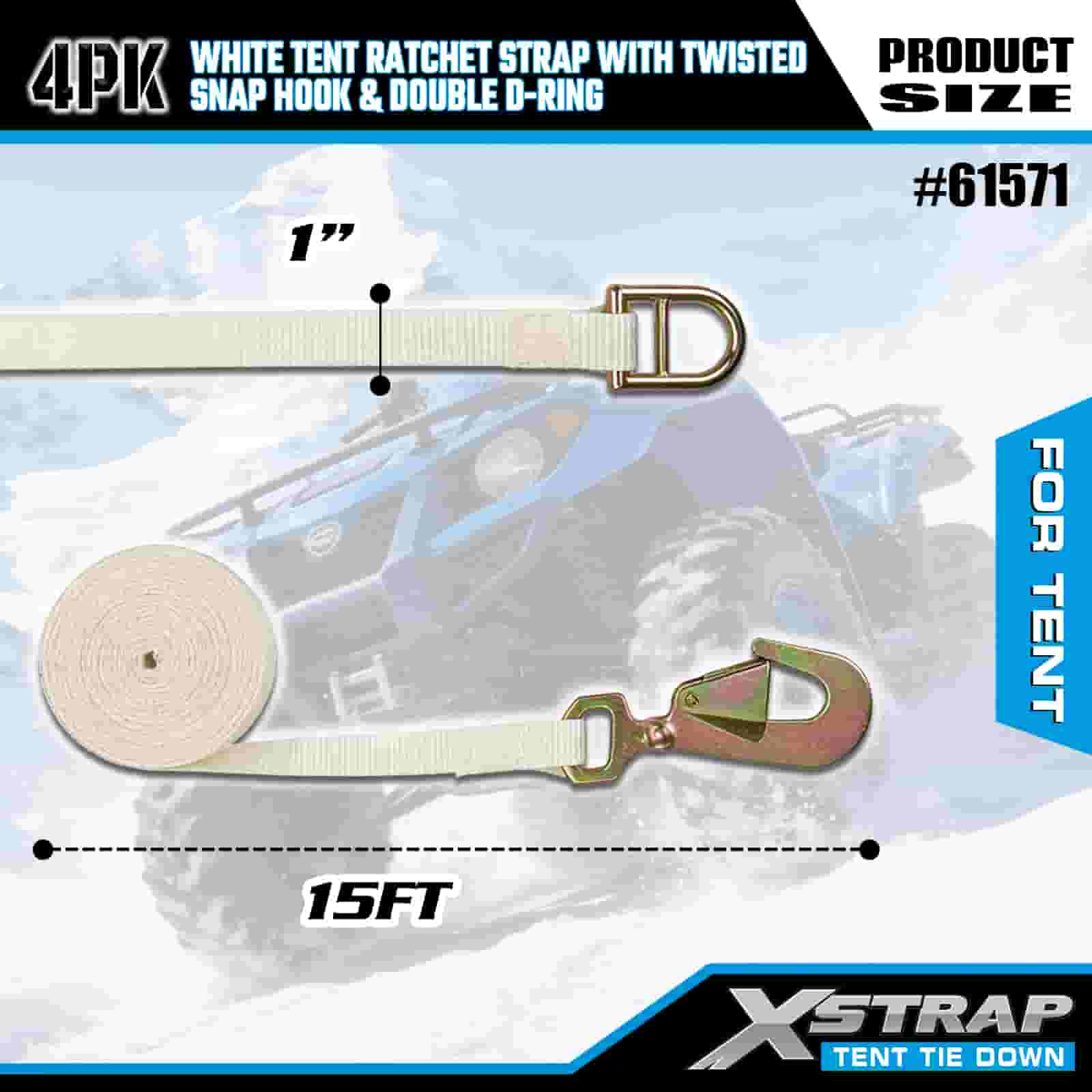 Biały pasek zapadkowy do namiotu Xstrap 4PK ze skręconym karabińczykiem i podwójnym pierścieniem D, poliestrowy pasek do mocowania 1” x 15 cali, pasy zabezpieczające do mocowania ładunku o udźwigu 1100 funtów ze skręconym karabińczykiem i podwójnym pierścieniem D do kontroli ładunku, mocowanie namiotu.