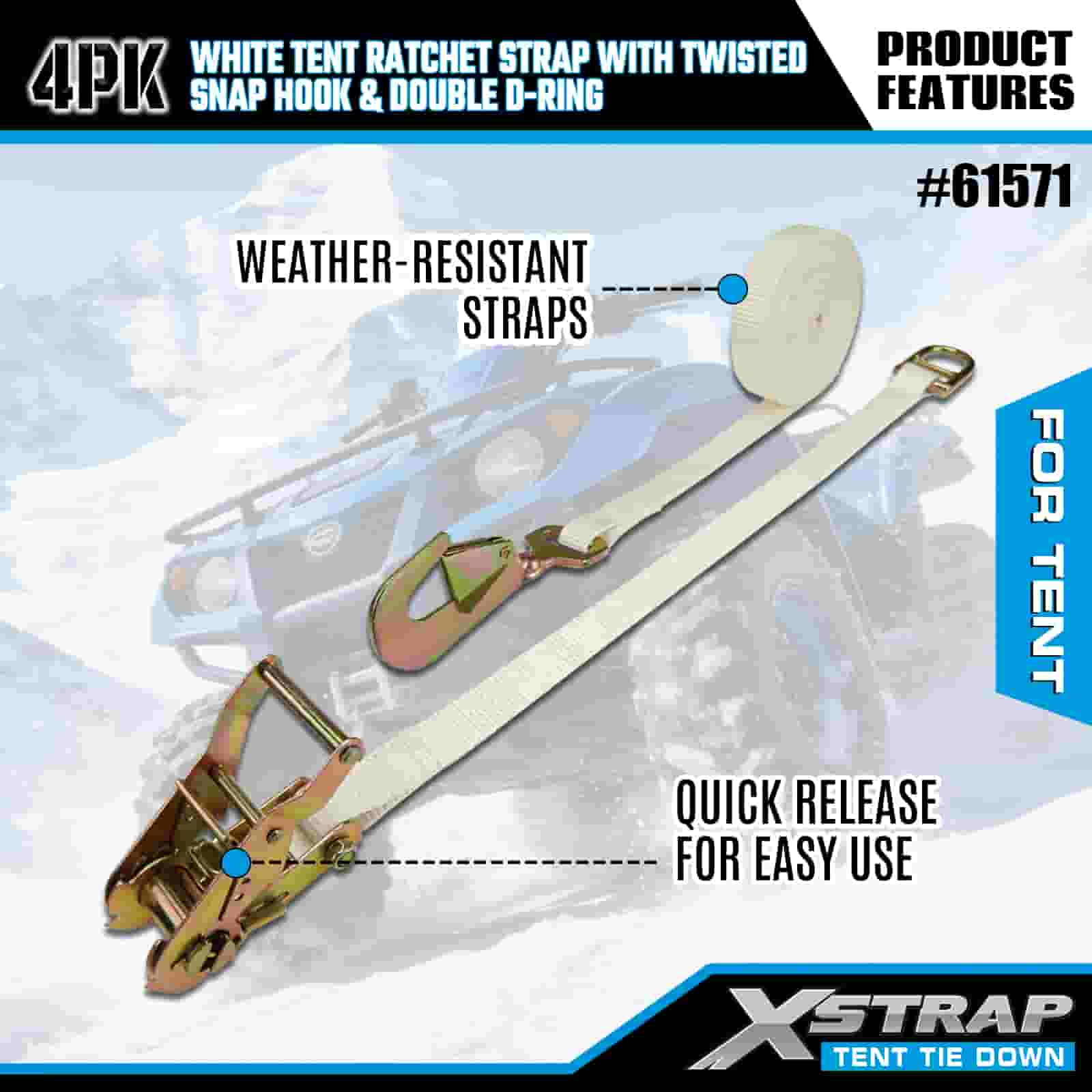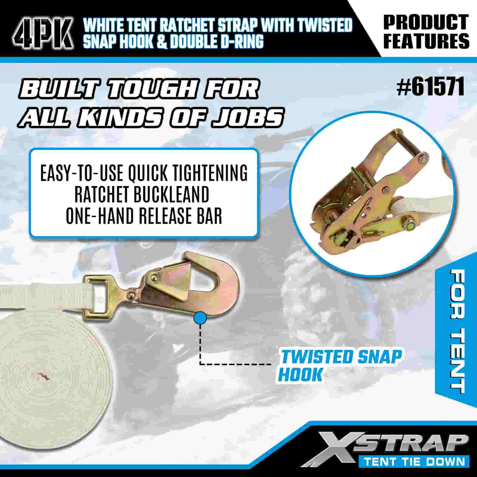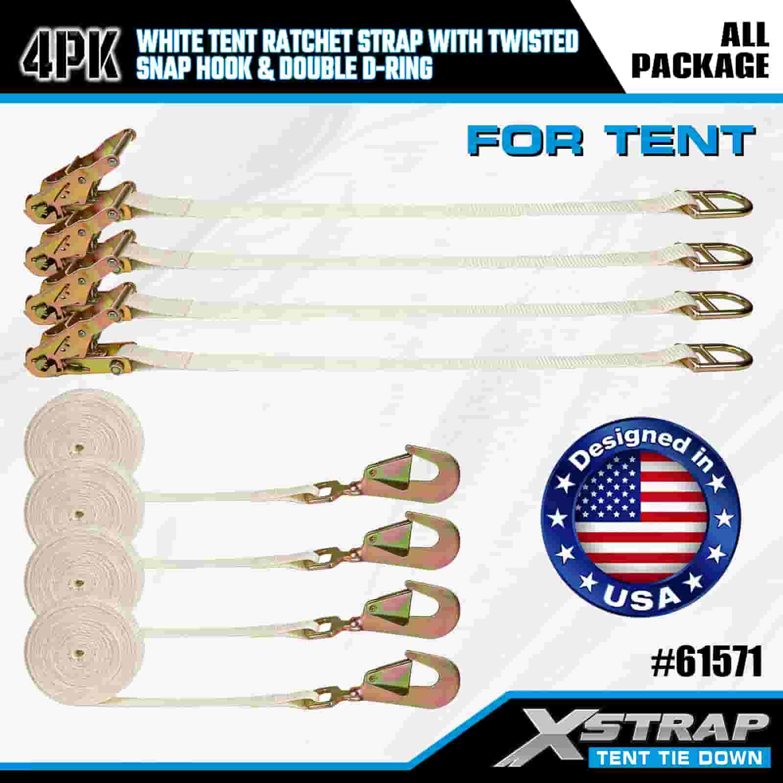 Biały pasek zapadkowy do namiotu Xstrap 4PK ze skręconym karabińczykiem i podwójnym pierścieniem D, poliestrowy pasek do mocowania 1” x 15 cali, pasy zabezpieczające do mocowania ładunku o udźwigu 1100 funtów ze skręconym karabińczykiem i podwójnym pierścieniem D do kontroli ładunku, mocowanie namiotu.