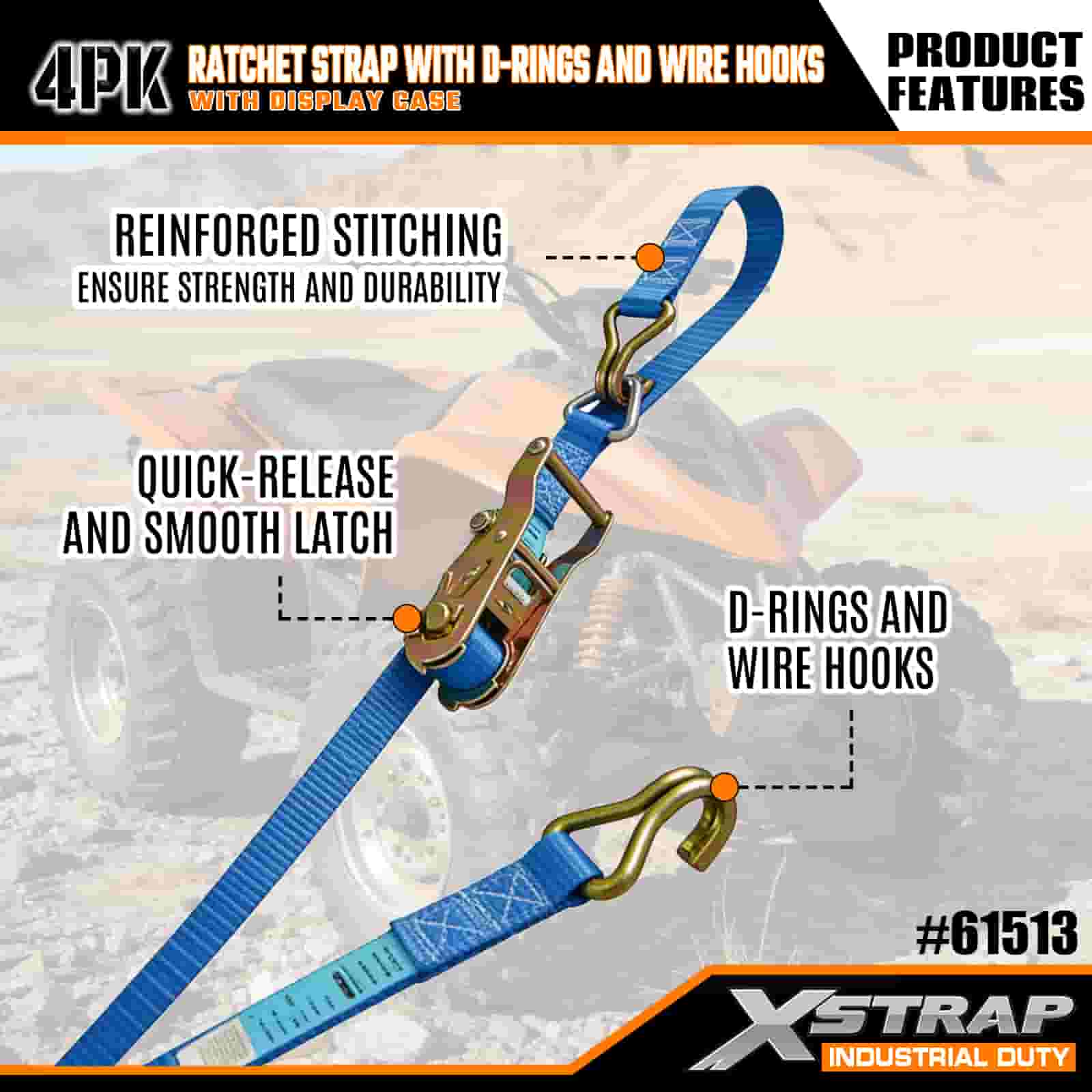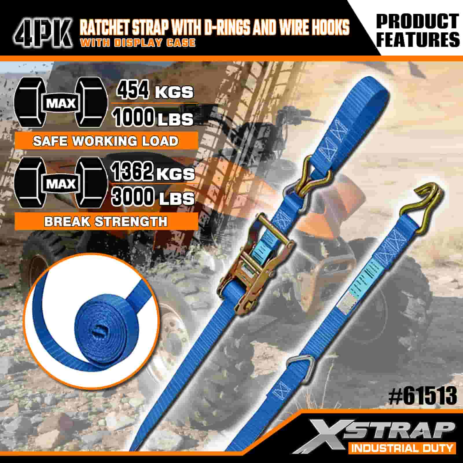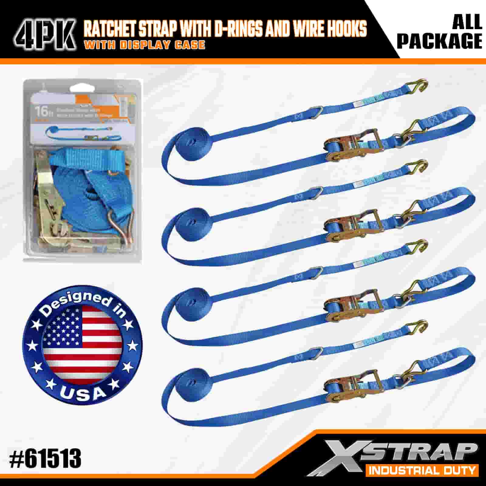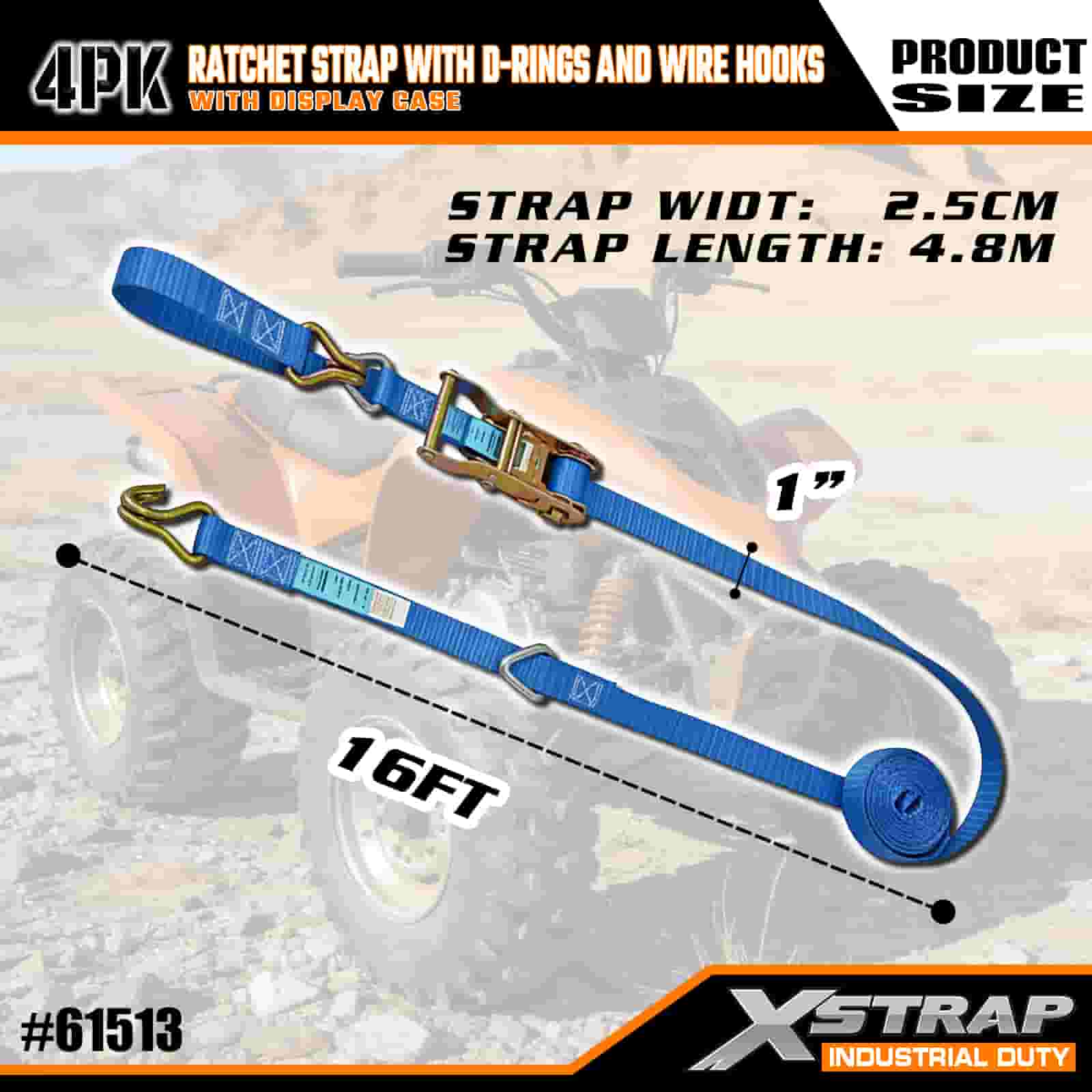 Pasek zapadkowy Xstrap, 4 sztuki z pierścieniami w kształcie litery D i haczykami z drutu, poliestrowy pasek do mocowania o wymiarach 1” x 16 cali, pasek zapadkowy o udźwigu 1000 funtów, pasy zabezpieczające do mocowania ładunku z haczykami drucianymi dla poważnych profesjonalistów do zabezpieczania przyczepy towarowej, przyczepy z platformą, łodzi narciarskiej i małego samochodu.