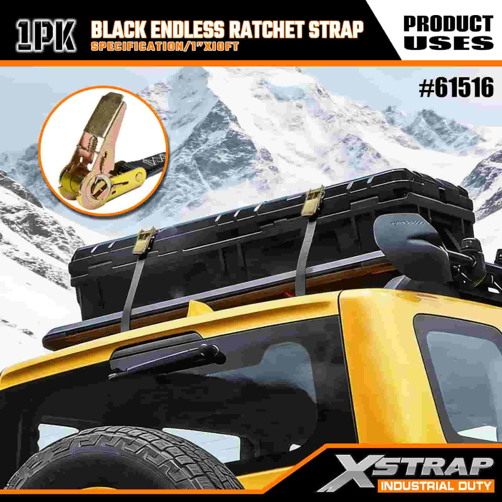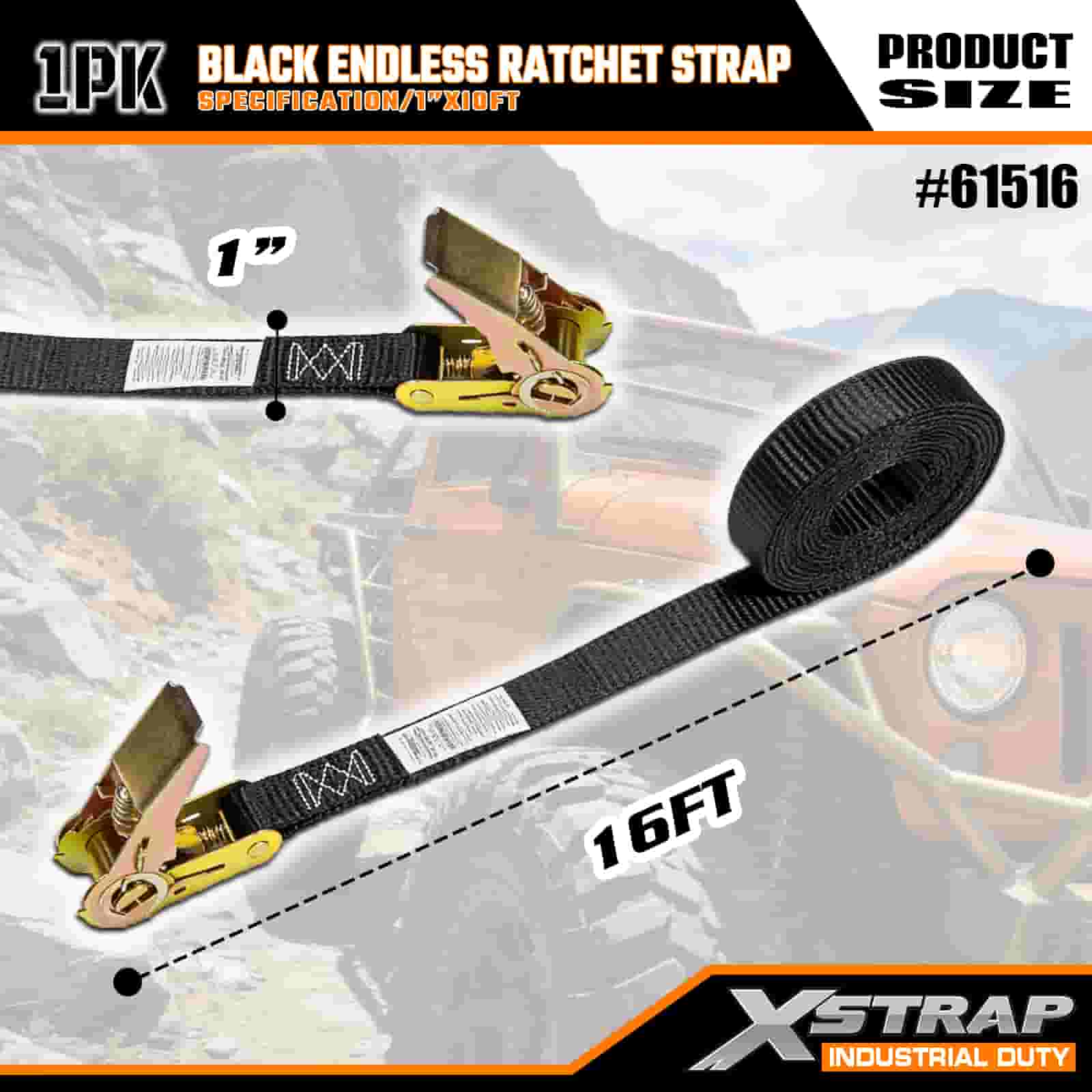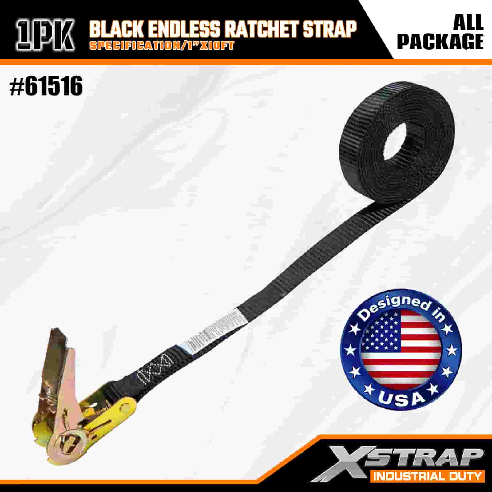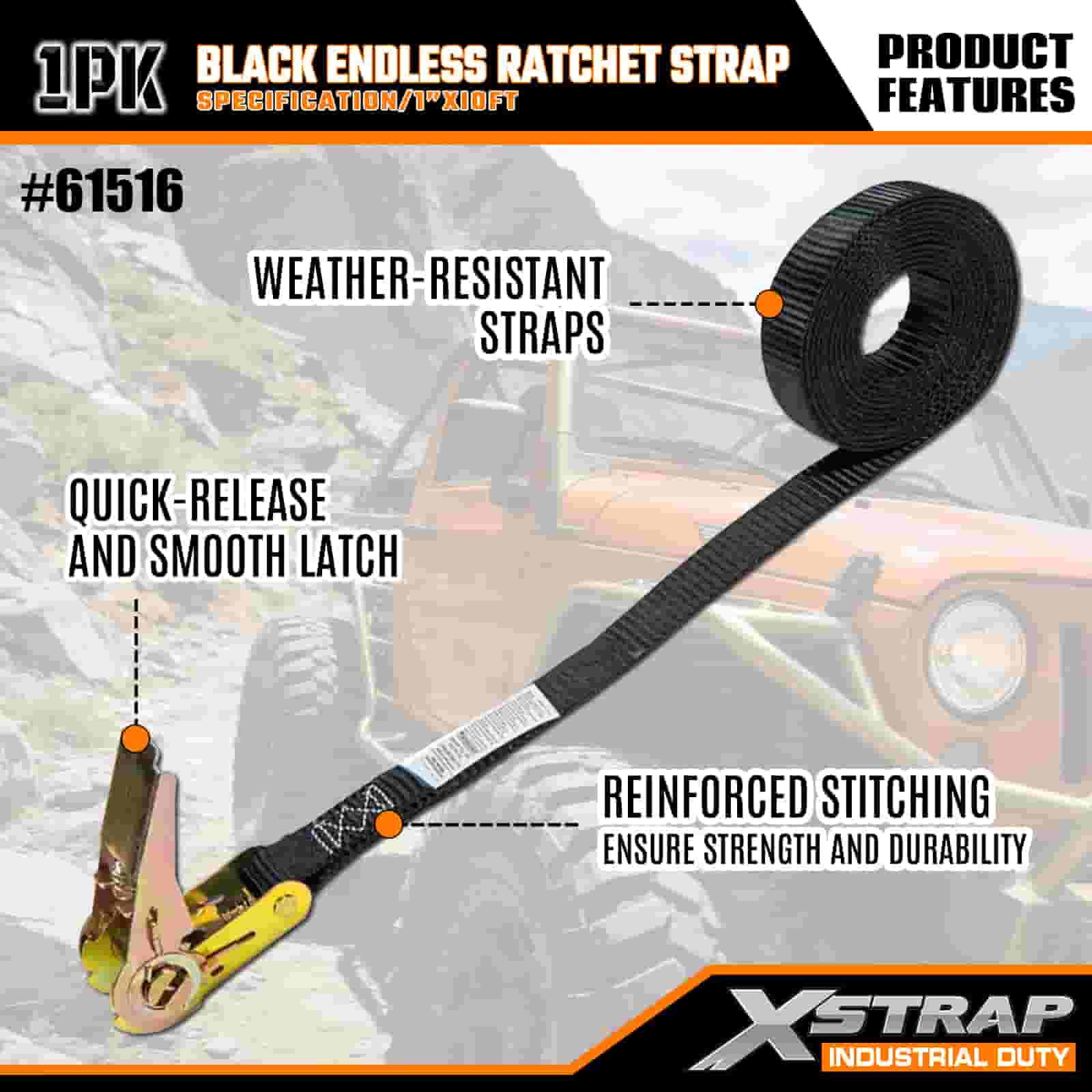Czarny, niekończący się pasek zapadkowy Xstrap, poliestrowy pasek do wiązania o wymiarach 1” x 10 cali, pasek zapadkowy o udźwigu 500 funtów, pasy zabezpieczające dla poważnych profesjonalistów do zabezpieczania przyczepy towarowej, przyczepy z platformą, łodzi narciarskiej, małego samochodu.