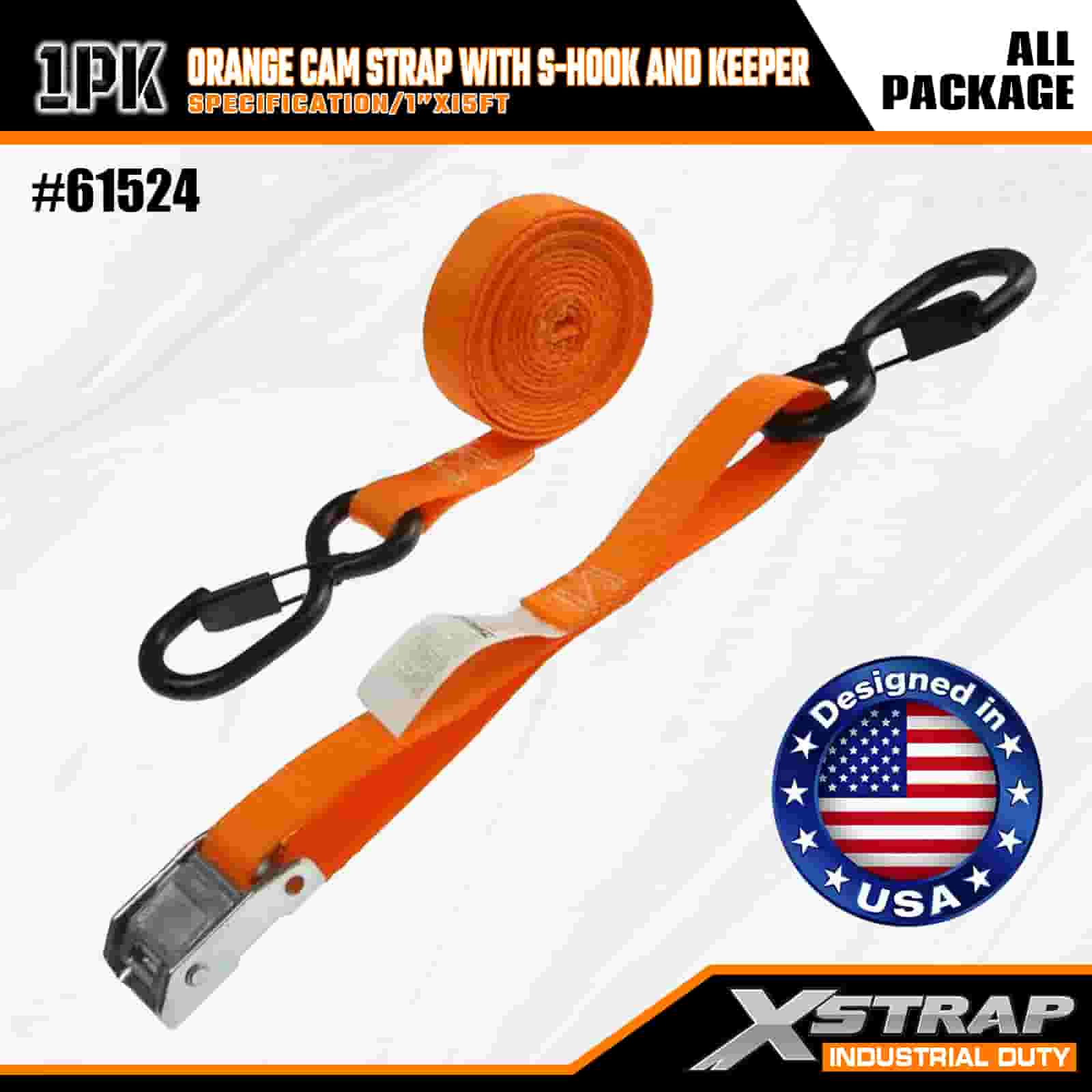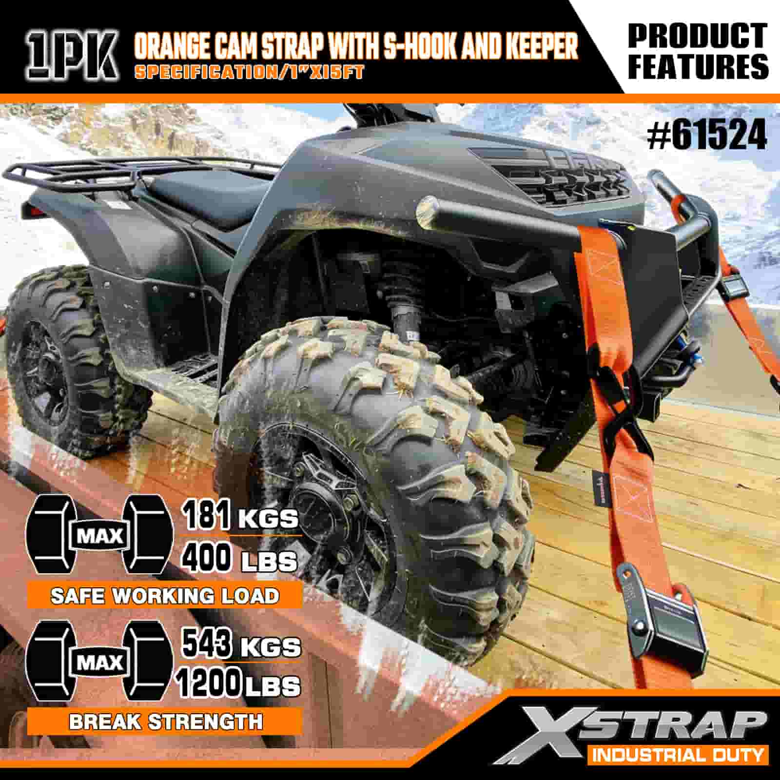 Pasek kamerowy Xstrap Qrange z haczykiem w kształcie litery S i uchwytem, poliestrowy pasek mocujący o wymiarach 1” x 15 cali, pasek zapadkowy, pasy zabezpieczające ładunek o udźwigu 400 funtów z hakami zabezpieczającymi S dla poważnych profesjonalistów do zabezpieczania przyczepy towarowej, przyczepy z platformą, łodzi narciarskiej, małego samochodu.