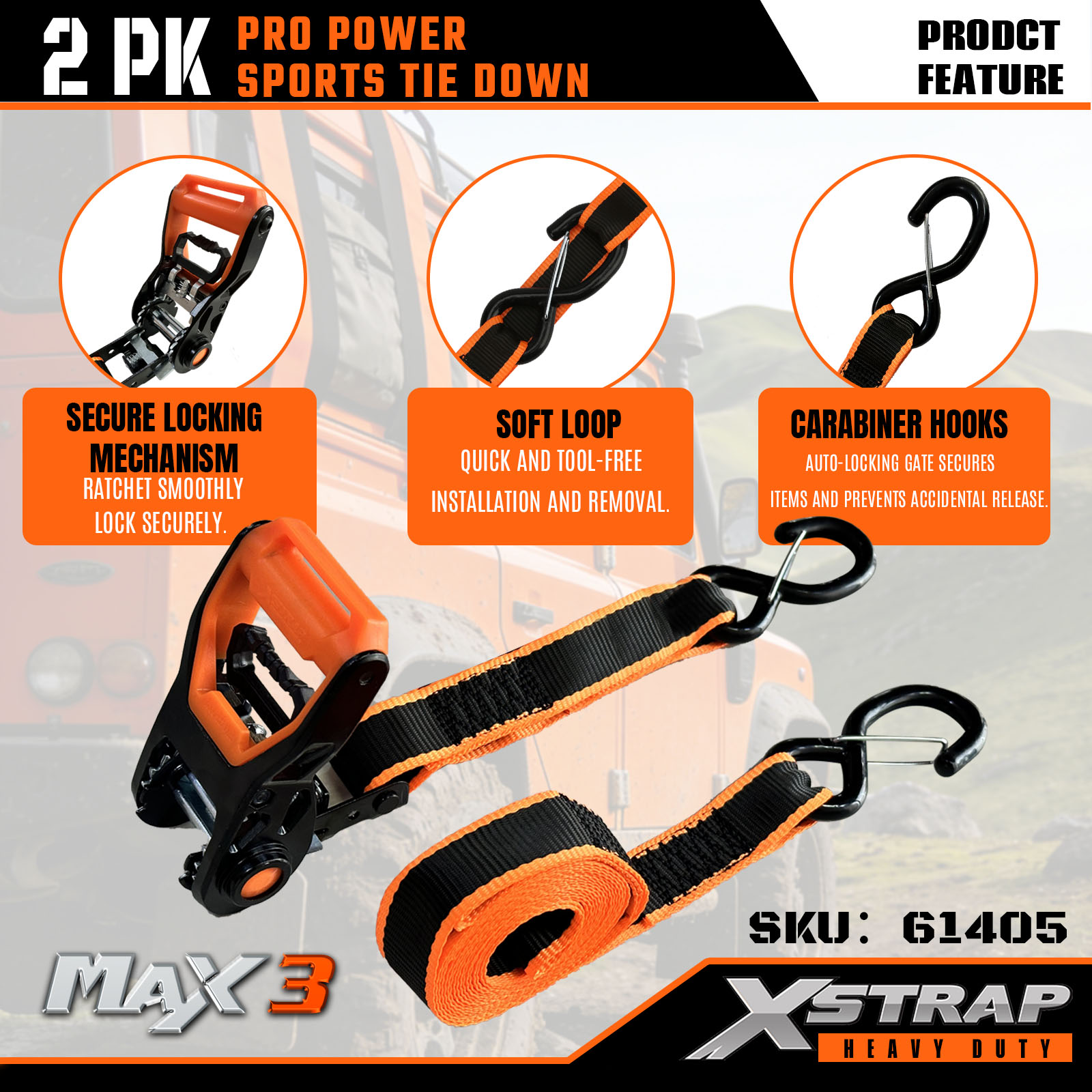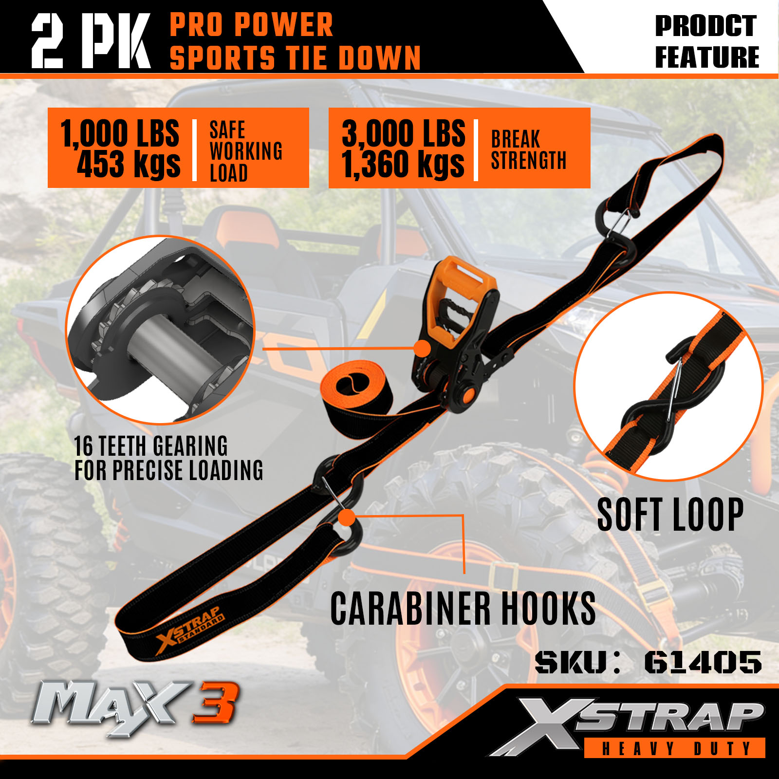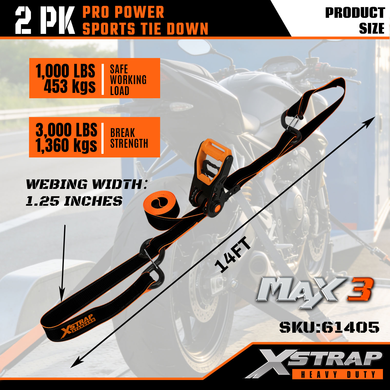 Xstrap 2 Pack PRO Power Sports paski do mocowania, 1-1/4” x 14 cali poliestrowy pasek do mocowania, ciągniony pasek zapadkowy, paski zabezpieczające ładunek o udźwigu 1000 funtów z karabińczykami do samochodów ciężarowych, SUV-ów i motocykli na bagażnikach samochodowych.