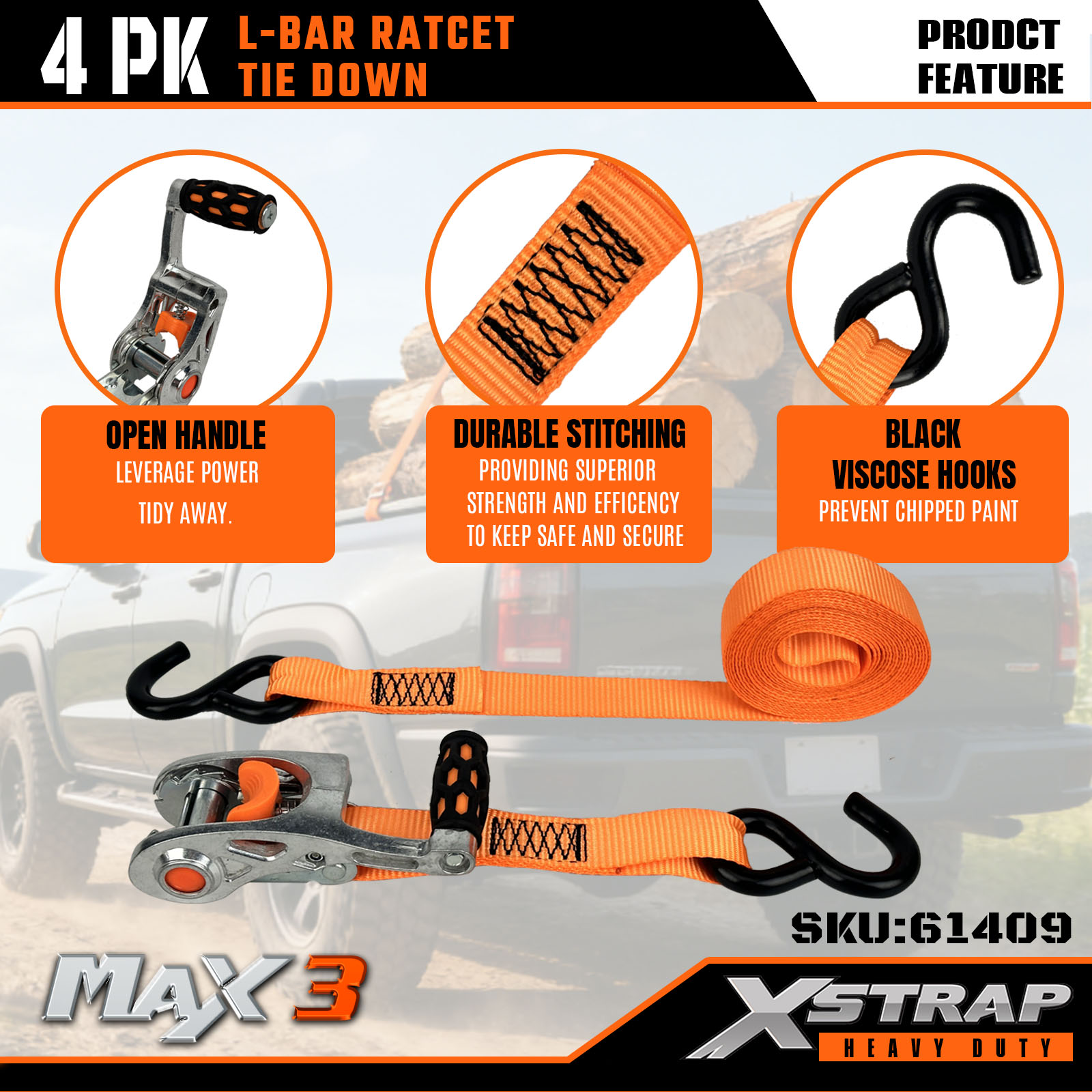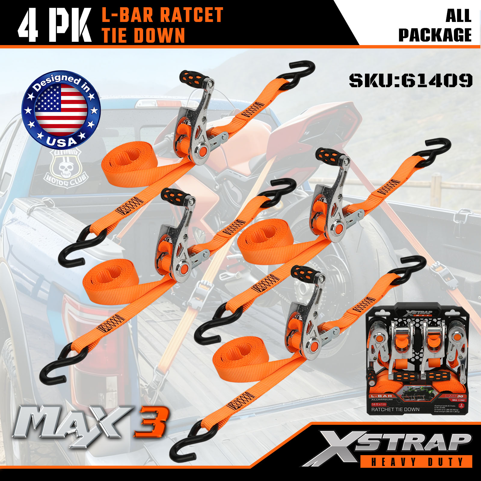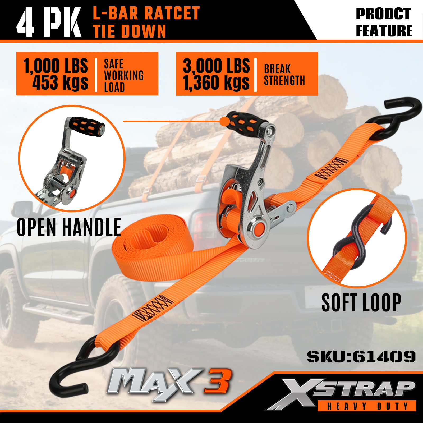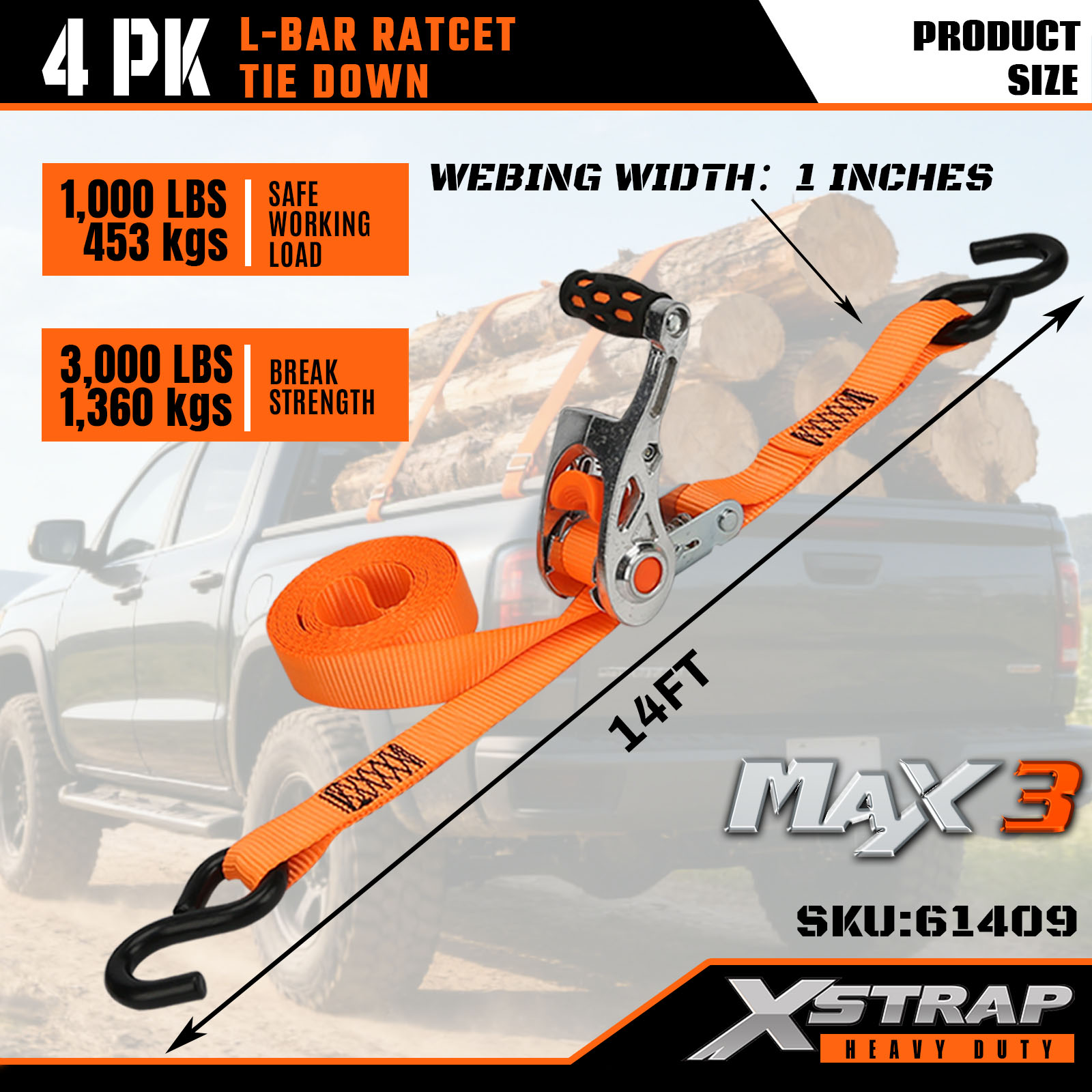 Xstrap 4 paski do mocowania drążka w kształcie litery L, 1” x 14 cali poliestrowy pasek do mocowania z grzechotką, udźwig 1000 funtów paski zabezpieczające ładunek z haczykami S do samochodów ciężarowych, SUV-ów i motocykli.