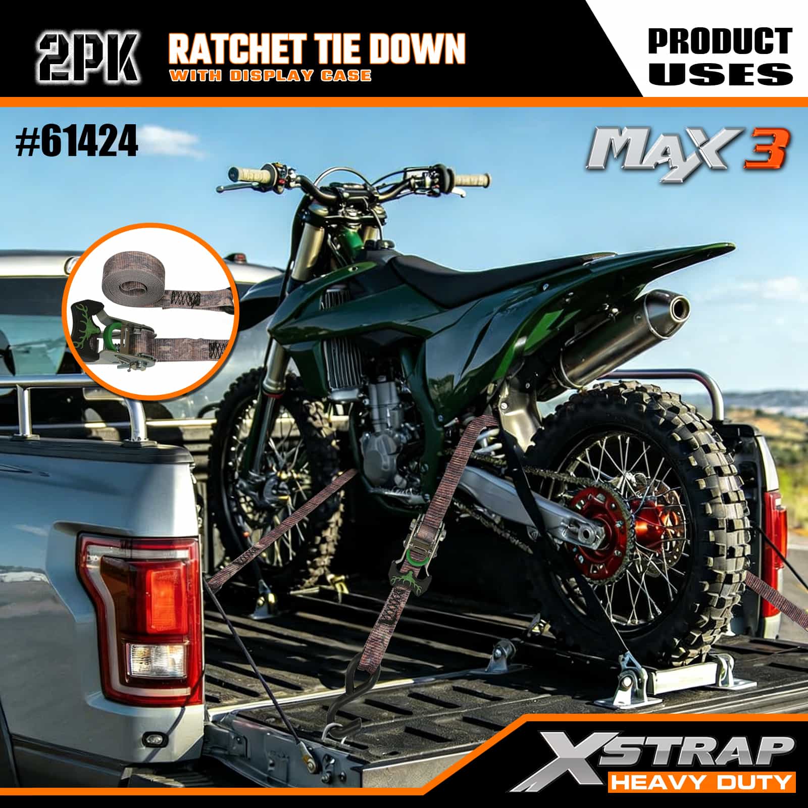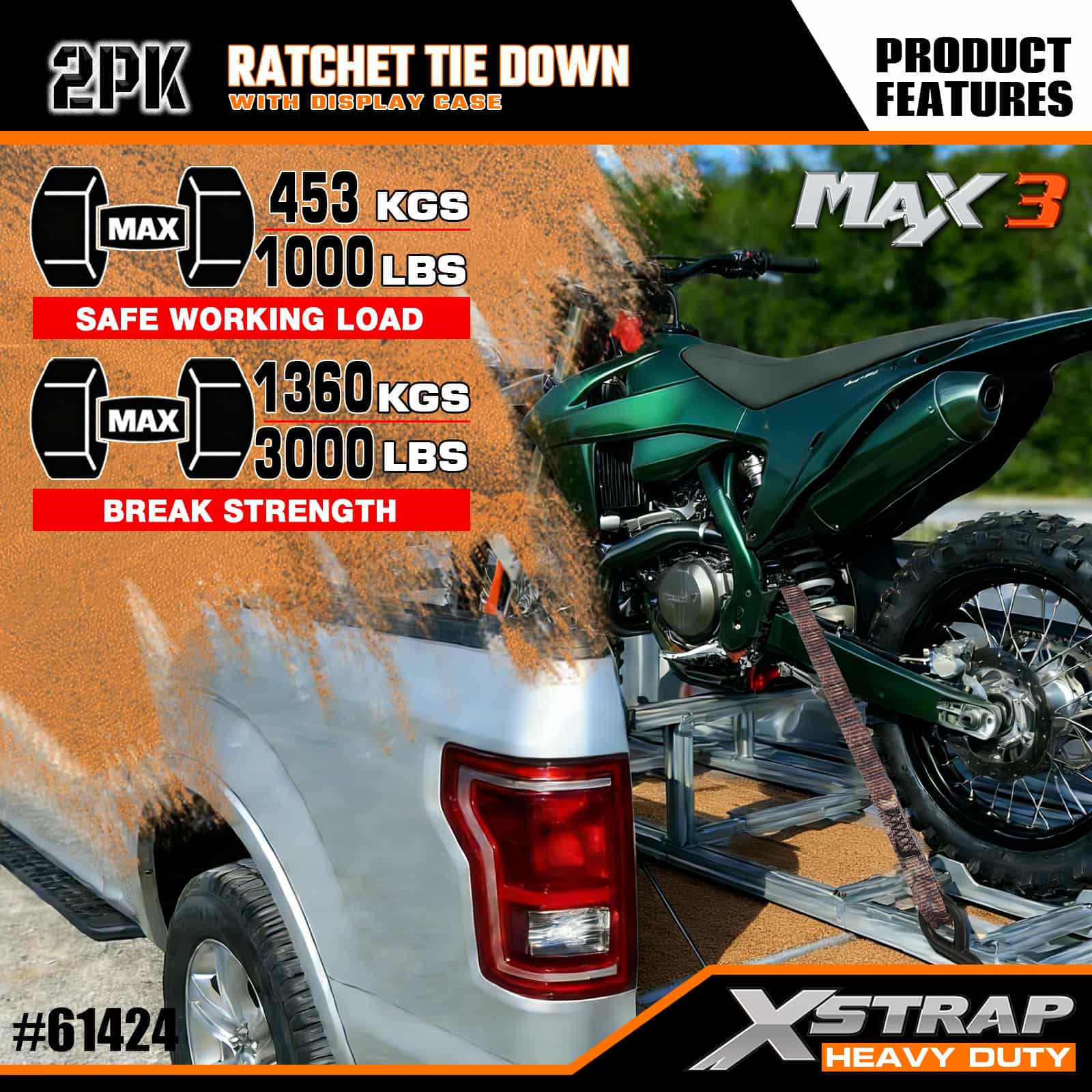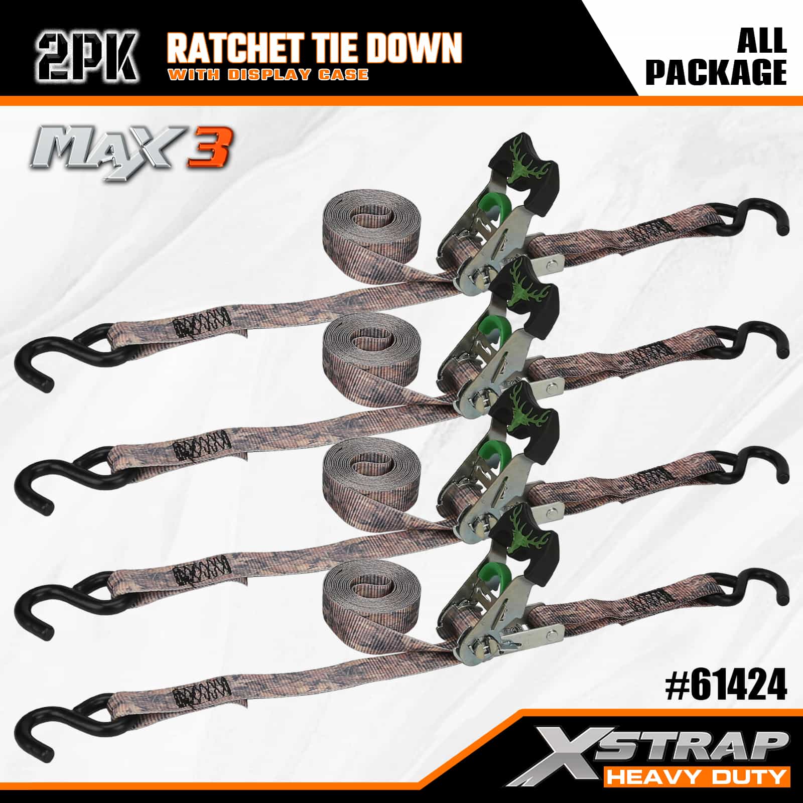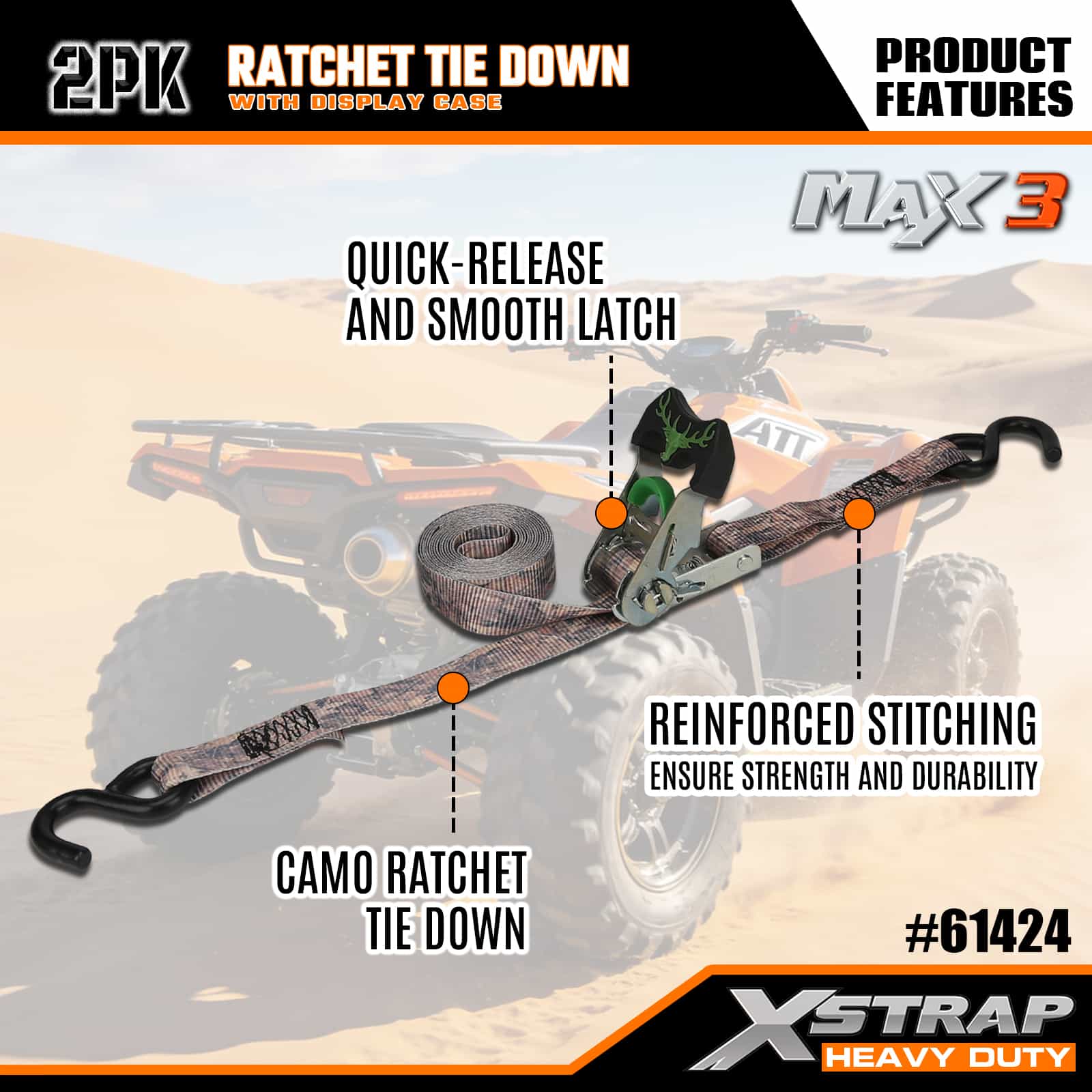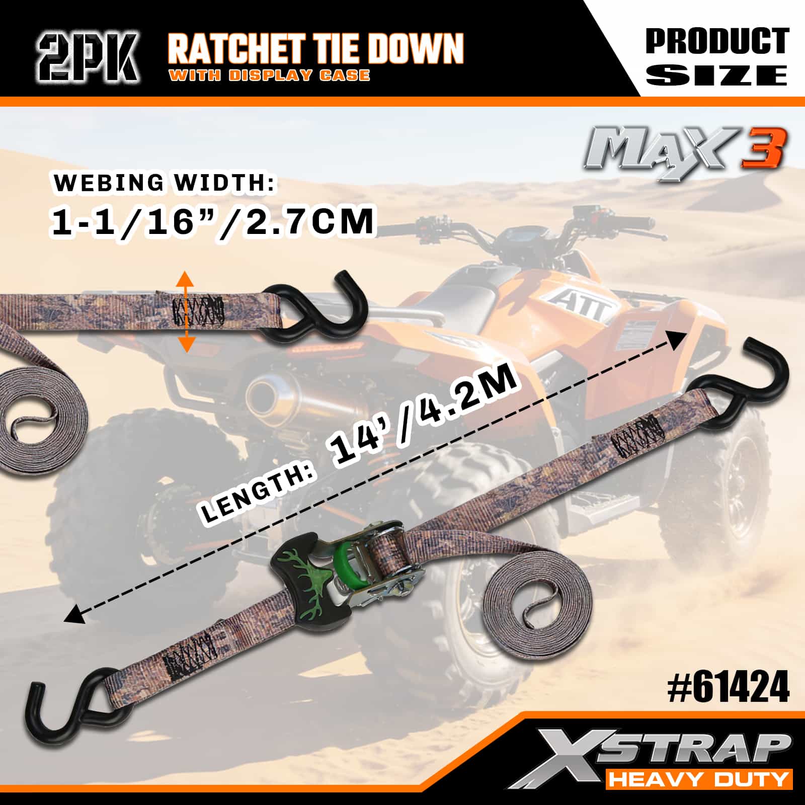 Xstrap 2 sztuki mocowania z grzechotką w kolorze kamuflażowym, 1-1/16” x 14 cali poliestrowy pasek do ściągania, pasek zapadkowy o udźwigu 1000 funtów z haczykami w kształcie litery S do pickupa, SUV-a, bagażnika samochodowego, motocykla, lekkiej łodzi rybackiej, skutera wodnego, skutera śnieżnego, traktorka trawnikowego.