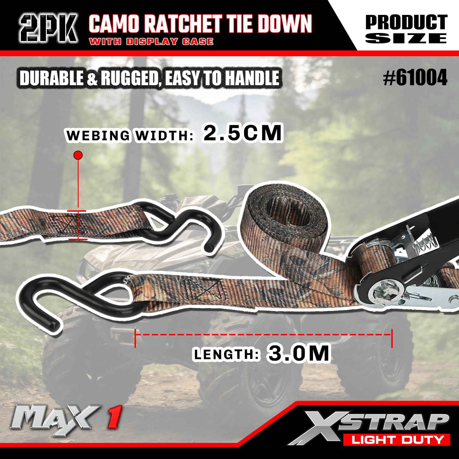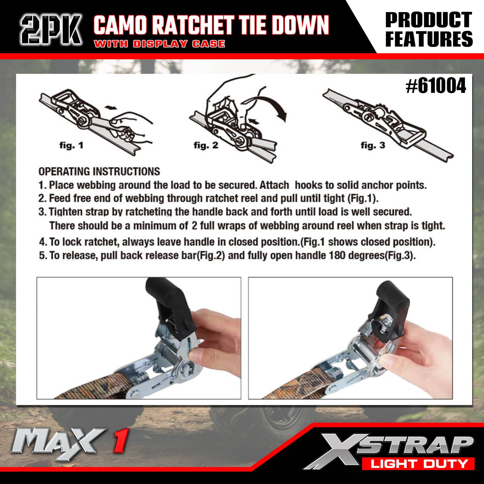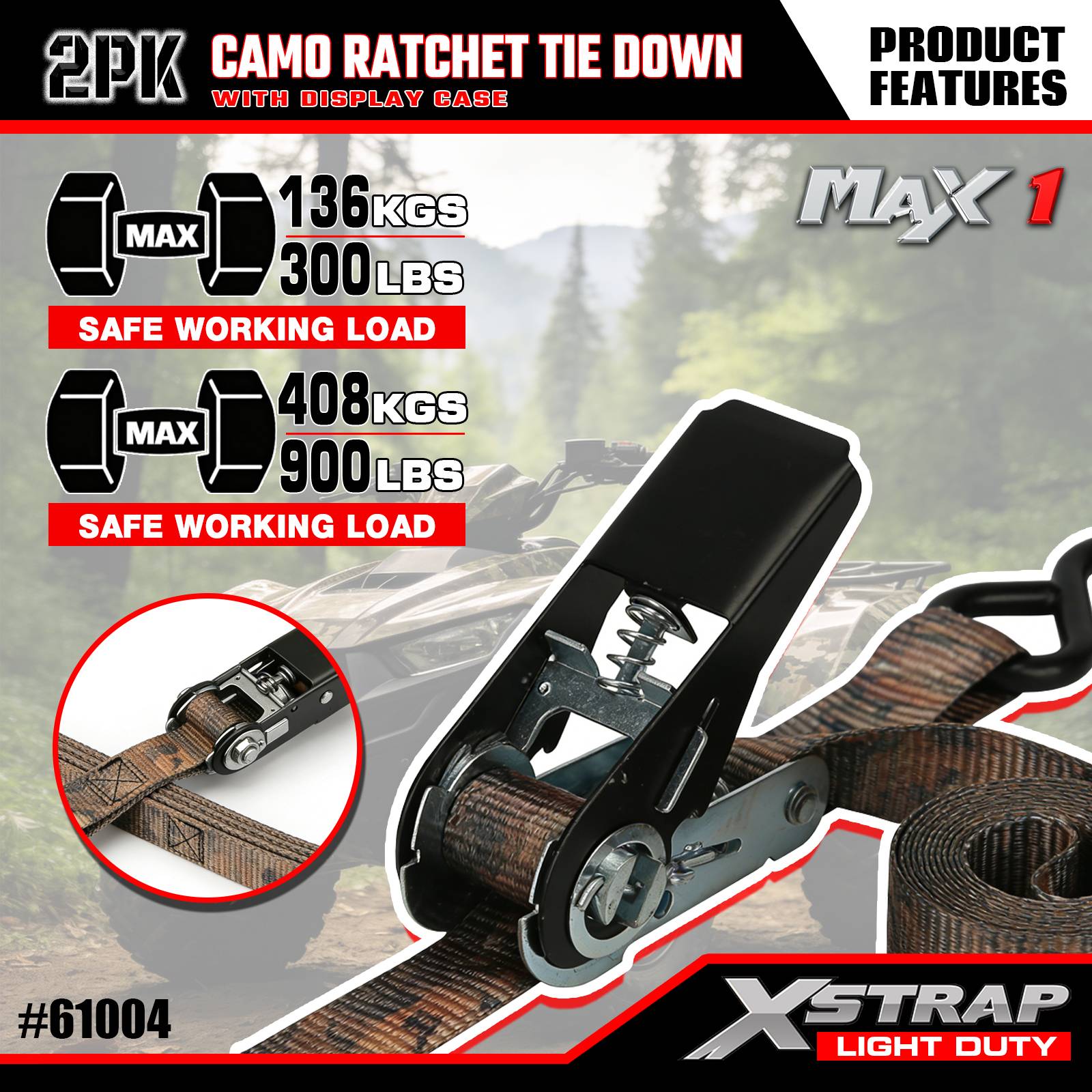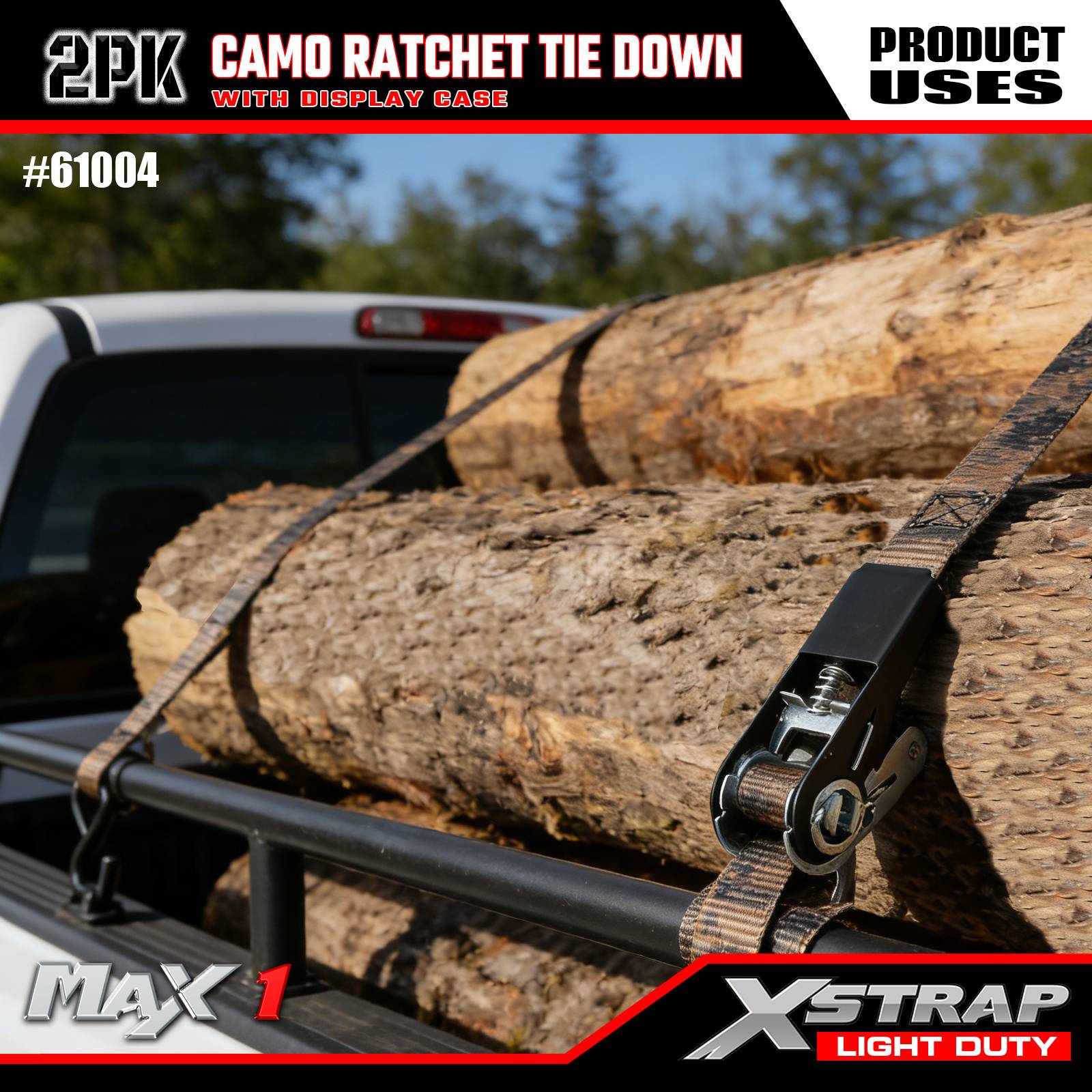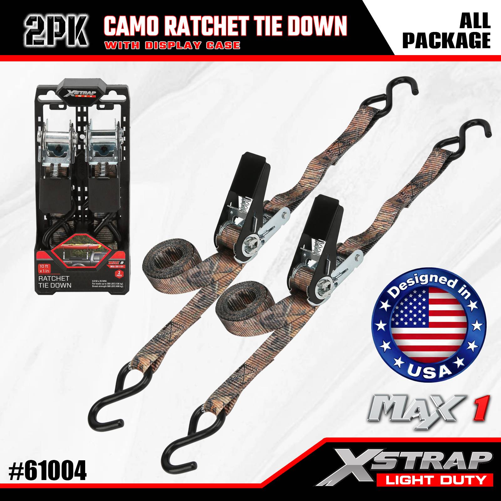 Zestaw 2 pasków mocujących z mechanizmem zapadkowym Xstrap, 1"x10' - Nasadka ładunkowa 300 funtów - Wytrzymałość na zerwanie 900 funtów - Pasy cargo do urządzeń ruchomych, sprzętu do pielęgnacji trawników, motocykli, kamuflażu