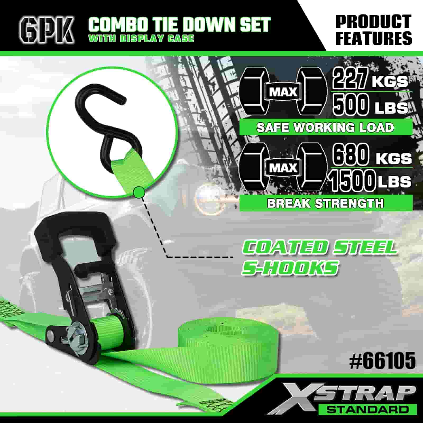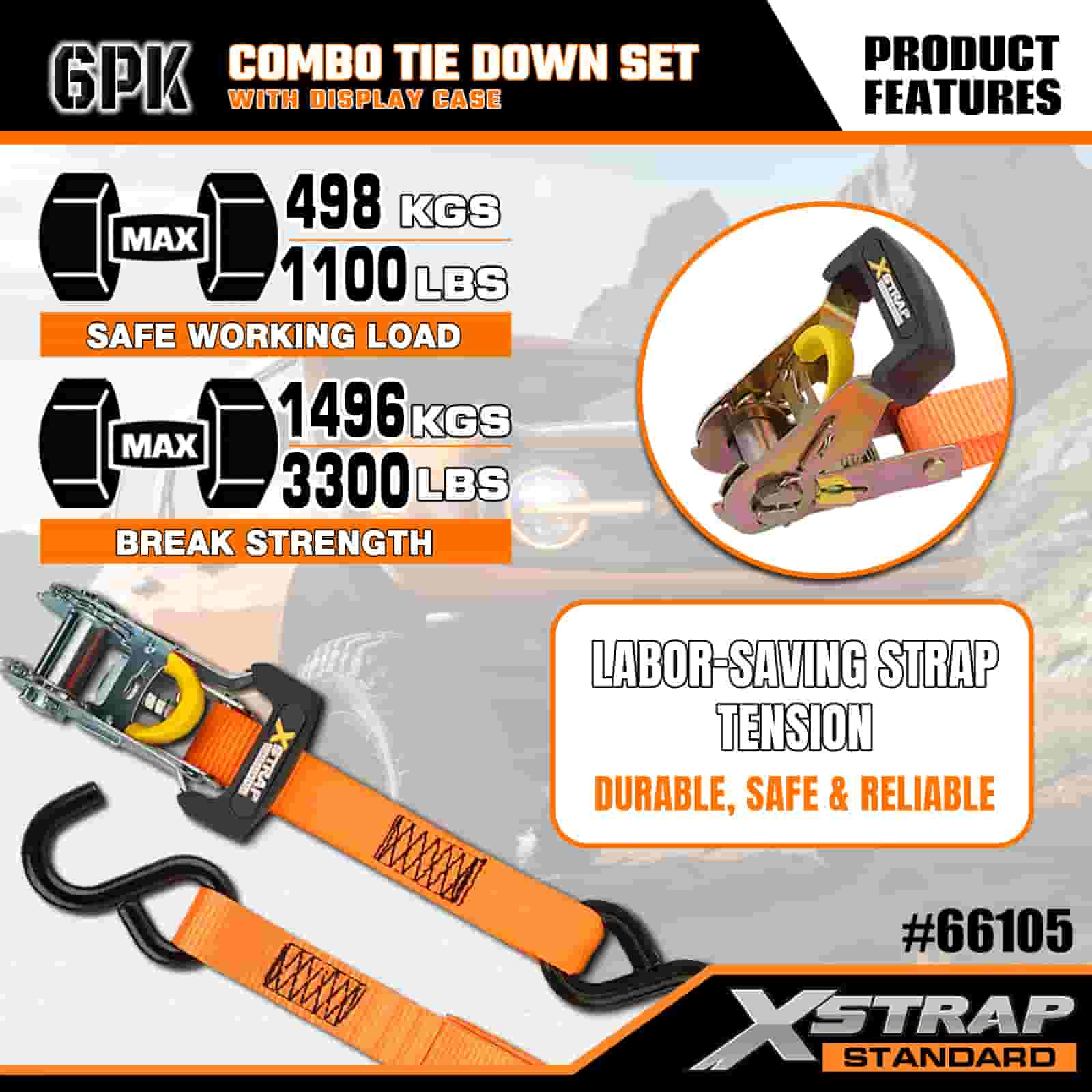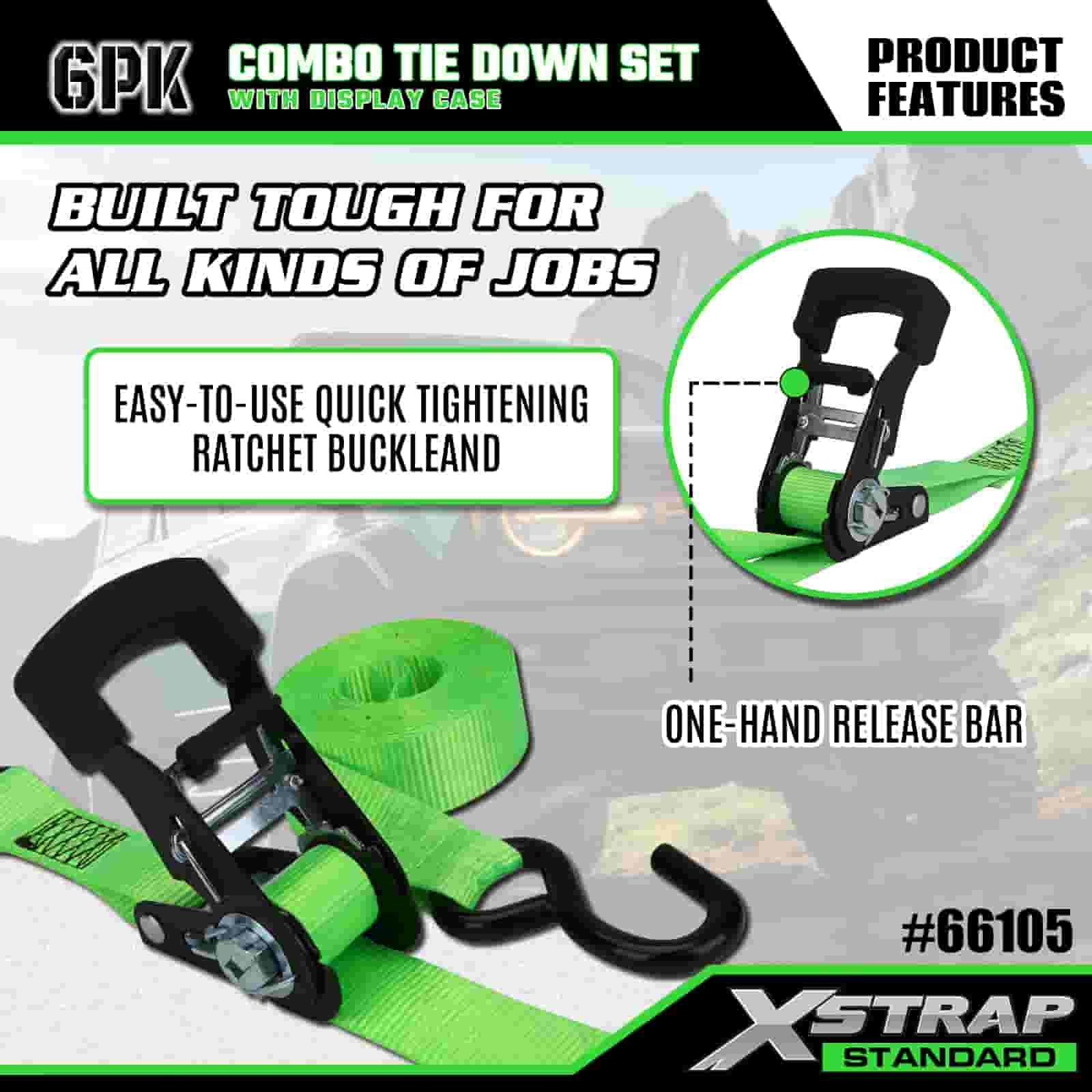 Xstrap 6 szt. Aluminiowych zapadkowych pasów do mocowania, 1” x 14’ i 1” x 10’ poliestrowych pasów mocujących. Pociągany pasek zapadkowy, o udźwigu 500 funtów i 1100 funtów. Pasy zabezpieczające do mocowania ładunku z hakami S do kontroli ładunku Pickup, SUV, Samochody na bagażnikach Motocykle.