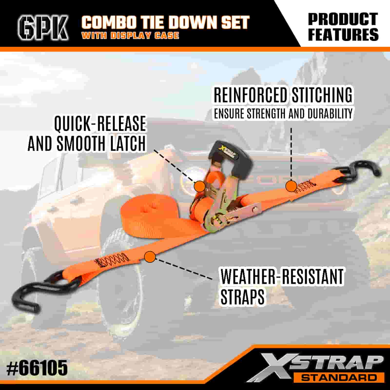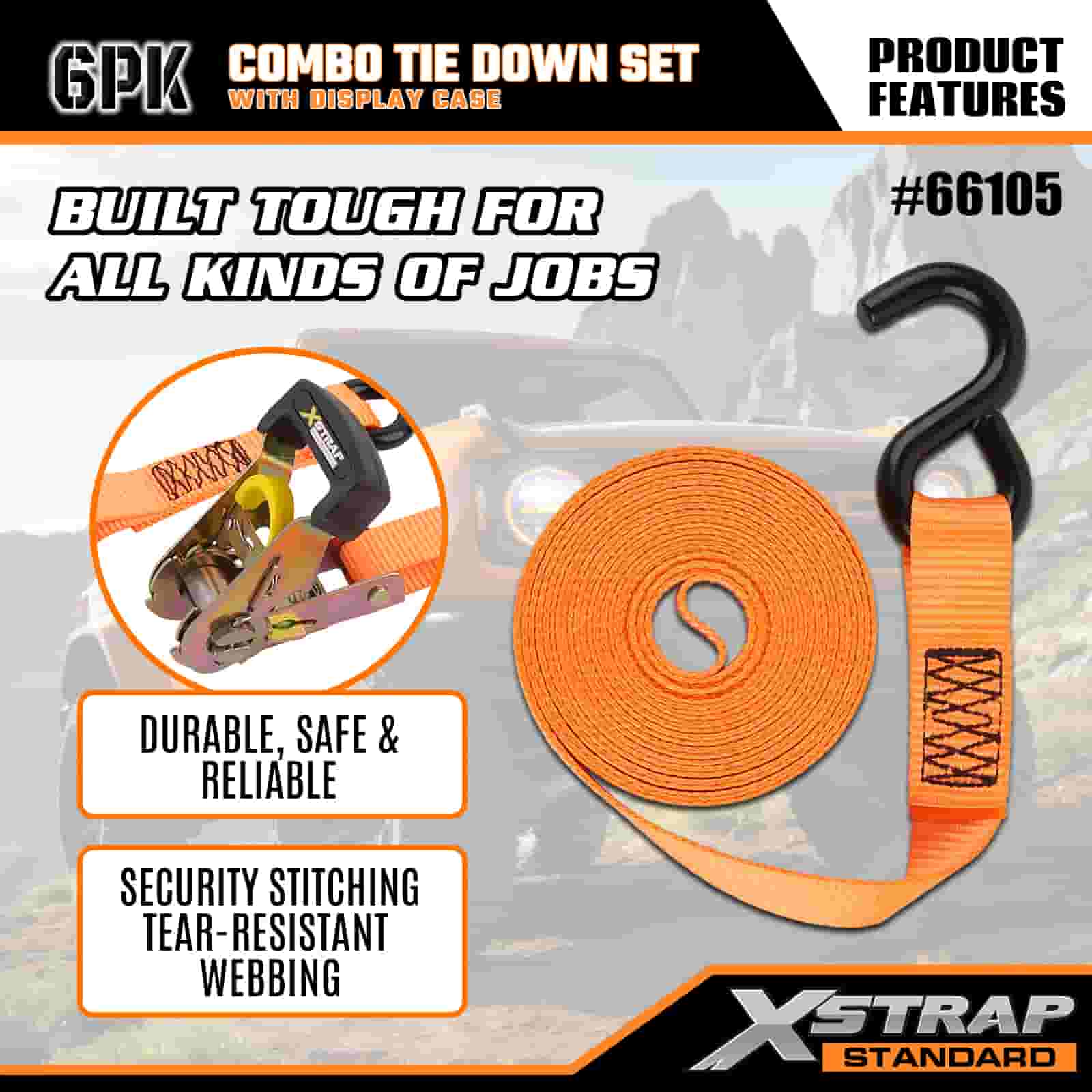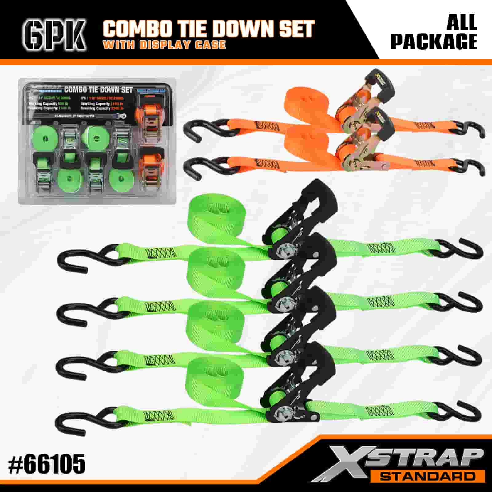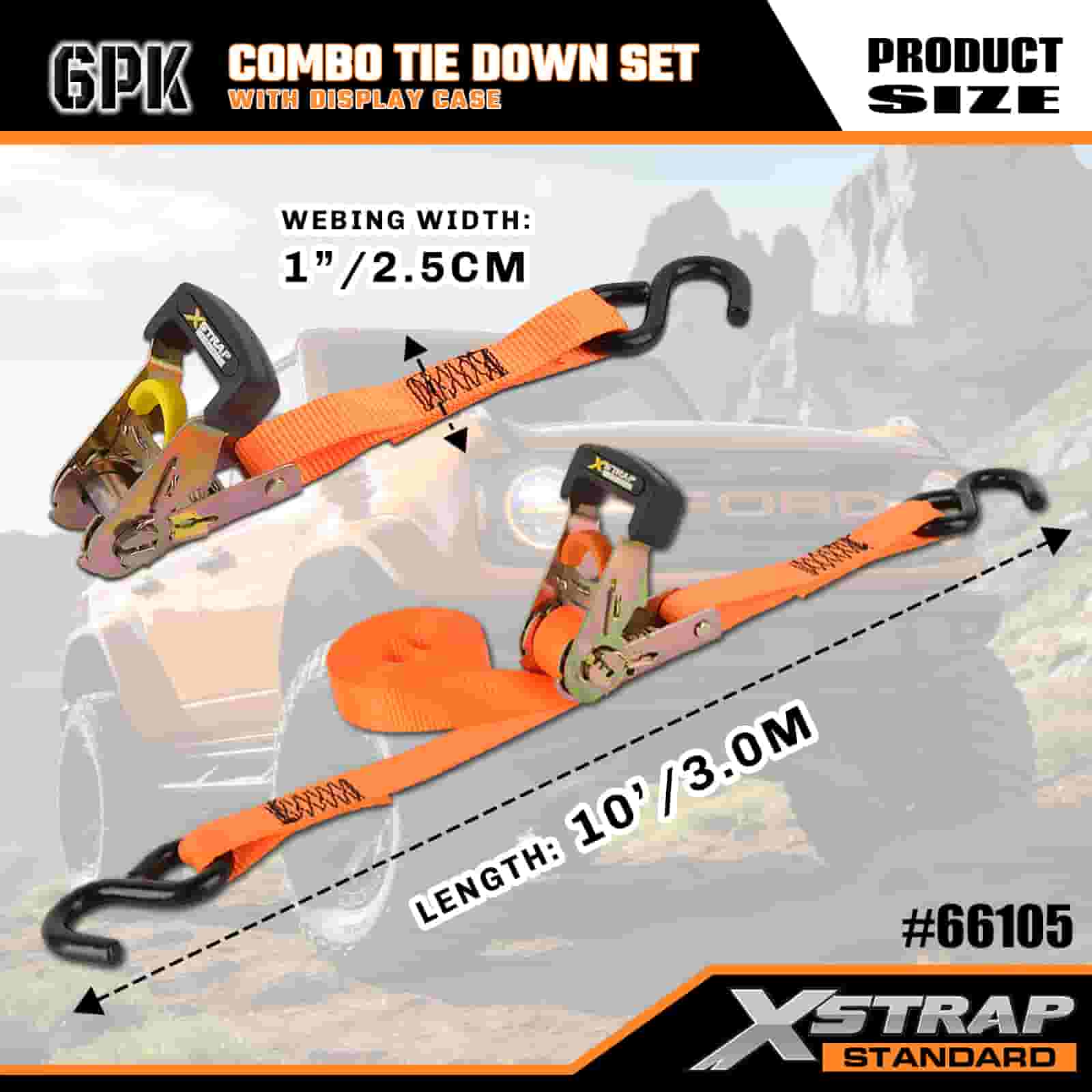 Xstrap 6 szt. Aluminiowych zapadkowych pasów do mocowania, 1” x 14’ i 1” x 10’ poliestrowych pasów mocujących. Pociągany pasek zapadkowy, o udźwigu 500 funtów i 1100 funtów. Pasy zabezpieczające do mocowania ładunku z hakami S do kontroli ładunku Pickup, SUV, Samochody na bagażnikach Motocykle.