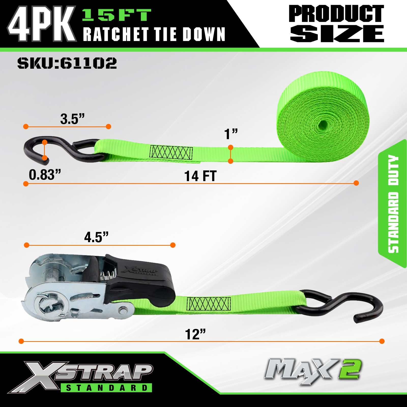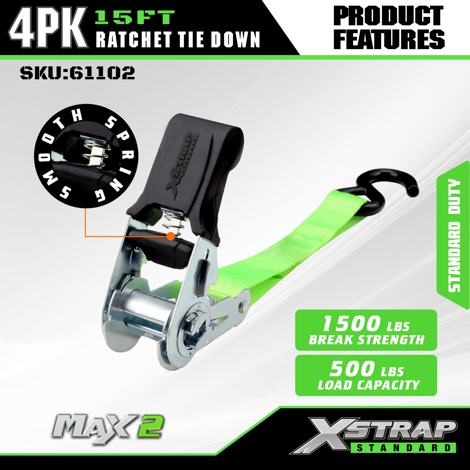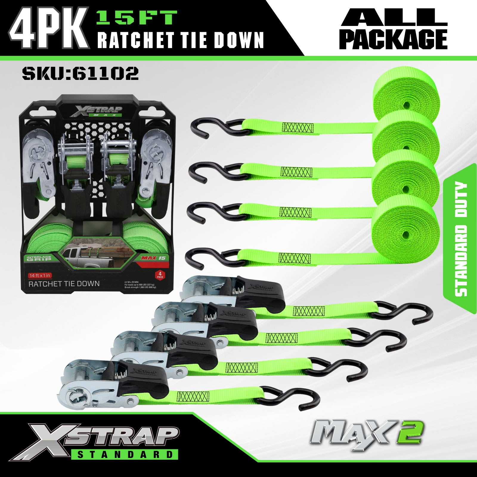 Paski do mocowania zapadkowego Xstrap 4 sztuki 15 stóp - 500 funtów Nośność 1500 funtów Wytrzymałość na zerwanie - pasy cargo do urządzeń ruchomych, sprzętu do pielęgnacji trawników i motocykli.