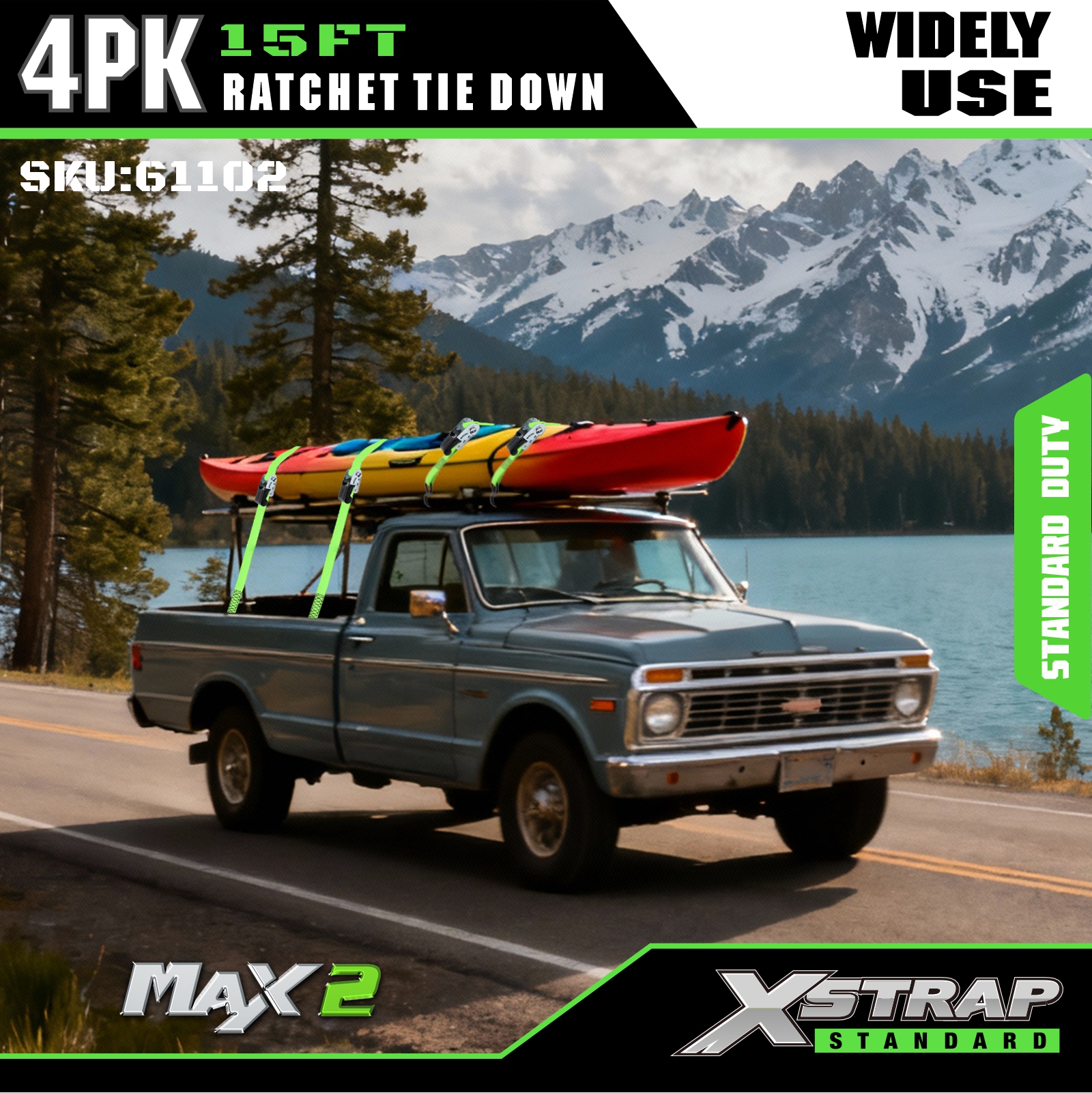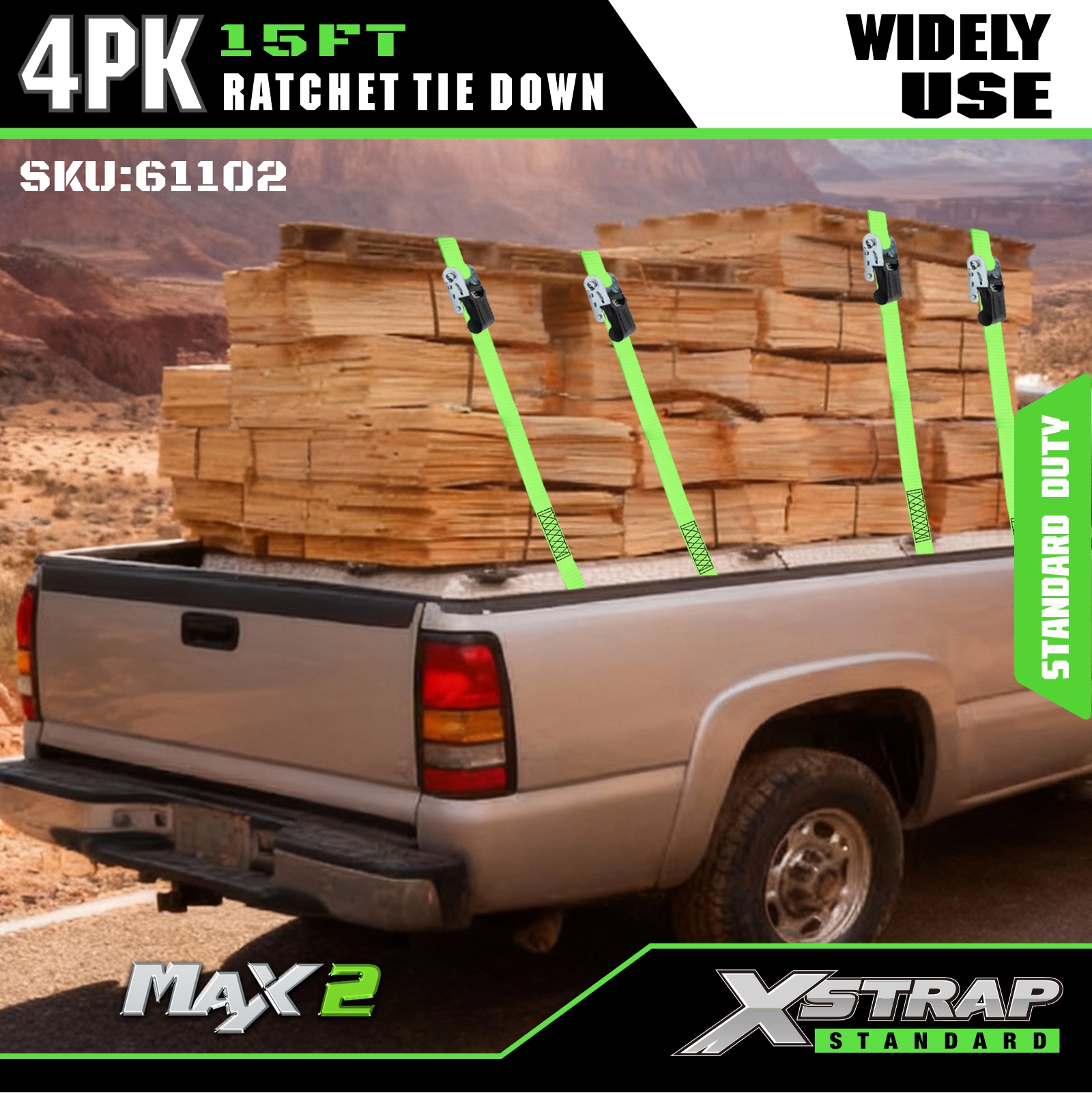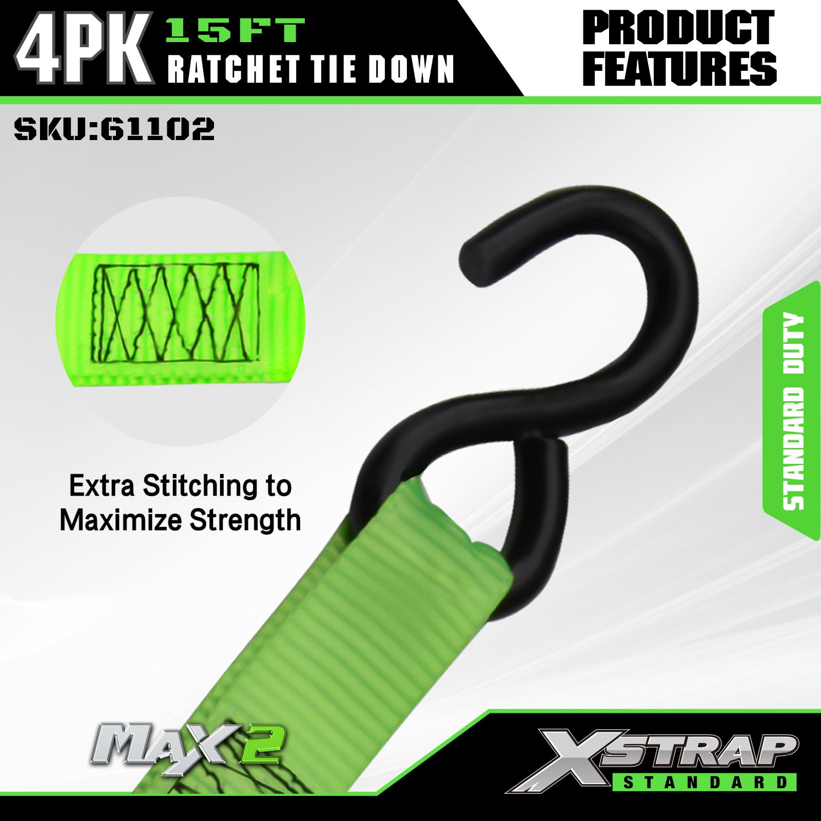 Paski do mocowania zapadkowego Xstrap 4 sztuki 15 stóp - 500 funtów Nośność 1500 funtów Wytrzymałość na zerwanie - pasy cargo do urządzeń ruchomych, sprzętu do pielęgnacji trawników i motocykli.
