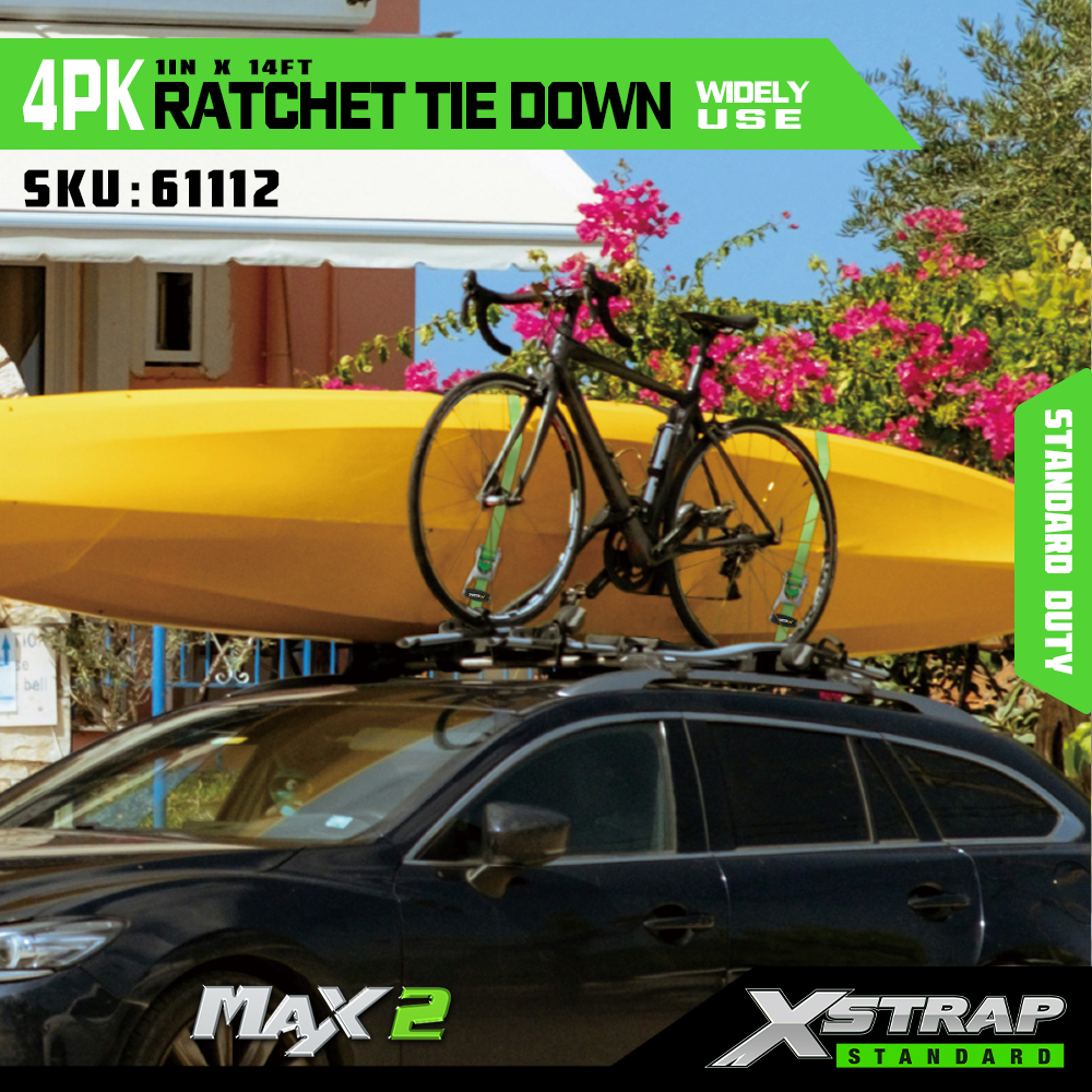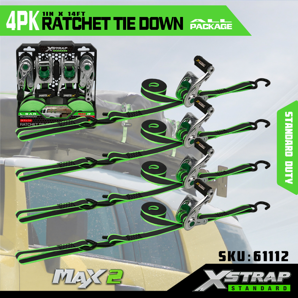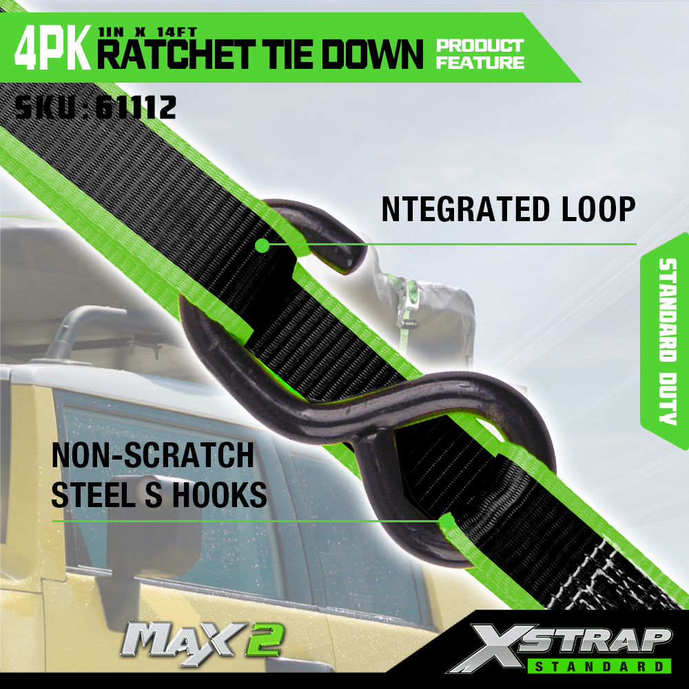 Xstrap Zestaw 4 pasków zapadkowych z otwartym uchwytem, poliestrowy pasek zapadkowy 1" x 14 cali z miękką pętlą, udźwig 1500 funtów (500 funtów) Pasy zabezpieczające do mocowania ładunku z aluminiową grzechotką i hakami S do ładunku, ciężarówki, kosiarki i quadów