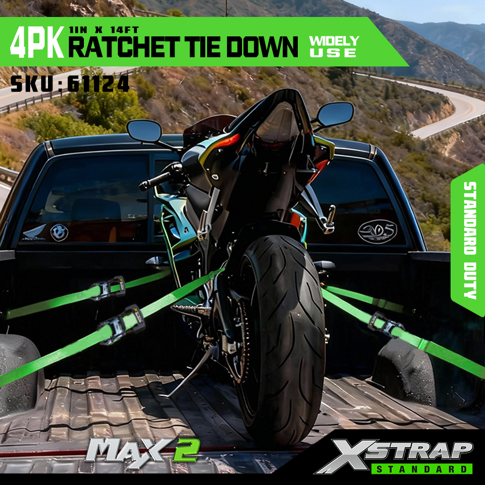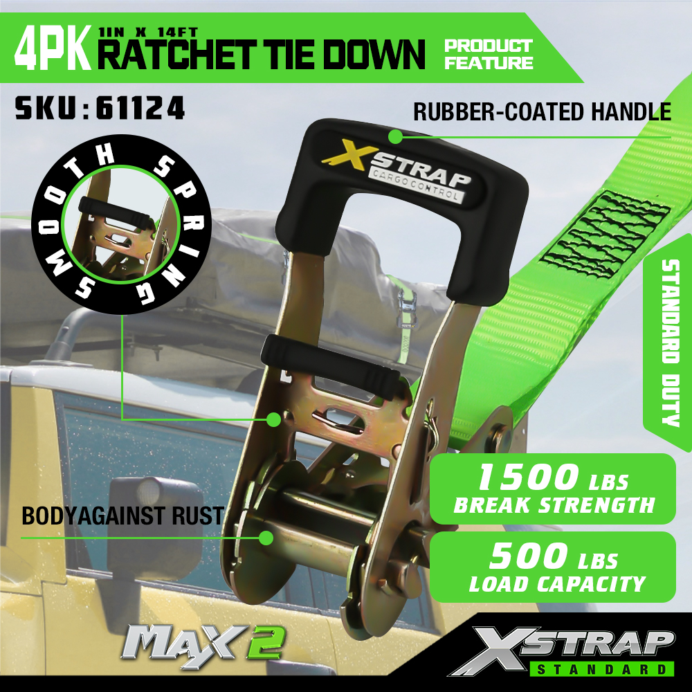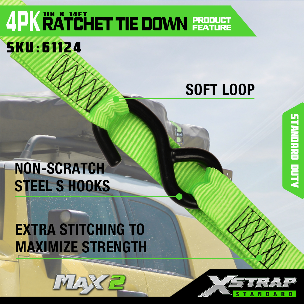 Xstrap Zestaw 4 pasów do mocowania ładunku z grzechotką, 1" x 14' poliestrowy pasek do mocowania z grzechotką z miękką pętlą, udźwig 1500 funtów (500 funtów) Pasy zabezpieczające do mocowania ładunku z metalową grzechotką i hakami S do ładunku, ciężarówki, kosiarki i quadów.
