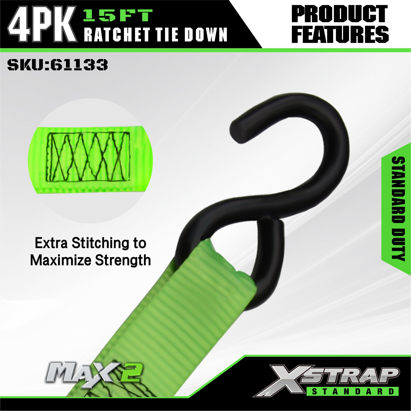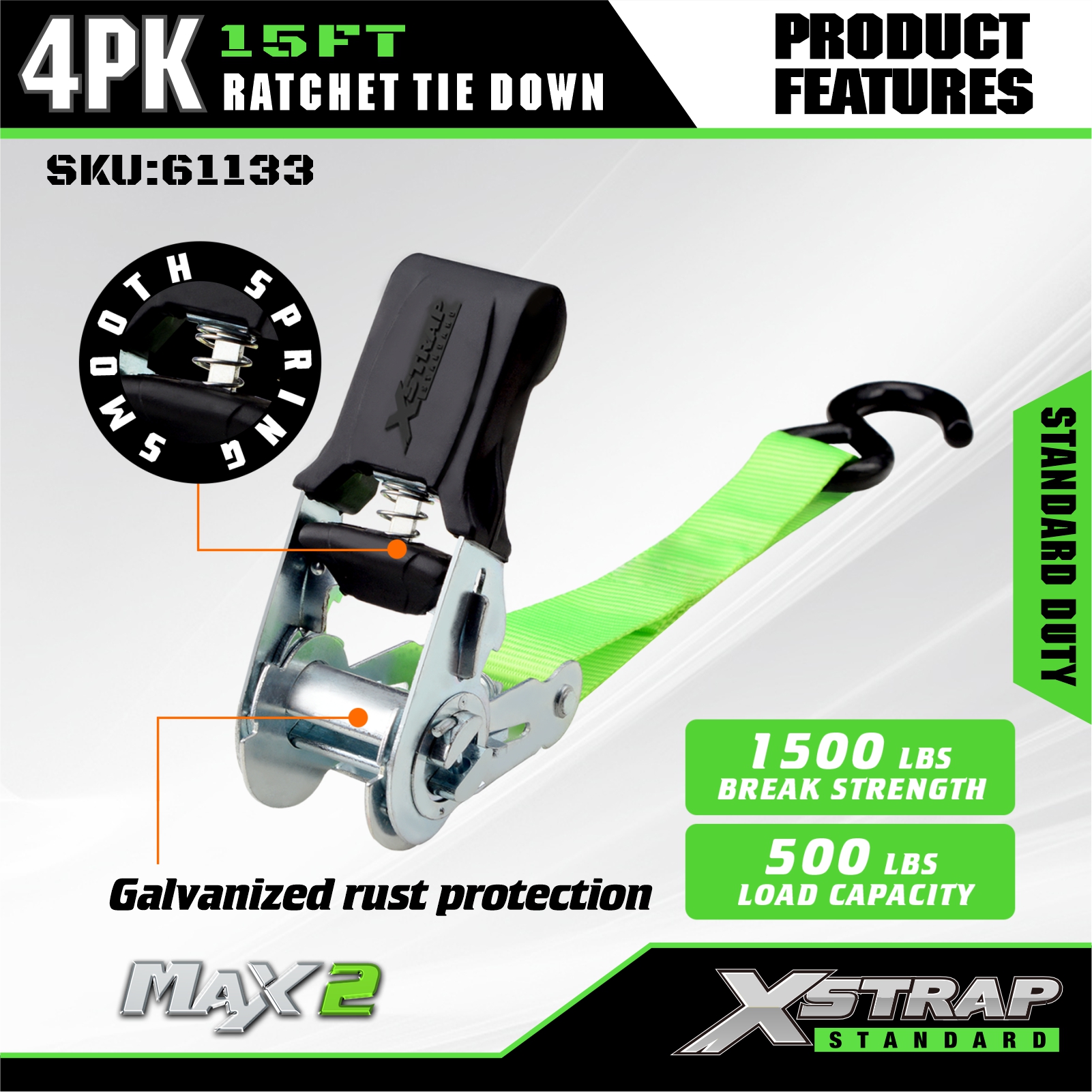 - Płynny mechanizm zapadkowy ze sprężyną: wyposażony w responsywny system zapadki ze wspomaganiem sprężynowym, który umożliwia szybkie i spójne napinanie bez sztywnej pracy, co ułatwia użytkownikom na każdym poziomie umiejętności szybkie zabezpieczenie ładunku.