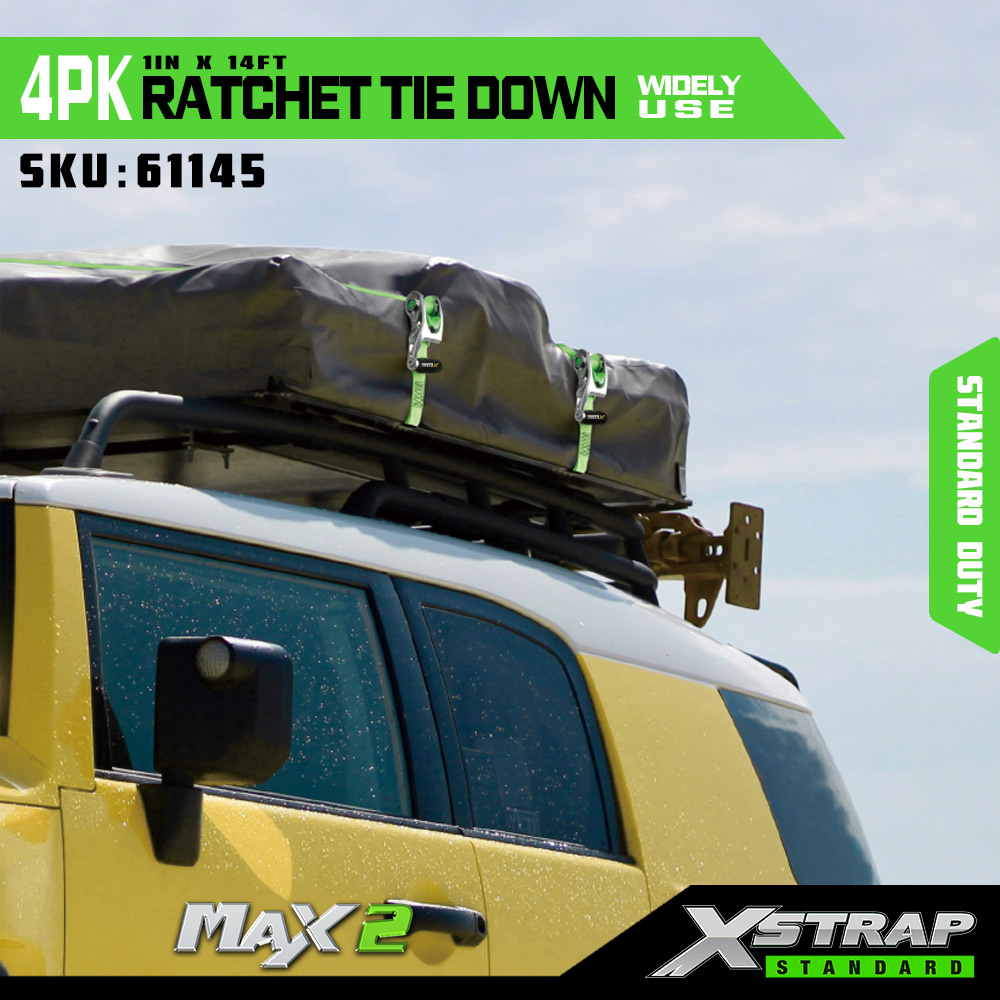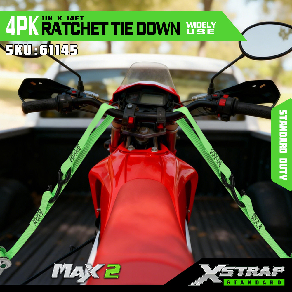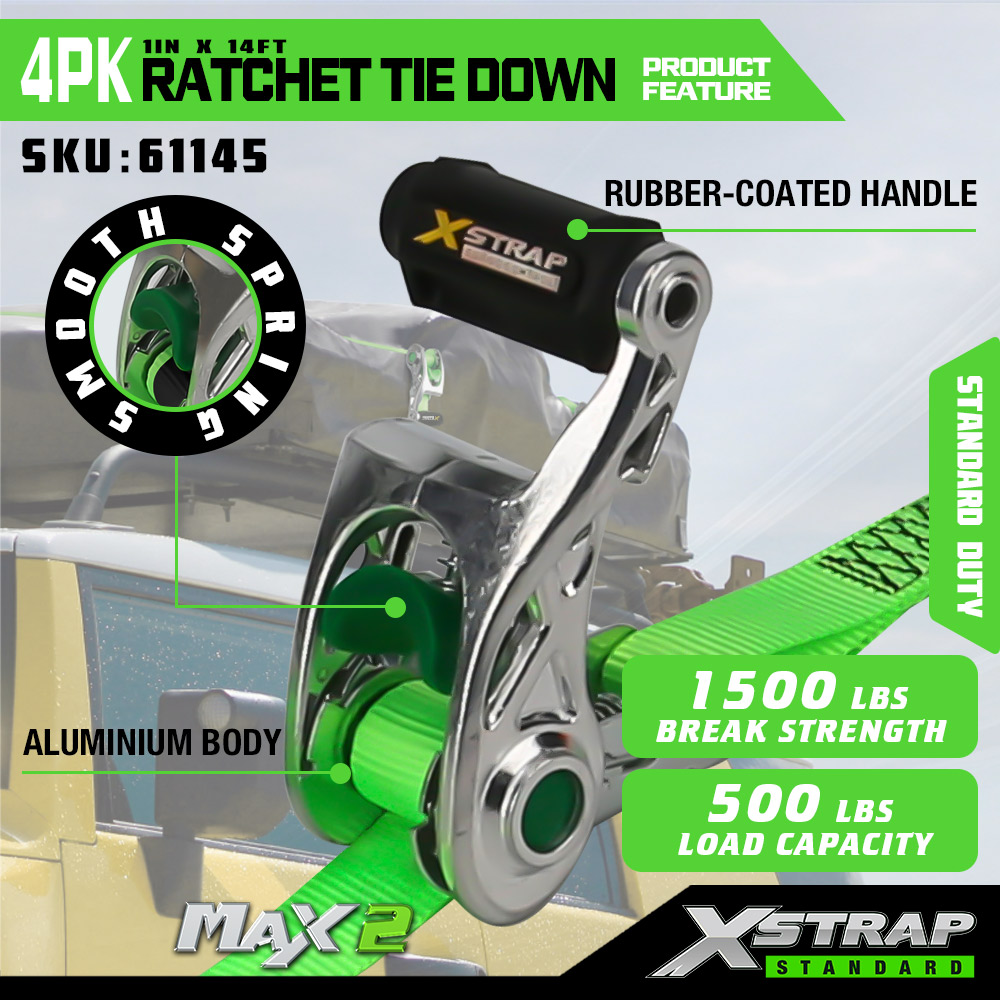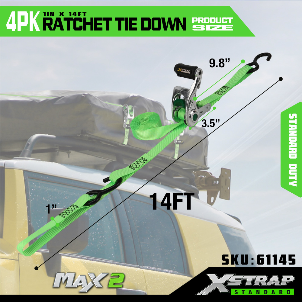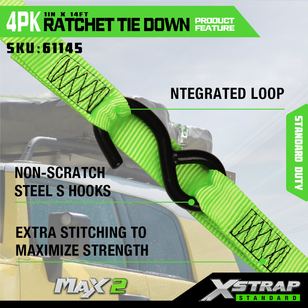 Xstrap 4-pakowy zestaw zapadkowy do mocowania ładunku z miękką pętlą, 1” x 14” poliestrowy pasek do mocowania, ciągniony pasek zapadkowy, pasy zabezpieczające do mocowania ładunku o udźwigu 1000 funtów z haczykami S do samochodów ciężarowych, SUV-ów i motocykli.