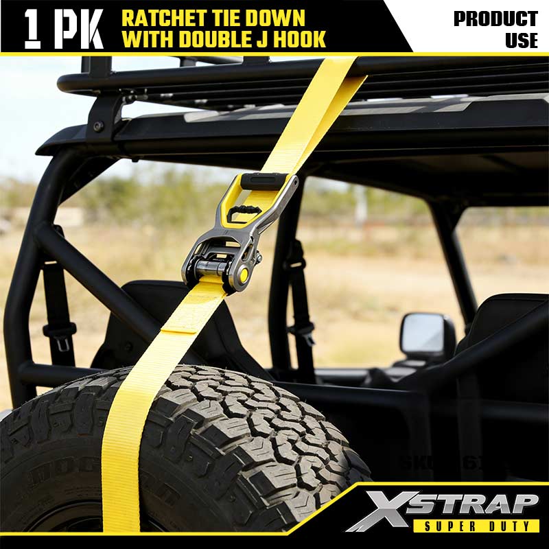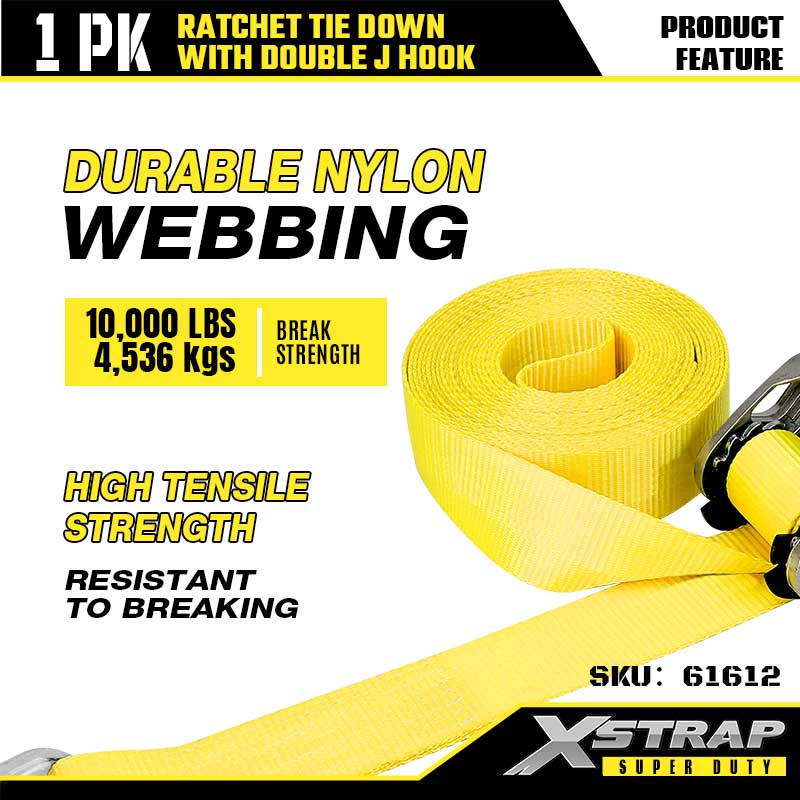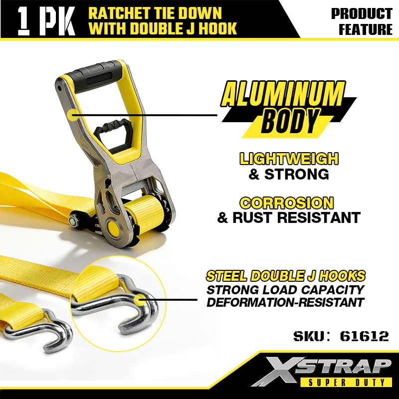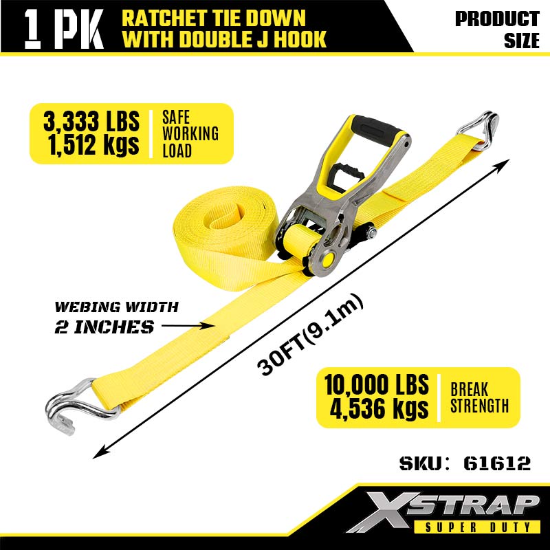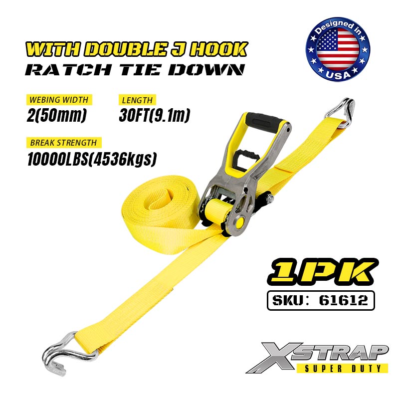 Xstrap 2PK Ratcet do mocowania za pomocą podwójnych haków J, 2” x 30 stóp poliestrowy pasek zapadkowy, udźwig 3333 funtów Pasy zabezpieczające do mocowania ładunku z podwójnymi hakami J do przyczep o dużej wytrzymałości, przyczep z płaską platformą, łodzi narciarskich, małych samochodów i ciężkiego sprzętu.