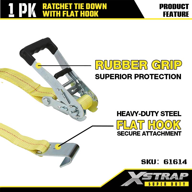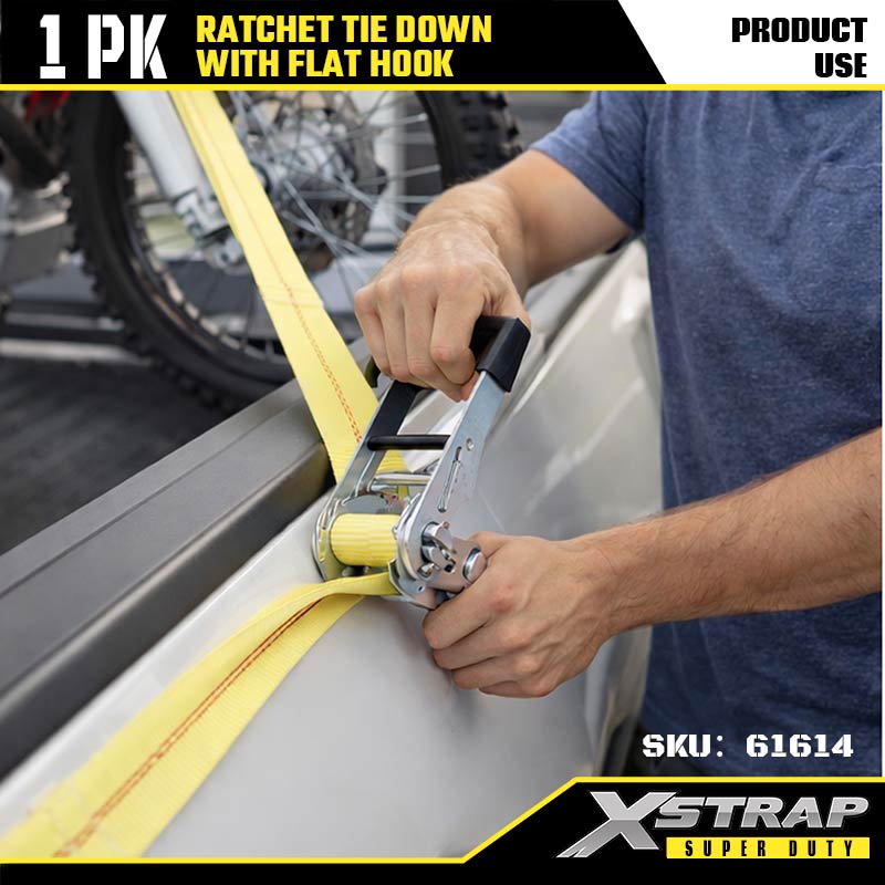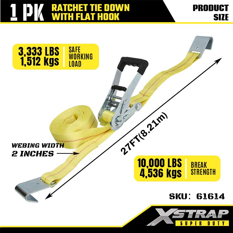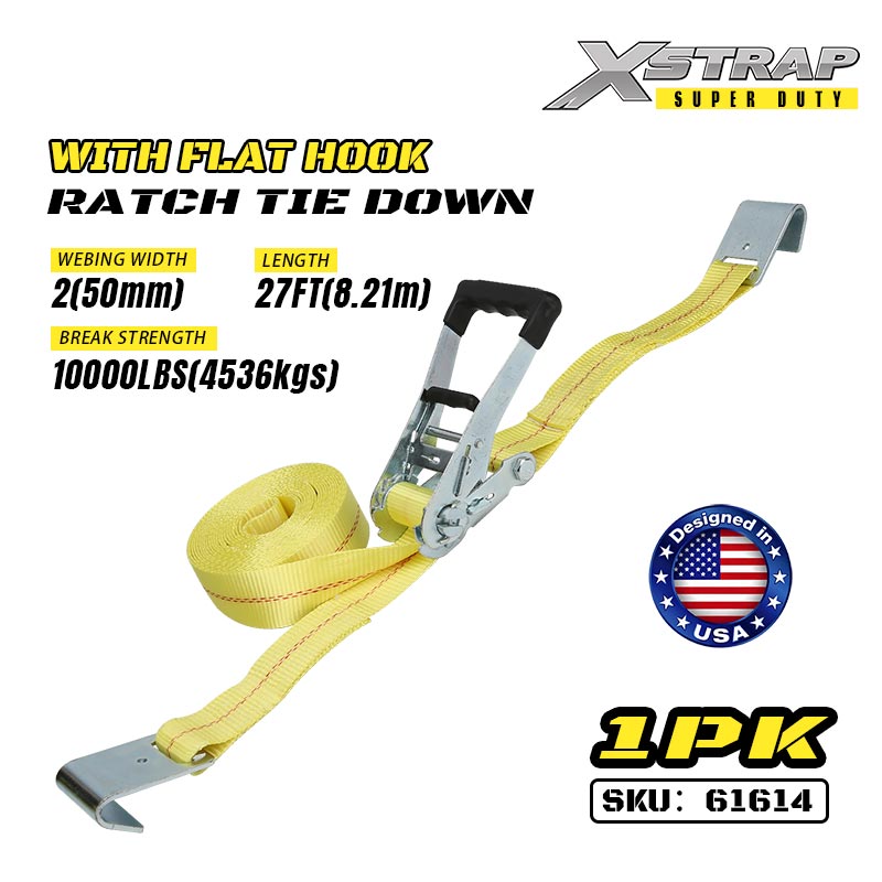 Xstrap Zapadkowe mocowanie za pomocą płaskich haczyków, poliestrowy pasek zapadkowy o wymiarach 2” x 27 stóp, pasy zabezpieczające ładunek o udźwigu 3333 funtów z płaskimi haczykami do przyczep o dużej ładowności, przyczepy z płaską platformą, łodzi narciarskiej, małego samochodu, ciężkiego sprzętu.