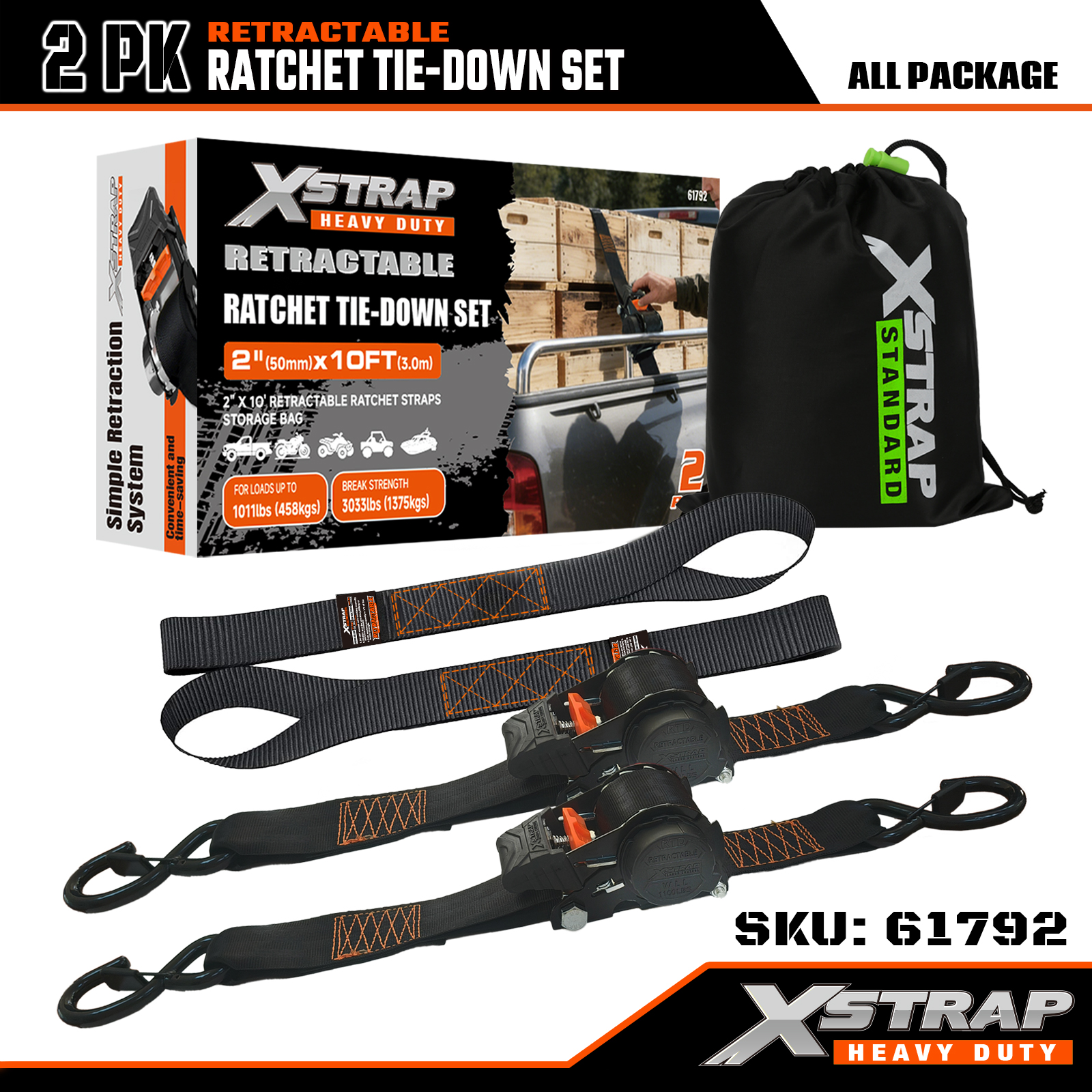 Xstrap 2PK Wysuwany zestaw do mocowania zapadkowego z hakami zabezpieczającymi S, poliestrowy pasek zapadkowy 2” x 10”, o udźwigu 1011 funtów Pasy zabezpieczające do mocowania ładunku z hakami zabezpieczającymi S do ciężarówki, przyczepy towarowej i motocykla.